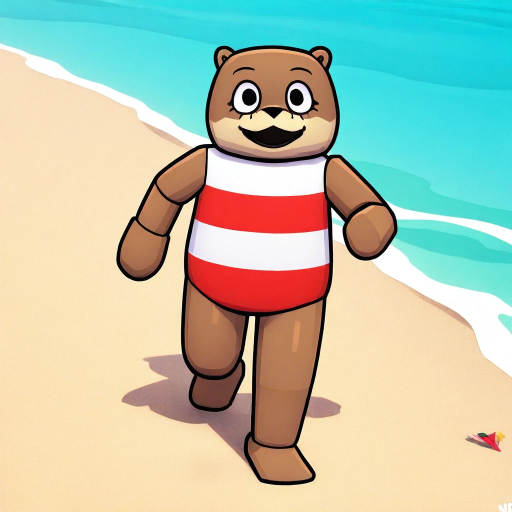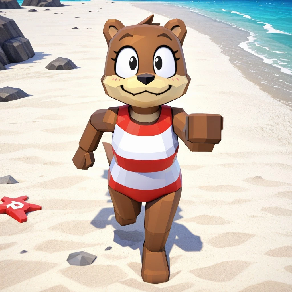female otter, brown fur, round eyes, red and white striped swimsuit, slightly blocky model,