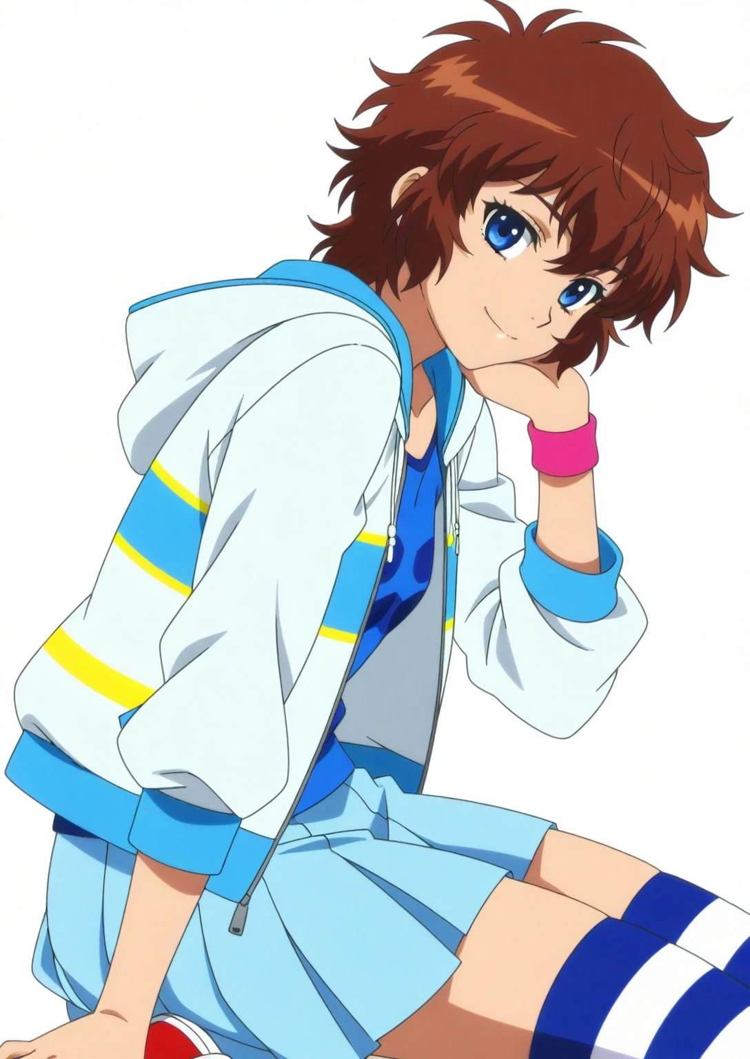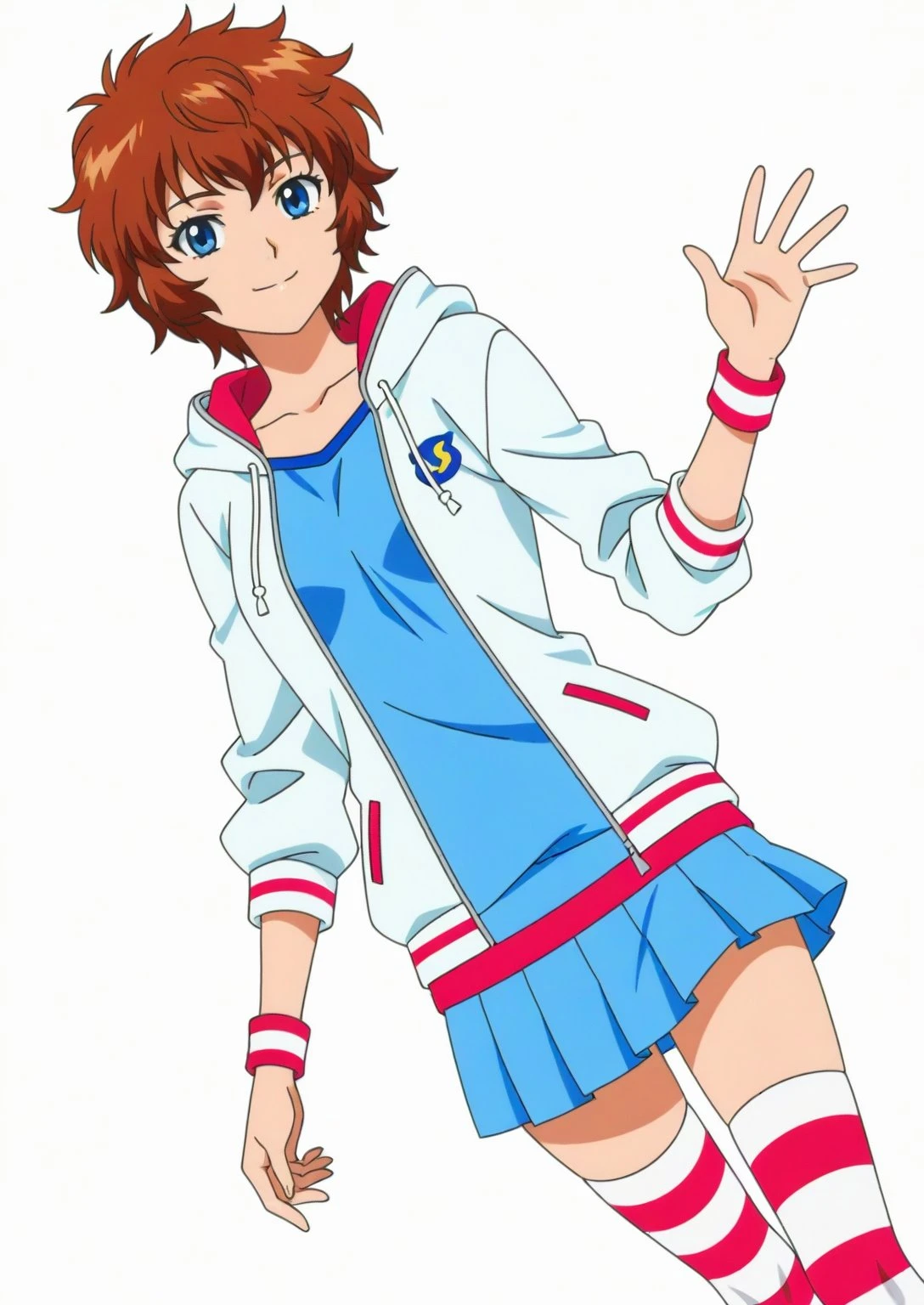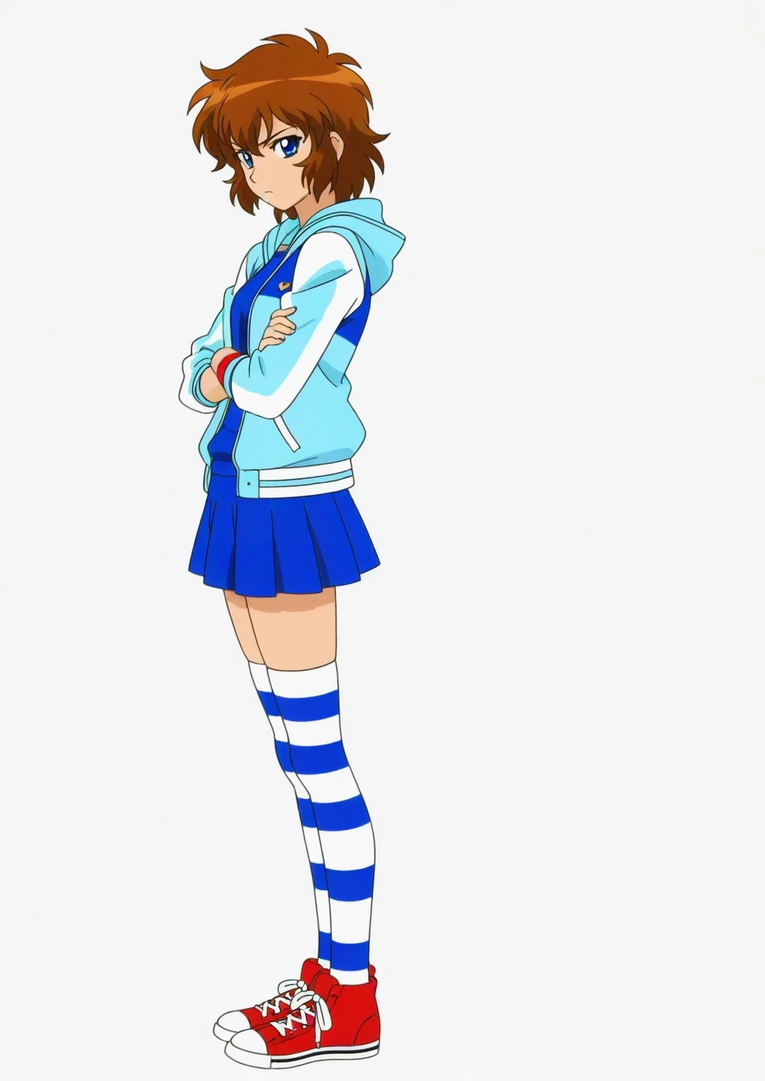 Option (sorry, poor quality): lynn-yacht, hood, jacket, blue shirt, hoodie, , hood down, hood jacket, crescent embrem, long sleeves, skirt, blue skirt, pleated skirt, wrist band, zettai ryouiki, red sneakers, , striped thighhighs, multicolored jacket