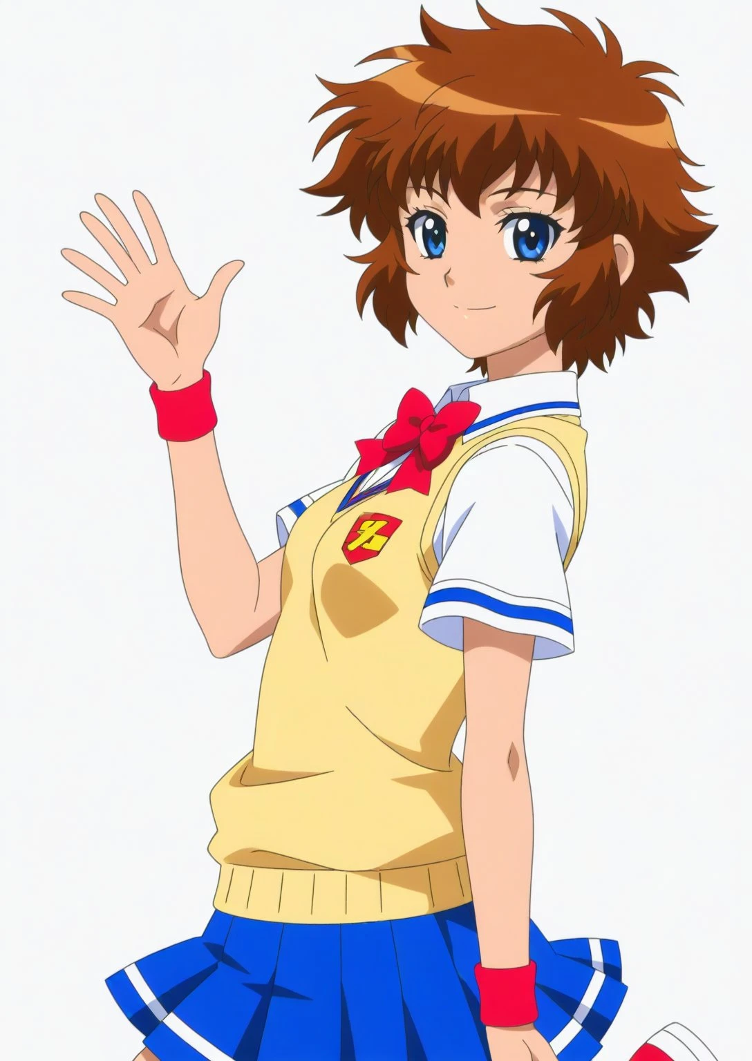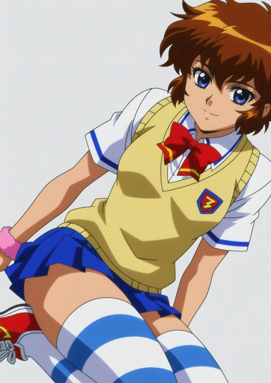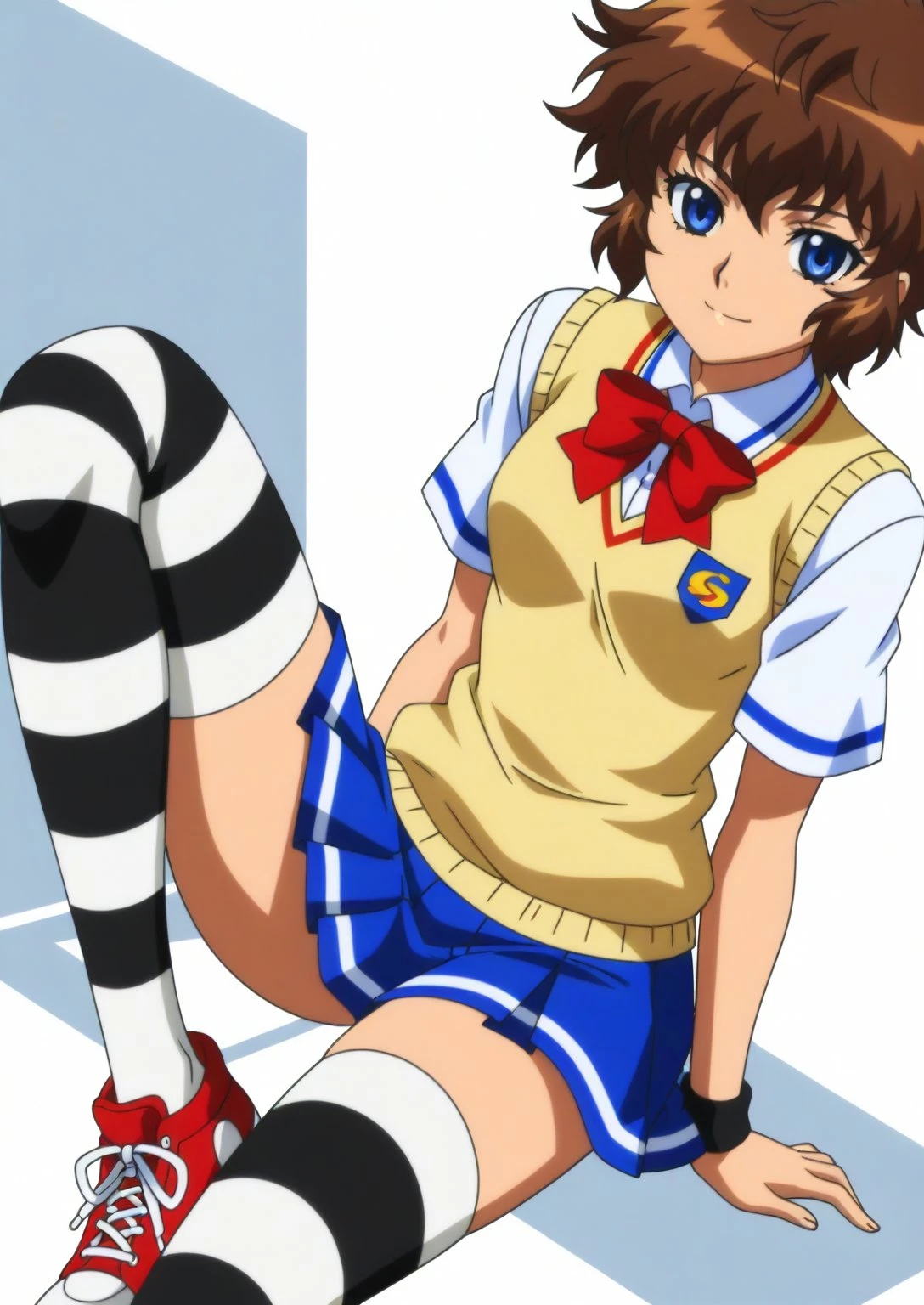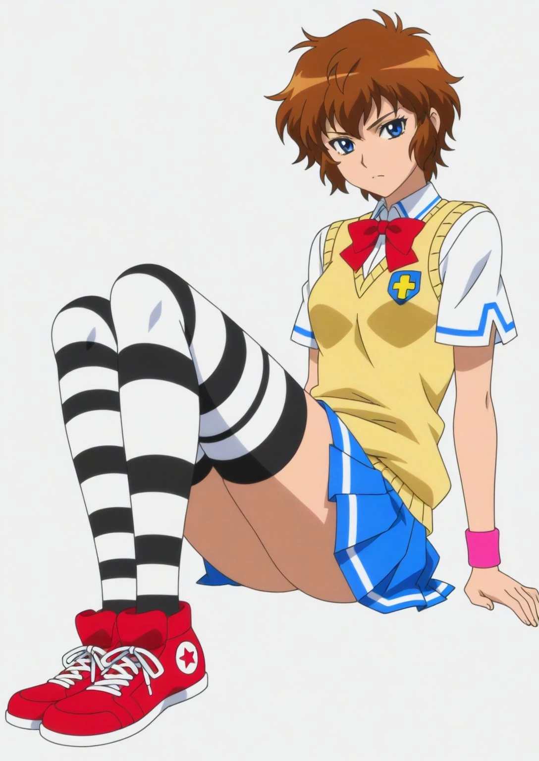 Outfit (school uniform): lynn-school, school uniform, bow, red bow, white shirt, bowtie, collared shirt, sweater vest, brown vest, drss shirt, wing collar, short sleeves, skirt, blue skirt, pleated skirt, wrist band, zettai ryouiki, red sneakers, , striped thighhighs