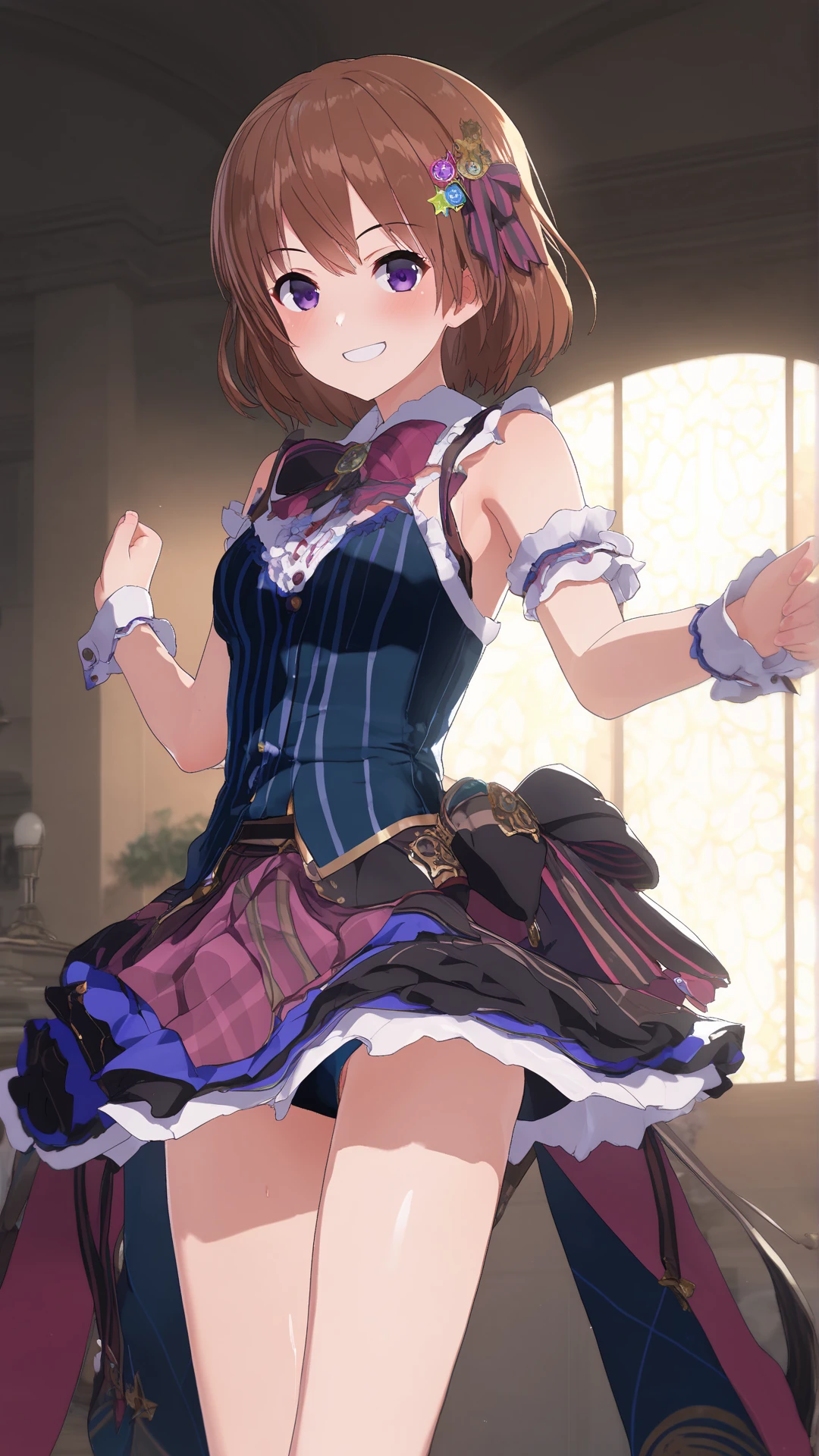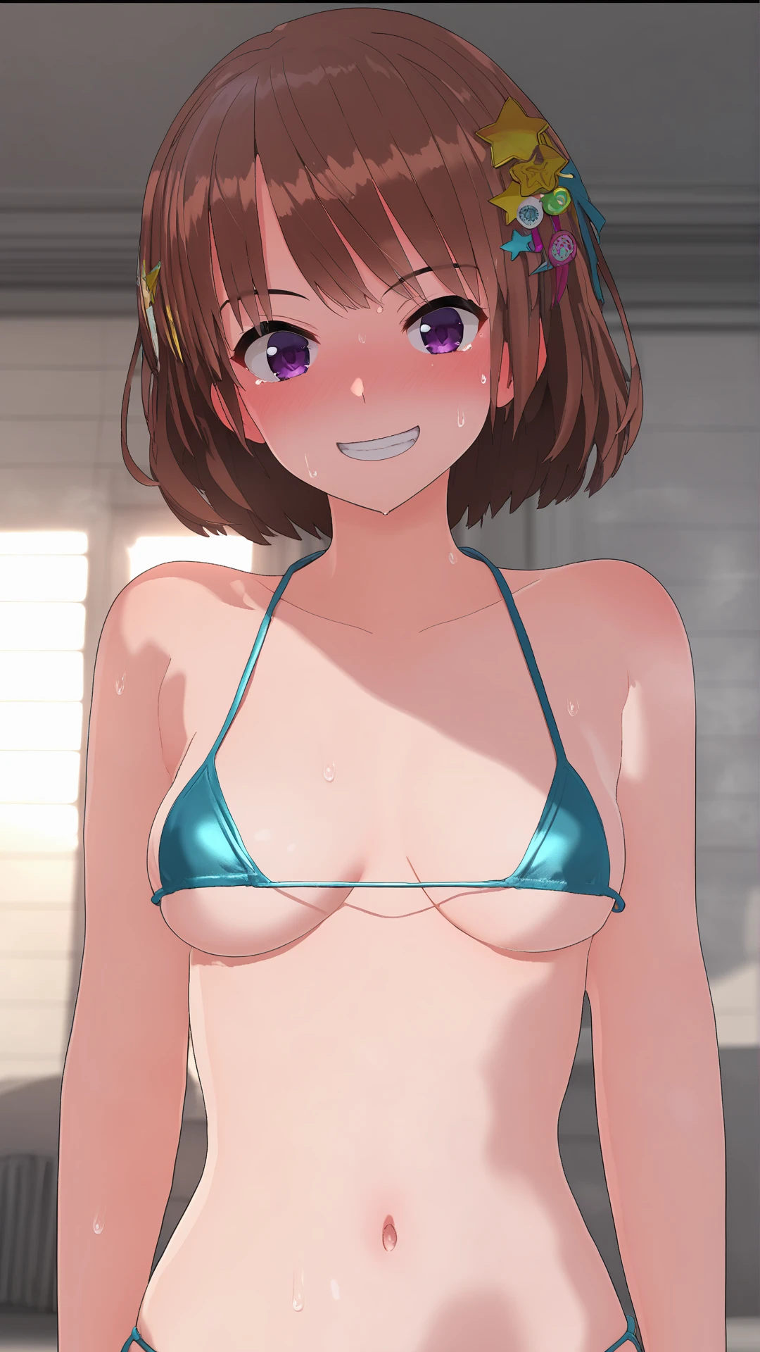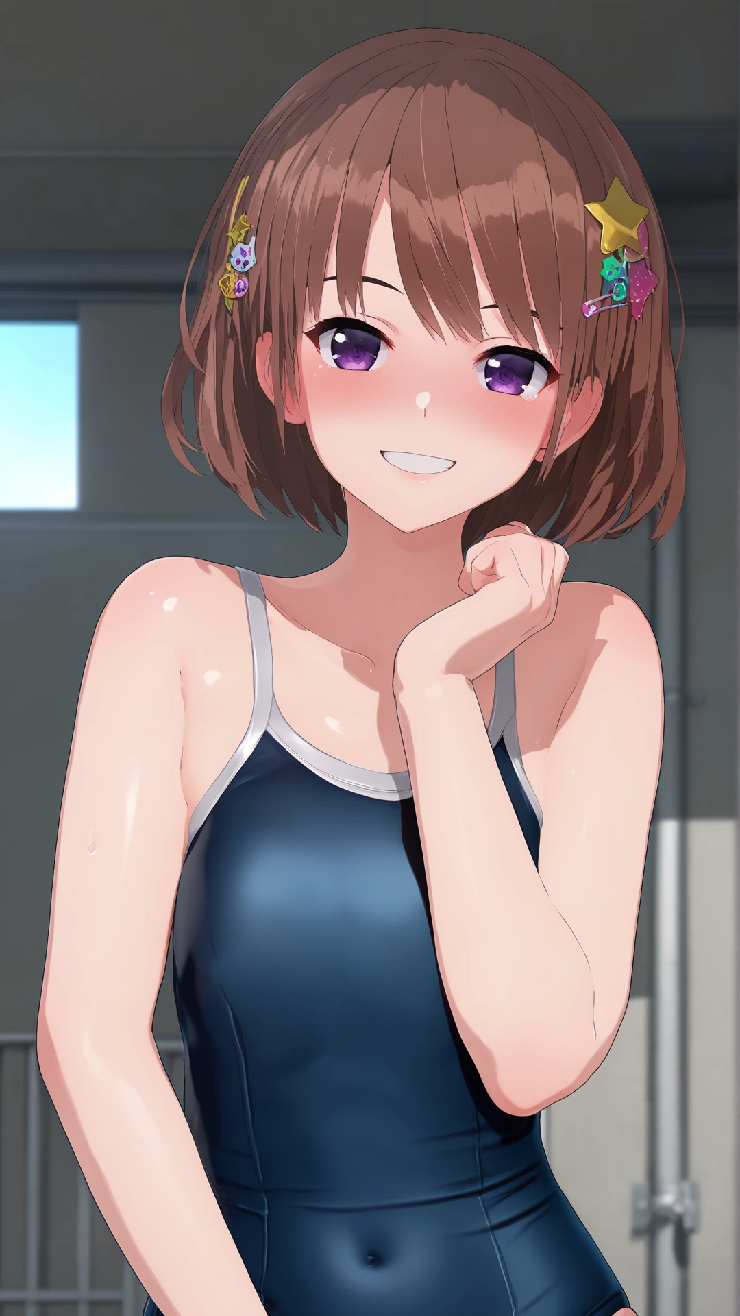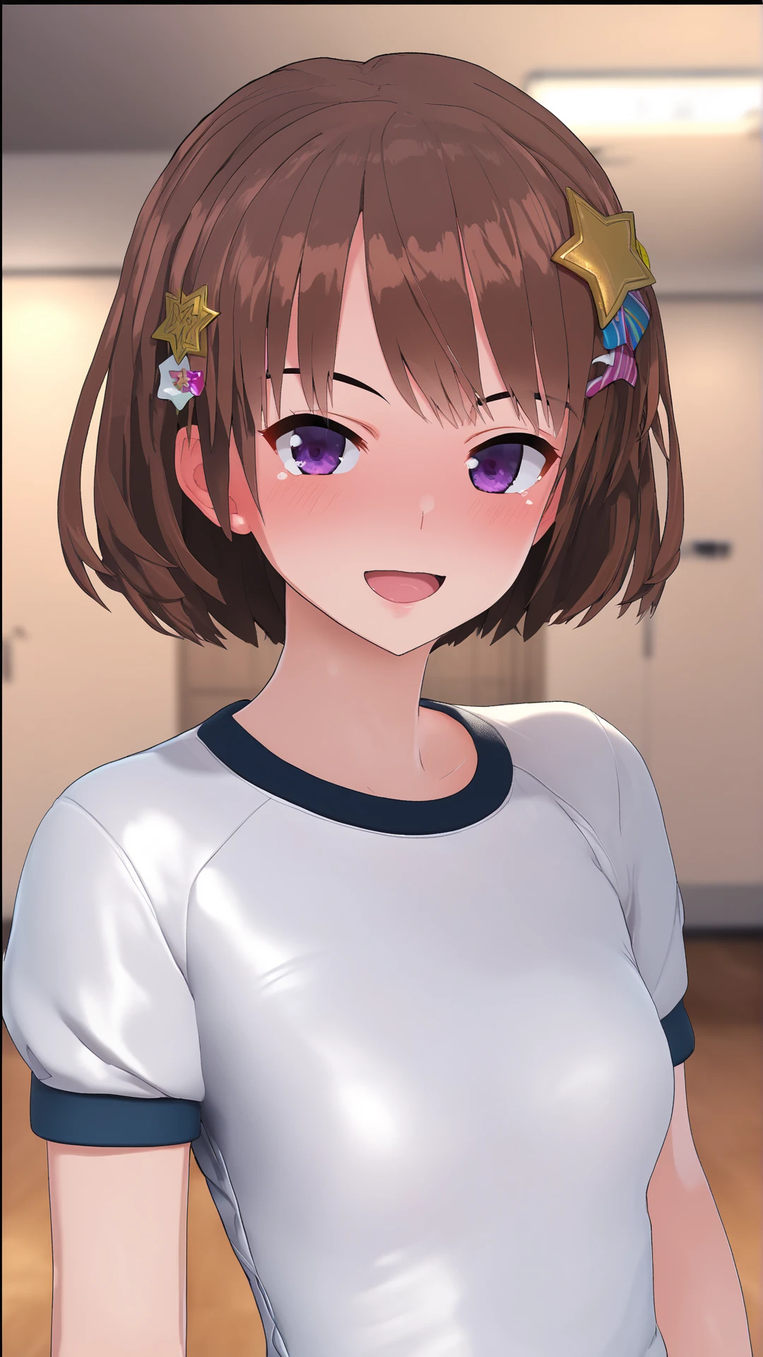 hochica, brown hair, short hair, star hair ornament, purple eyes