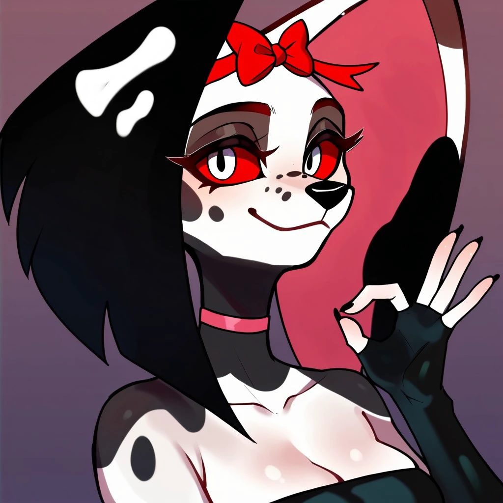 Positive Prompts: RuffetteHB, furry, anthro, canine, dalmatian, black body, white body, black body, black fur, two tone body, two tone fur, spotted body, spotted fur, black eyebrows, red sclera, white eyes, black nose, big ears, tail, red hair ribbon