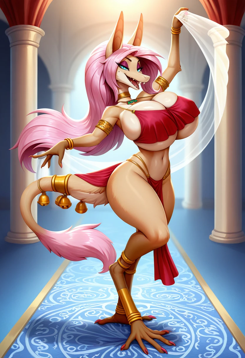 Outfit: makeup, jewelry, bracelet, pelvic curtain, midriff, tail jingle bells, crimson clothes OR pink clothes, covered nipples