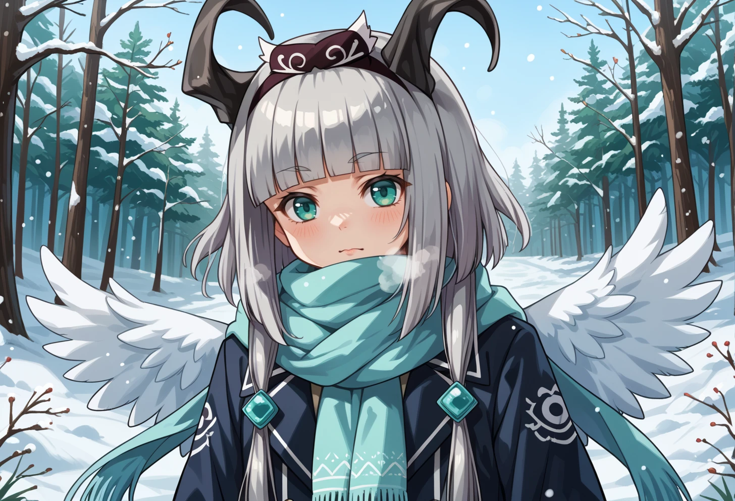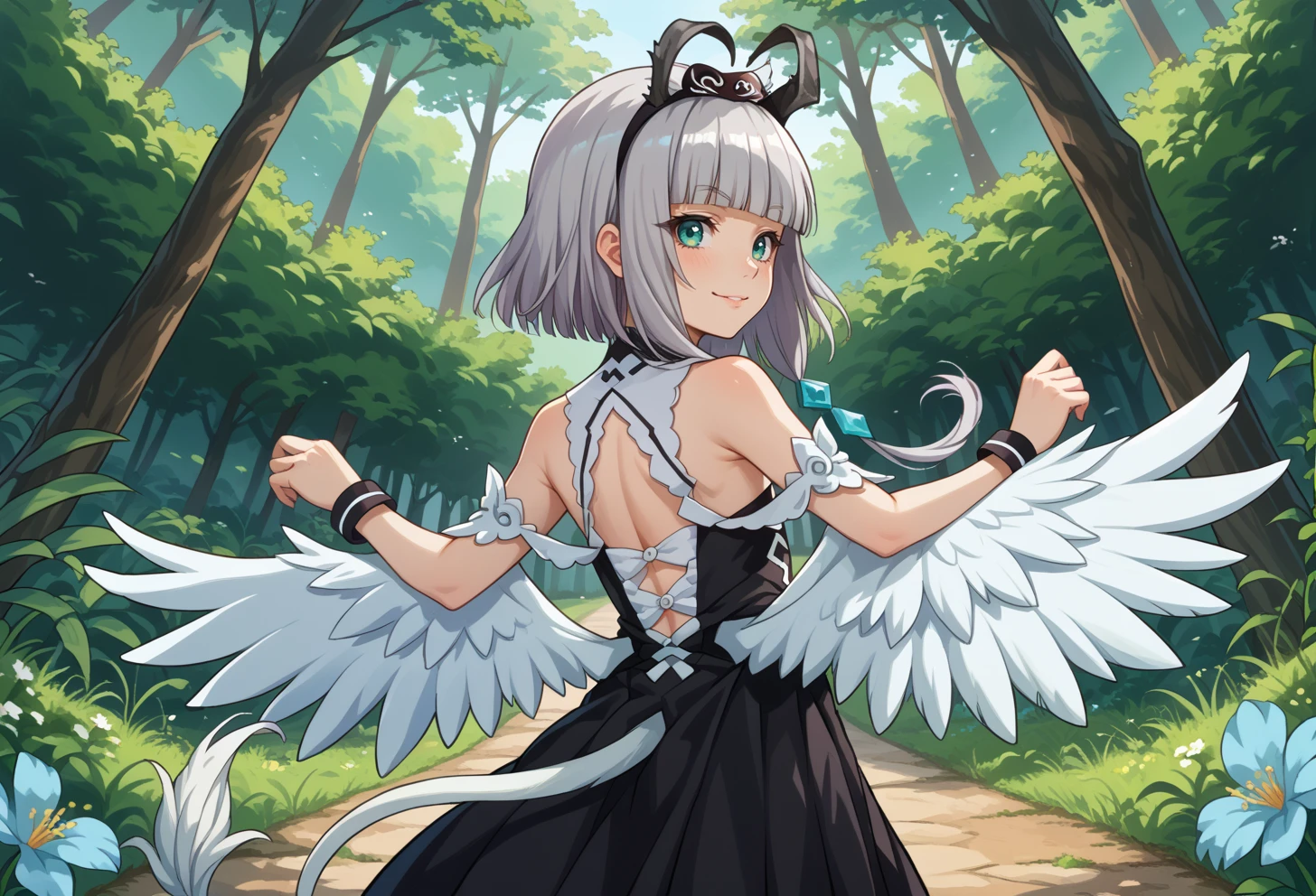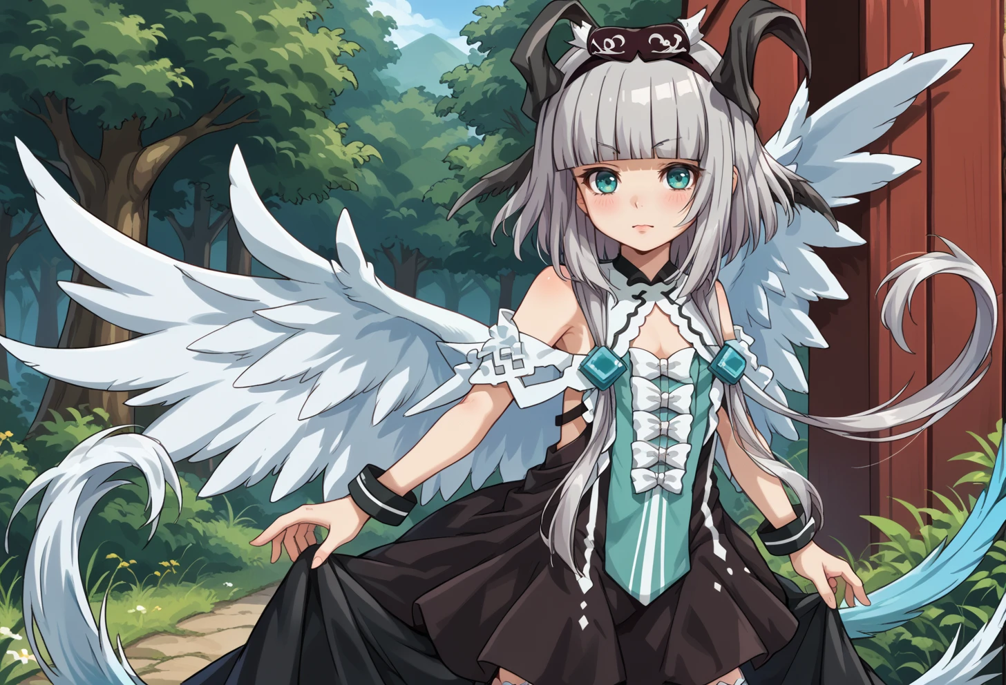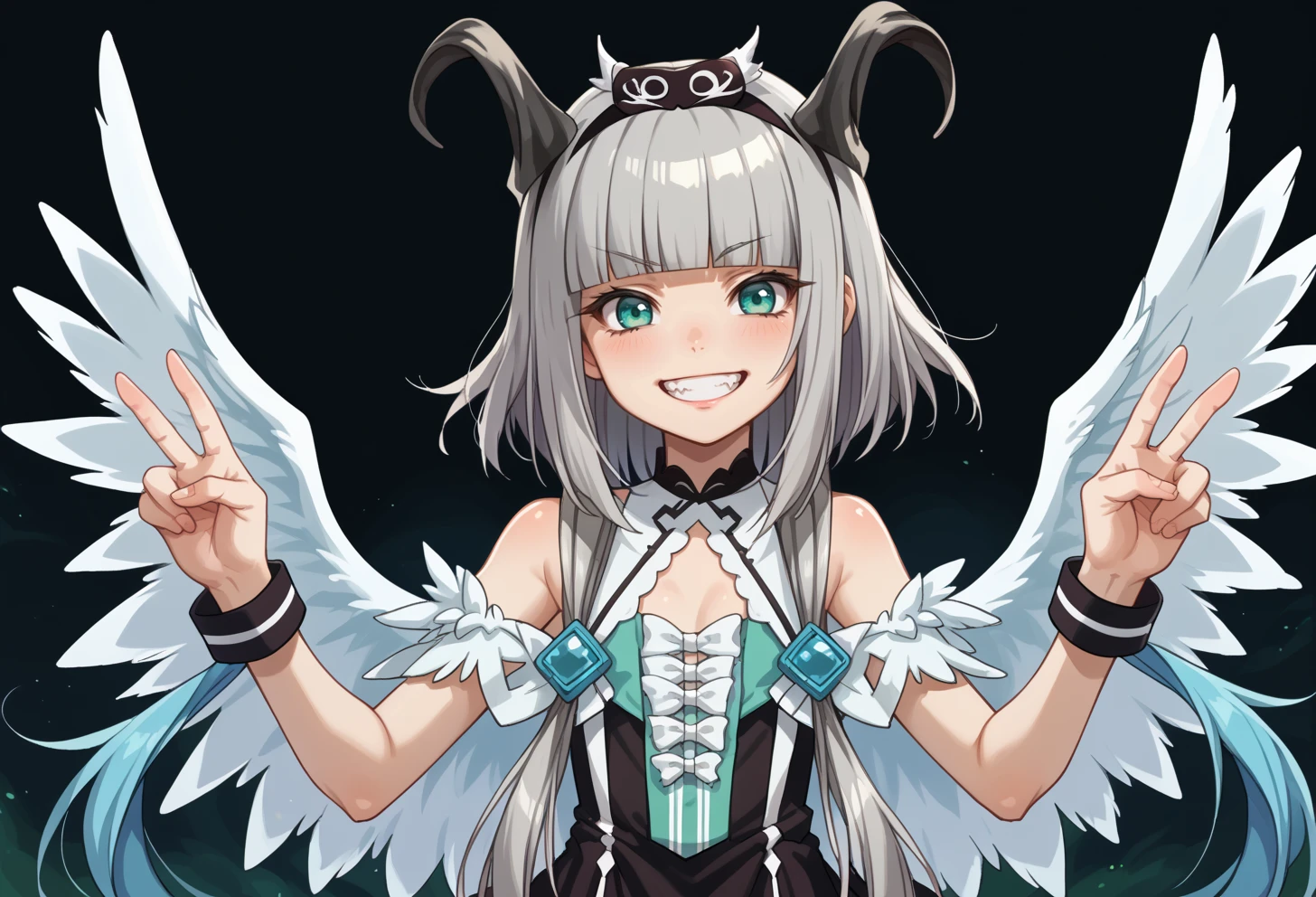 teal eyes, grey hair, blunt bangs, short hair with long locks, black horns, tail, White wings, Outfit: