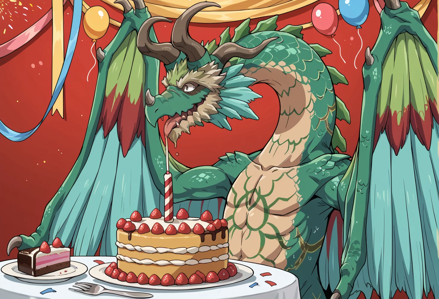 feathered wings, tail, green scales, green wings, red wings, facial hair, wyvern, horns,NEGATIVES: