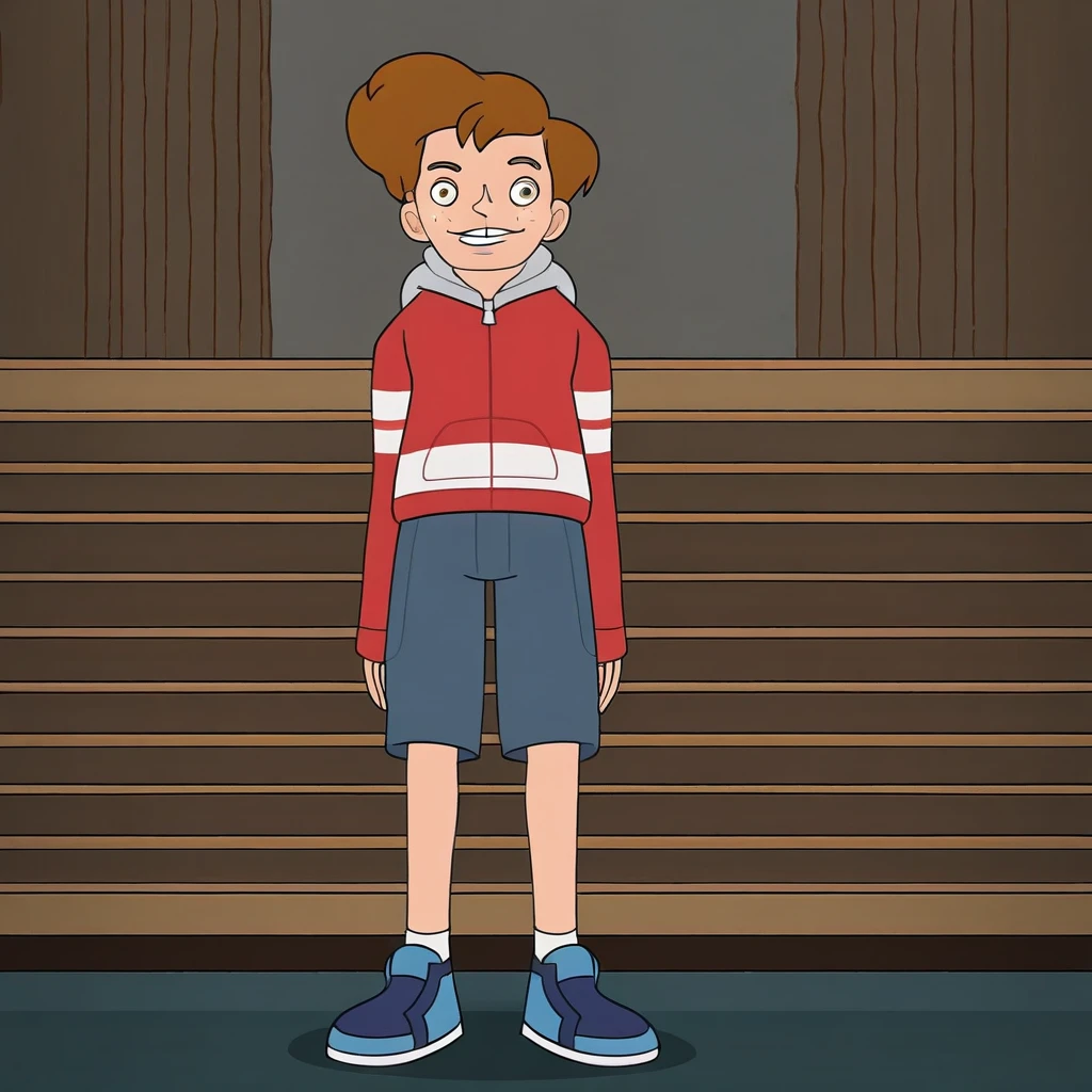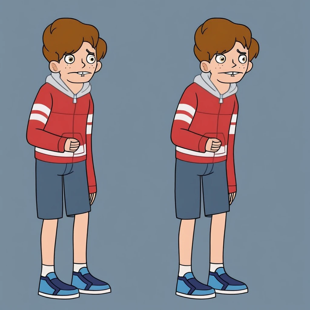 BenFreeling, 1boy, solo, male teen, Ben hair Style, brown hair, fair skin, brown eyes, freckles, gap tooth, thin and tall body, red zip hoodie, light gray hood, blue shorts, white socks, blue sneakers,
