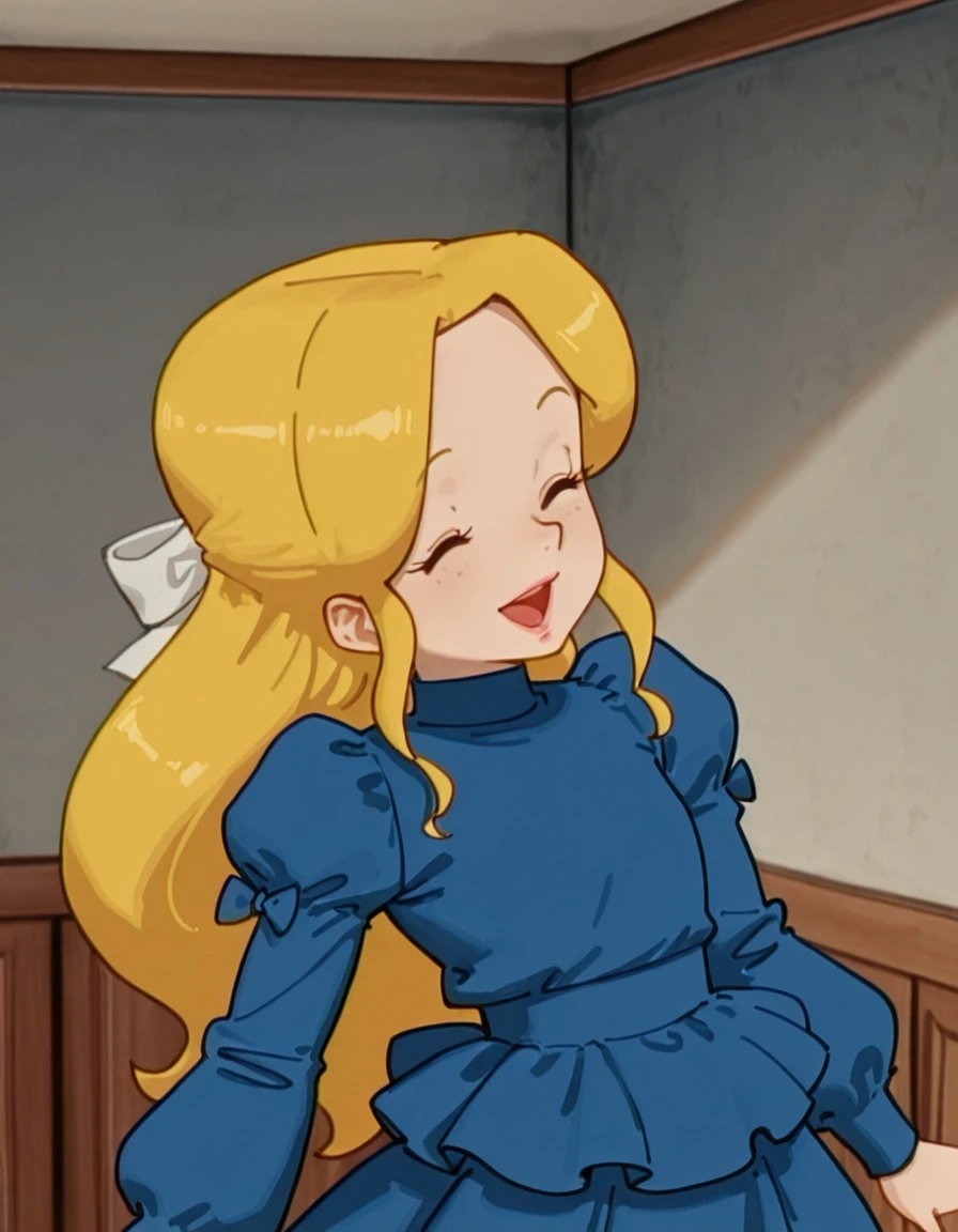 blonde hair, long hair, hair bow, white bow, brown eyes, pink lips,