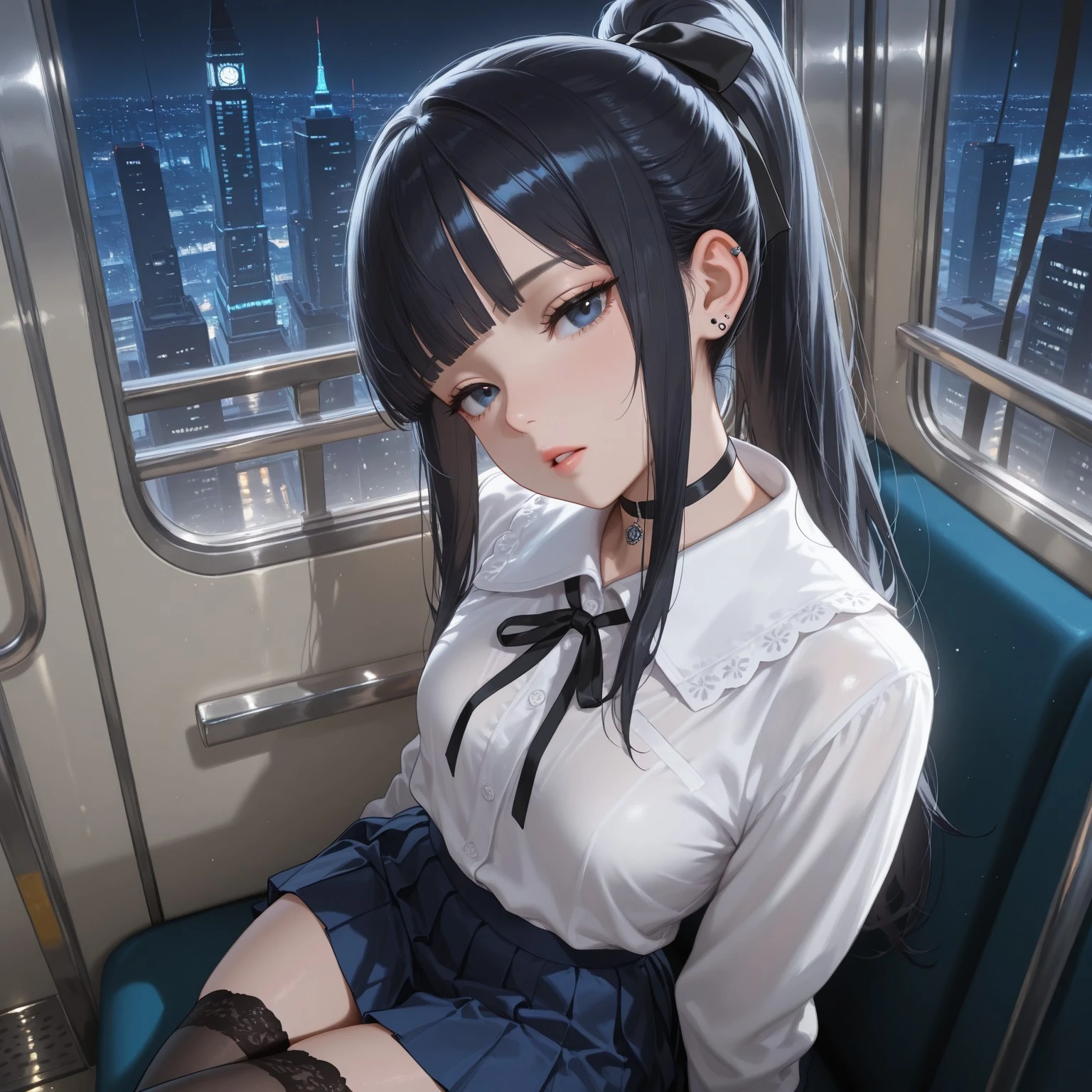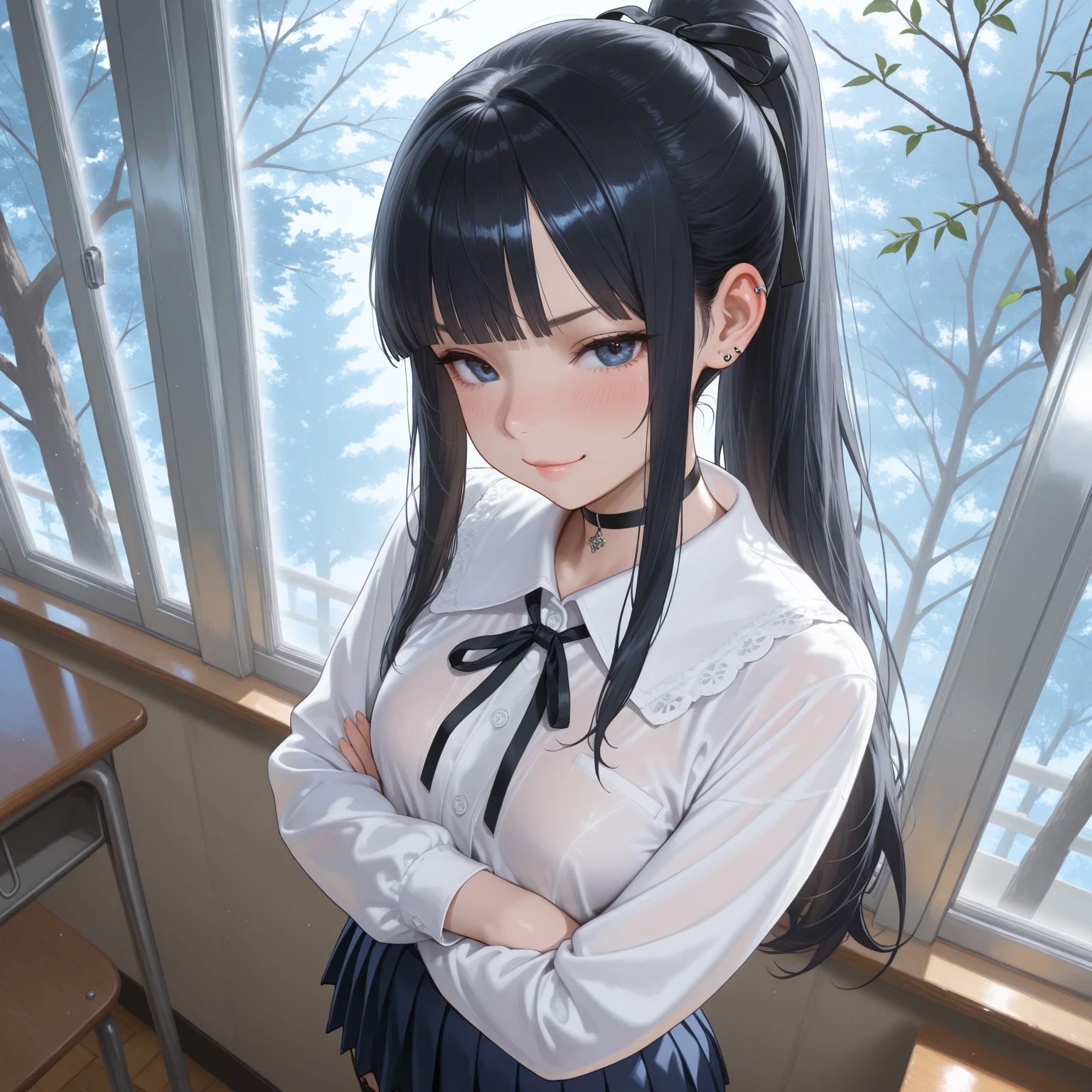 Annette, 1girl, black hair, blunt bangs, long sidelocks, high long ponytail, sturime eyes, dark blue eyes, ears piercing, black choker, small breasts