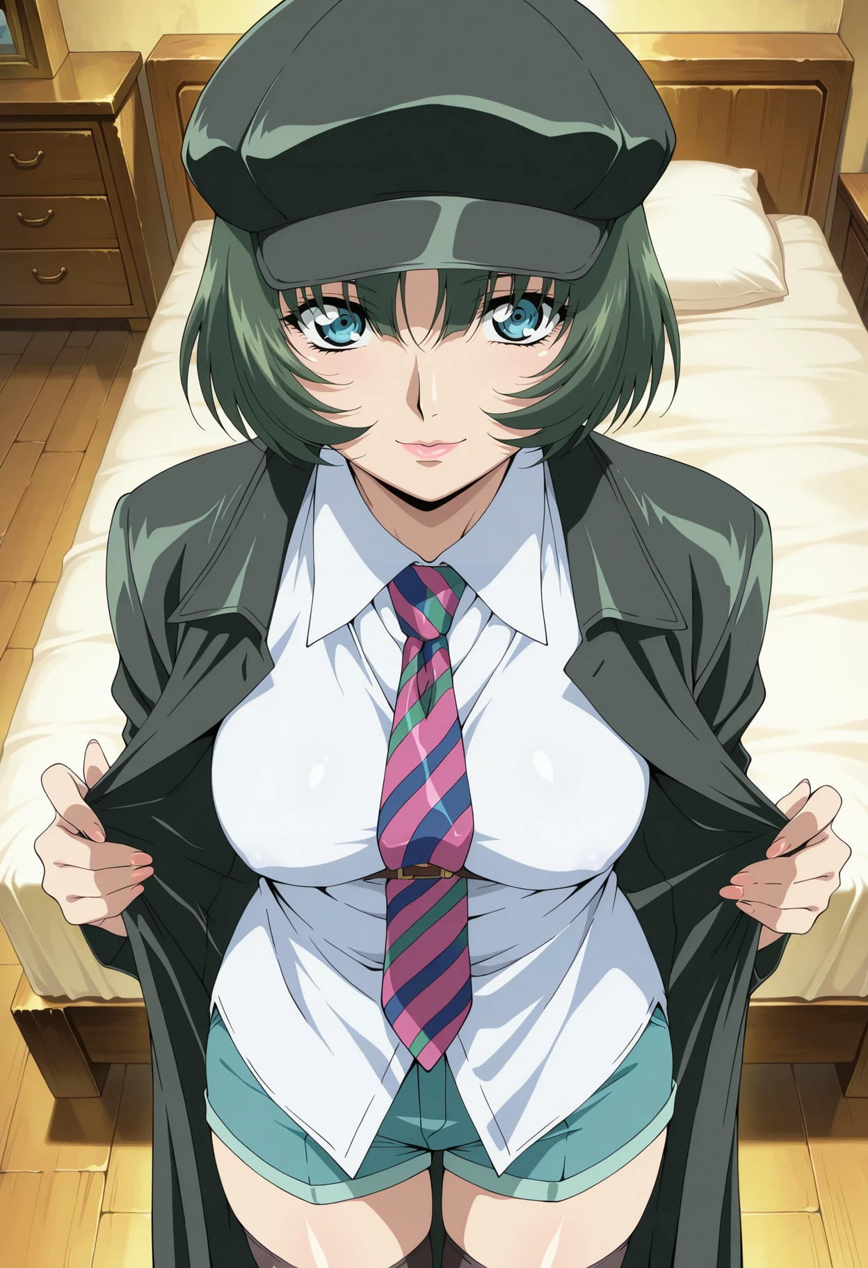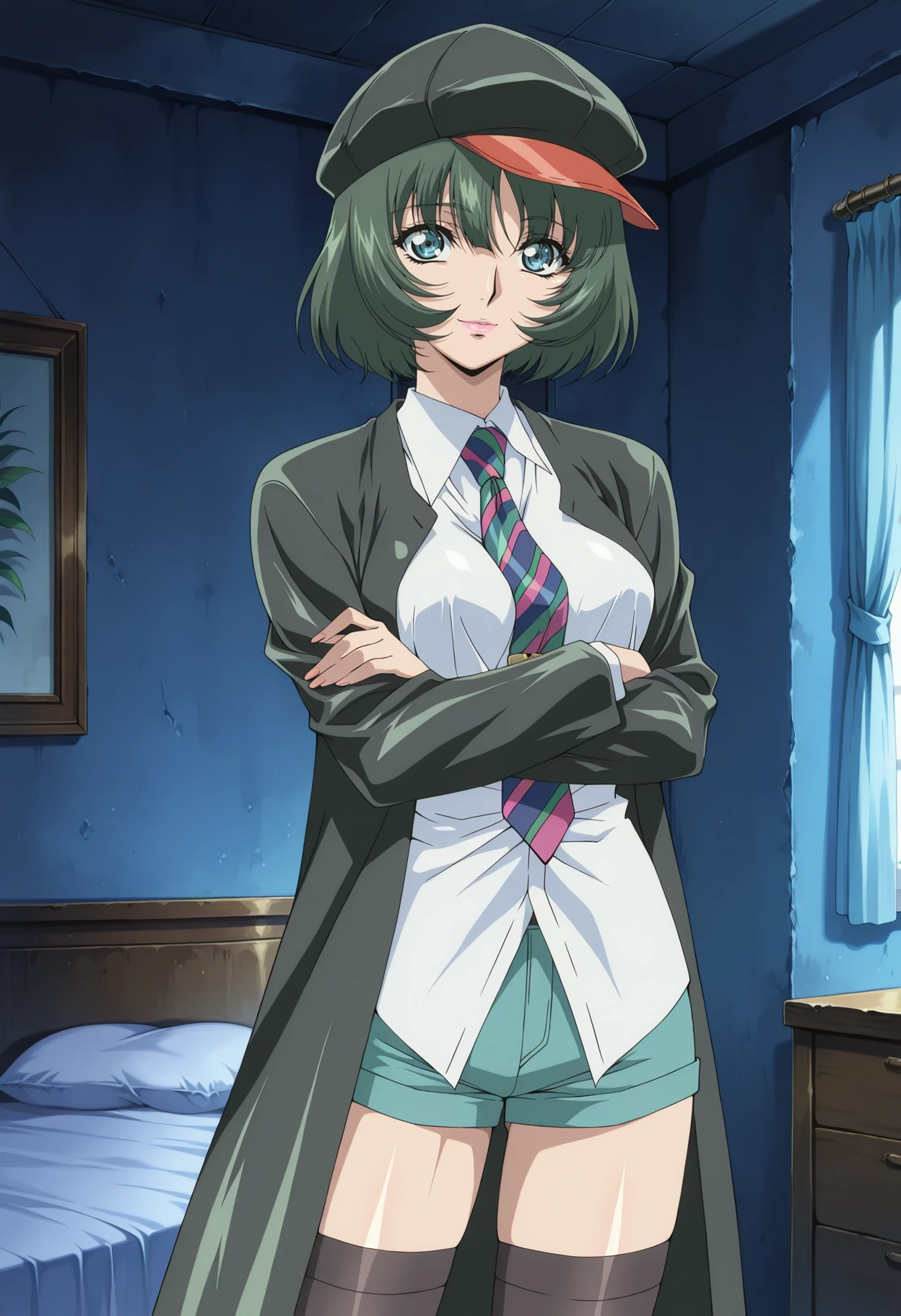 Base: wakaba_d, 1girl, anime coloring, retro artstyle, solo, cabbie hat,short hair, green hair, hair between eyes, blue eyes, lips, lipstick, wakaba green jacket, white shirt, striped necktie, sleeves rolled up, blue shorts, black thighhighs, thighhighs, medium breasts,