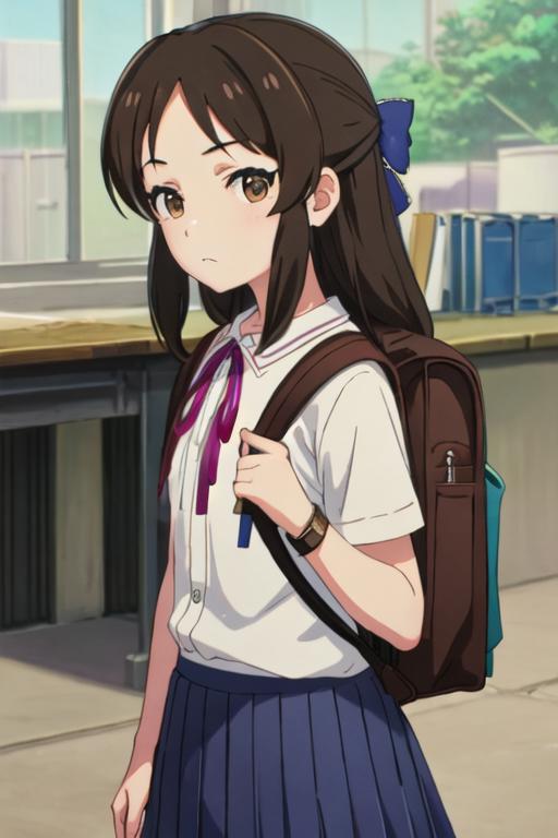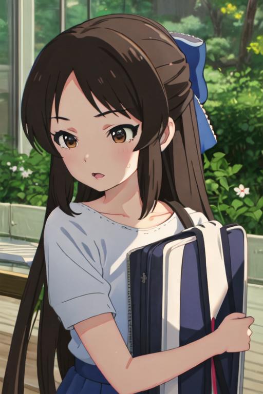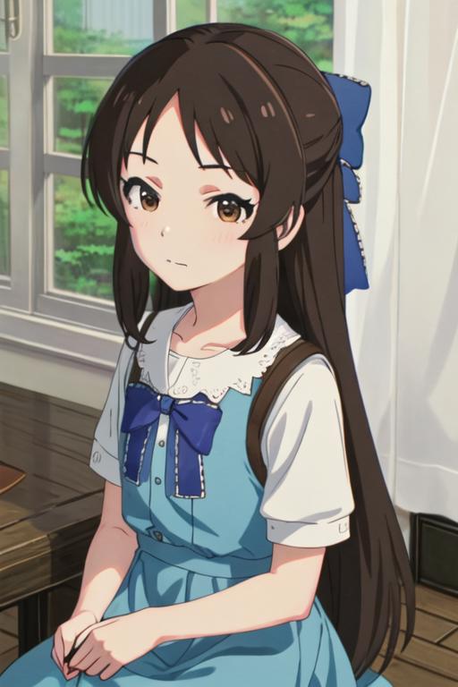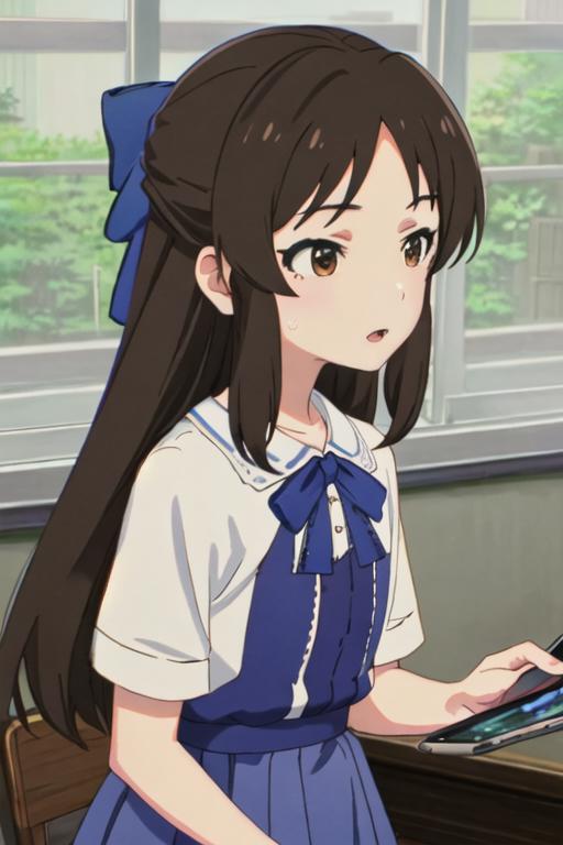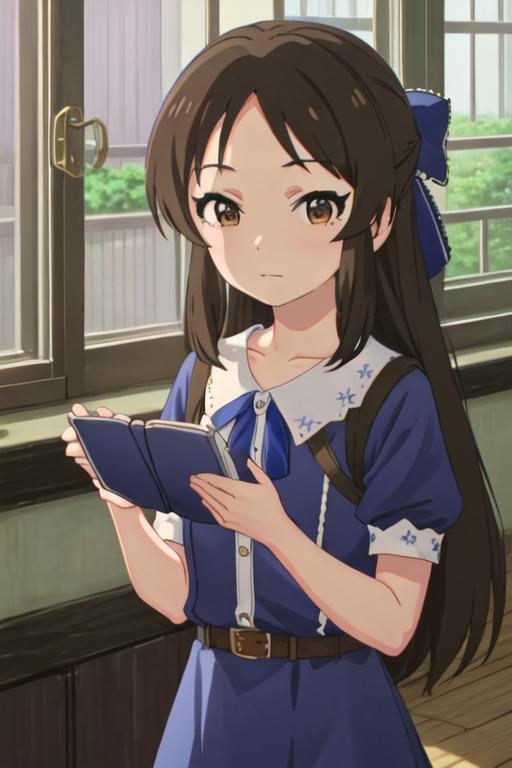 The trigger word is tachibana_arisu_theidolmastercinderellagirlsu149, and the recommended tags are best quality, masterpiece, highres, solo, {tachibana_arisu_theidolmastercinderellagirlsu149:1.15}, brown_hair, long_hair, brown_eyes, bow, hair_bow, upper_body, blue_bow, closed_mouth, bangs.