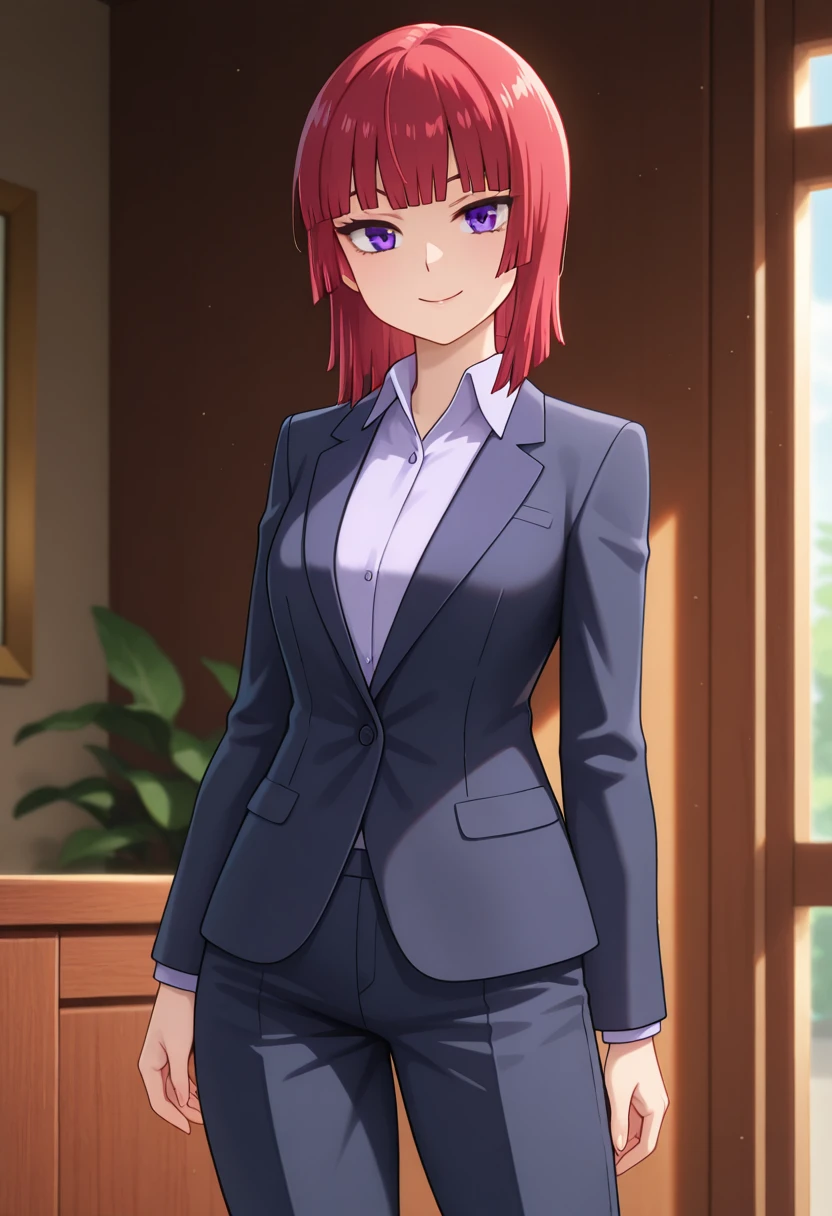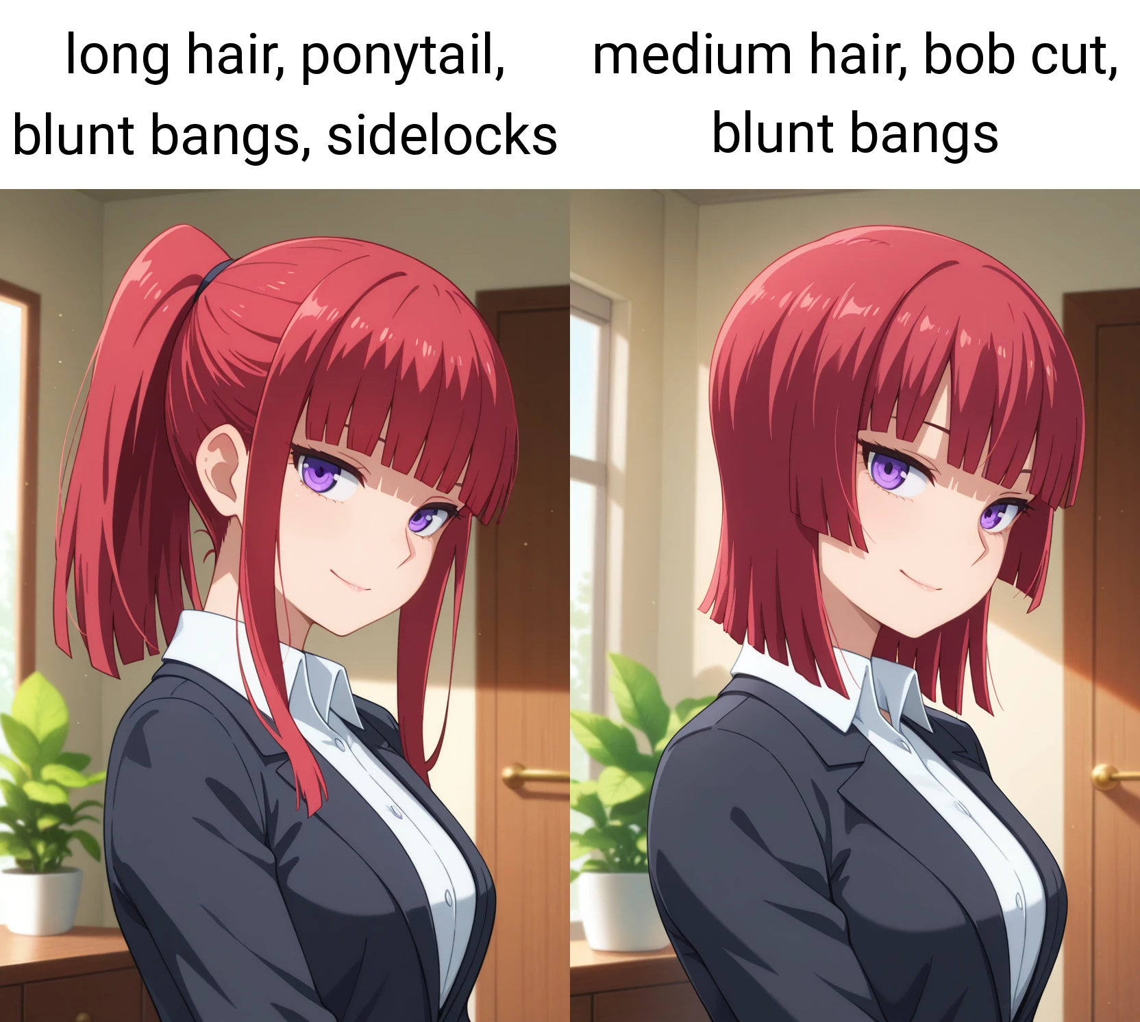 benikaww, mature female, purple eyes, red hair, medium hair, bob cut, blunt bangs,