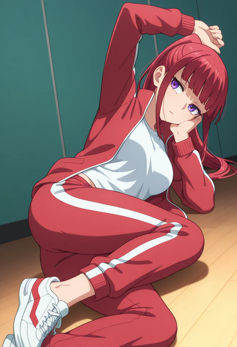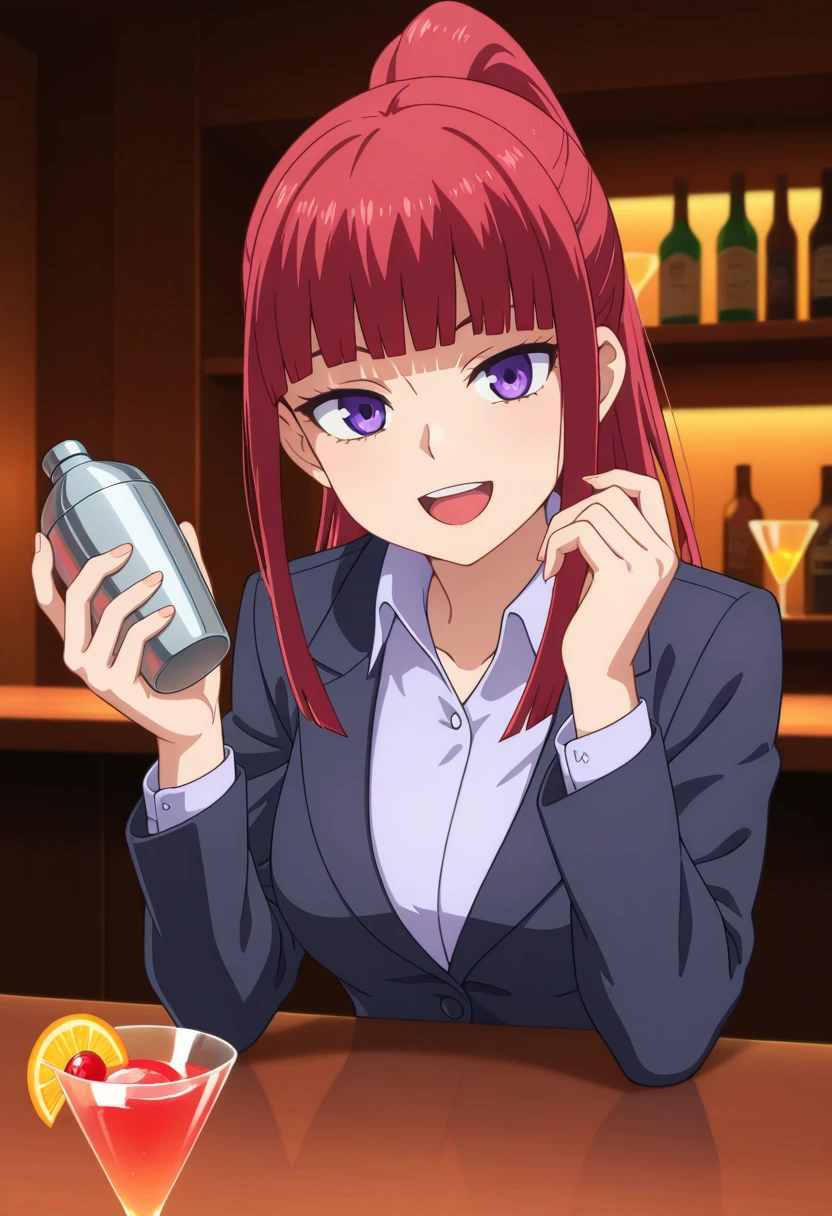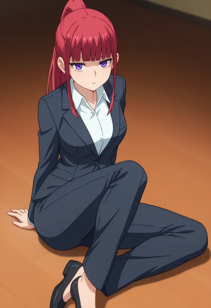 benikaww, mature female, purple eyes, red hair, long hair, ponytail, blunt bangs, sidelocks,