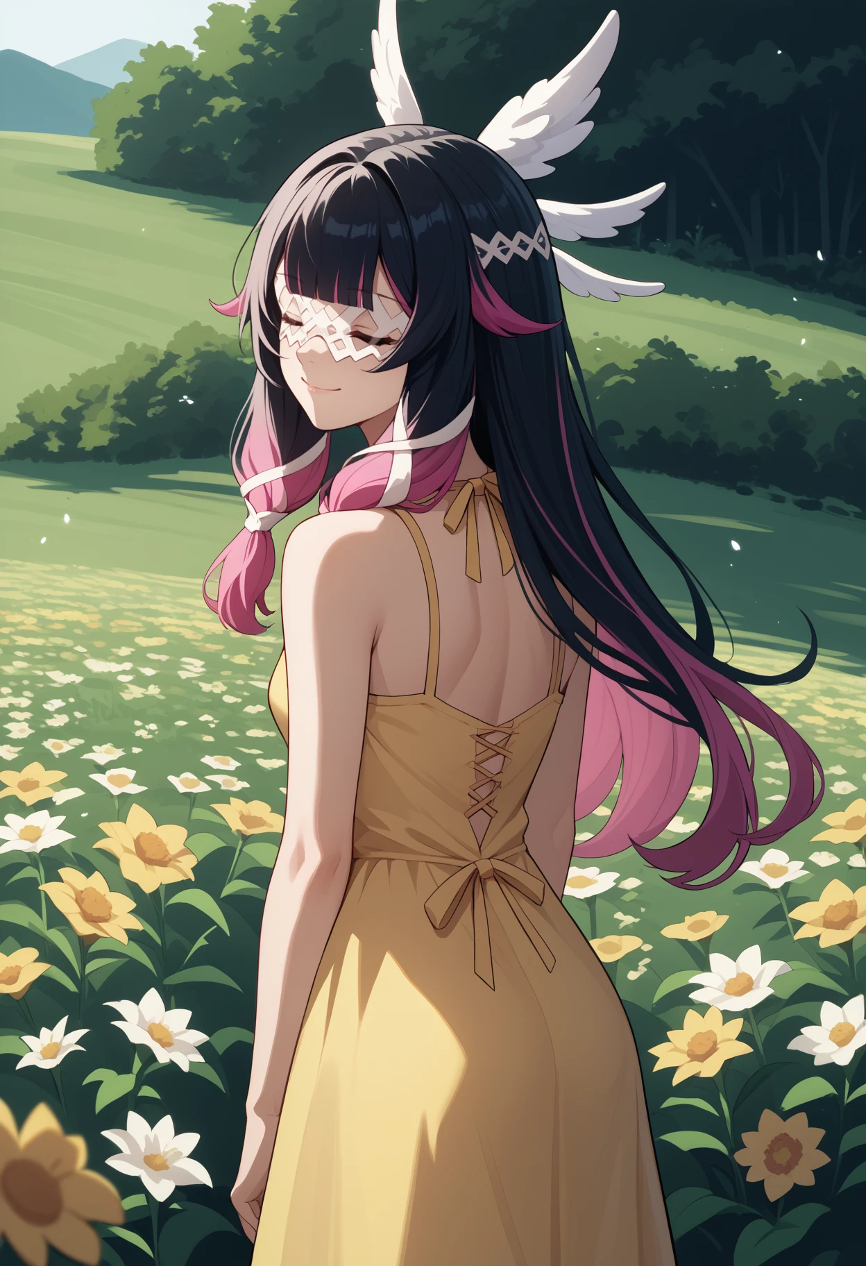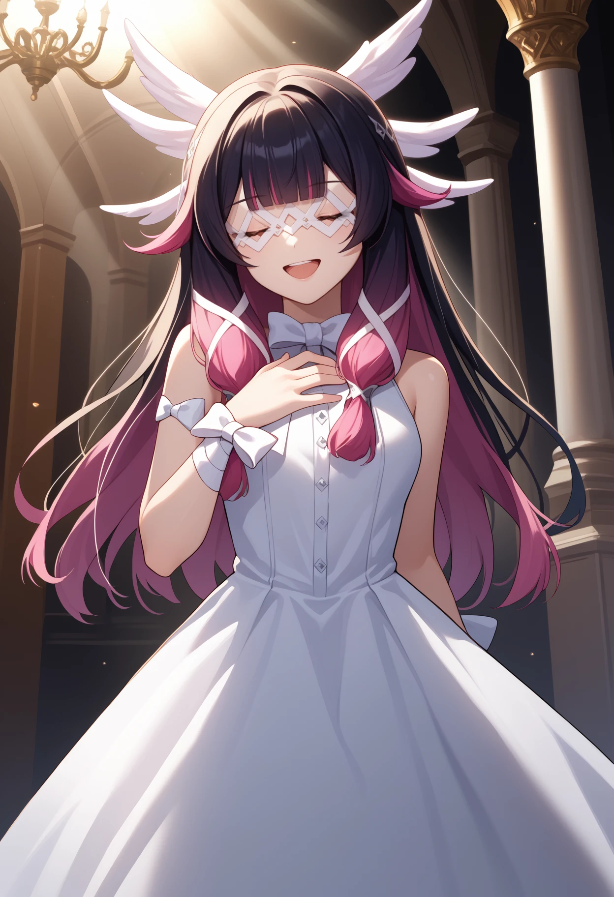 c0lumbina, long hair, streaked hair, black hair, pink hair, blunt bangs, hair ribbon, white ribbon, head wings, closed eyes