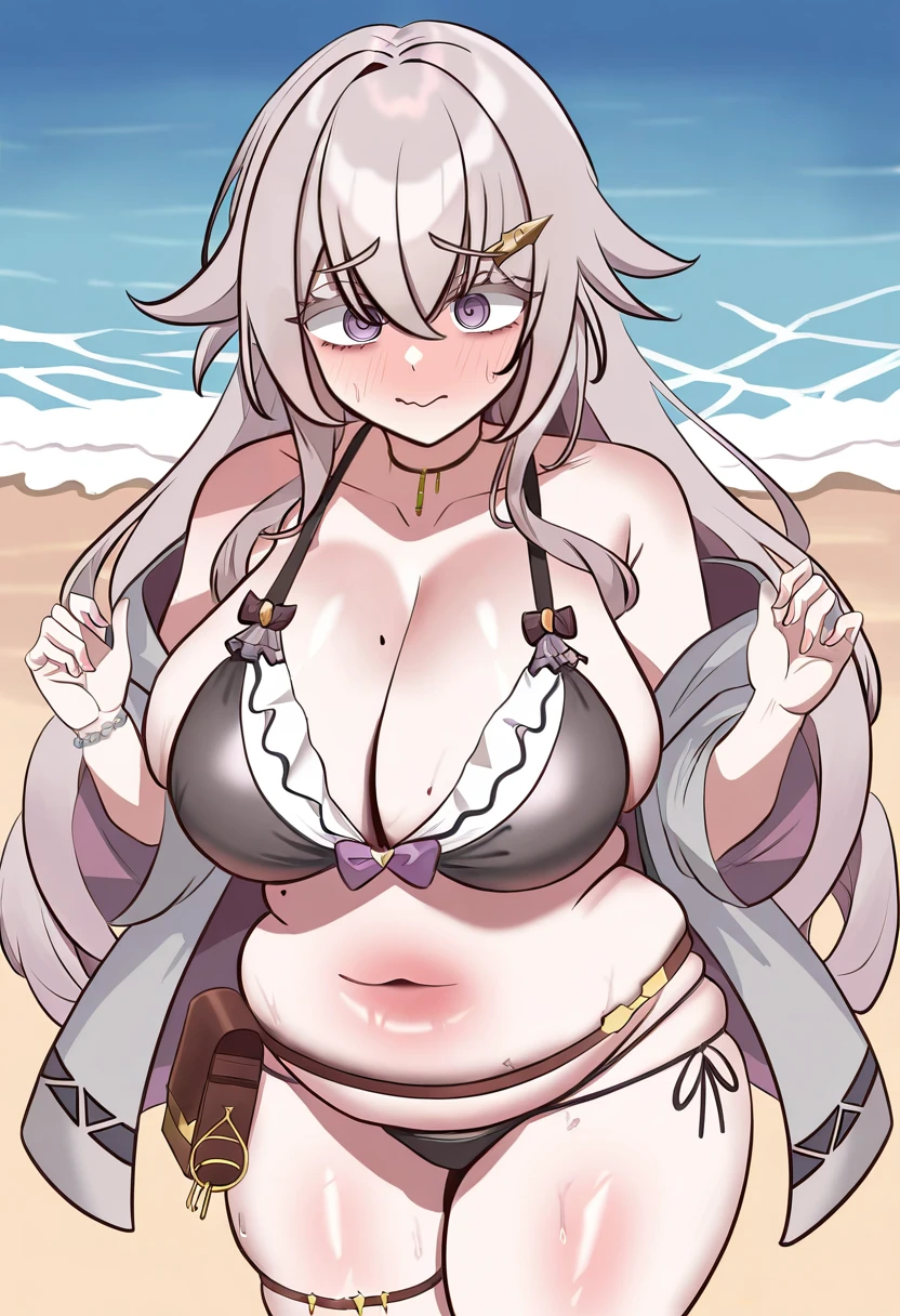 The summer variant of Sigillaria from the gacha game "Flower Knight Girl". Seems to have no english release and the amount of art is pretty low. You might have seen her from a viral japanese tweet that said something along the lines of: "Here's how japan can win in the world." I guess chubby girls in swimsuits are in vogue.