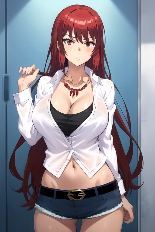 JinnoMisuzu, 1girl, solo, very long hair, large breasts, shirt, red eyes, cleavage, jewelry, red hair, short shorts, midriff, belt, necklace, denim shorts