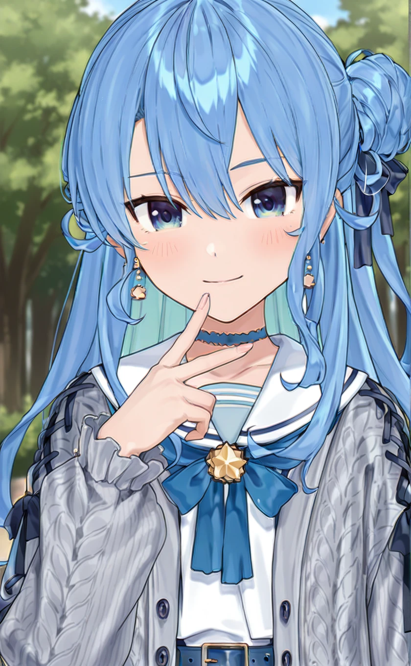 official alternate hairstyle,long hair,blue hair,single side bun,earrings,hair between eyes,blue eyes,symbol in eye