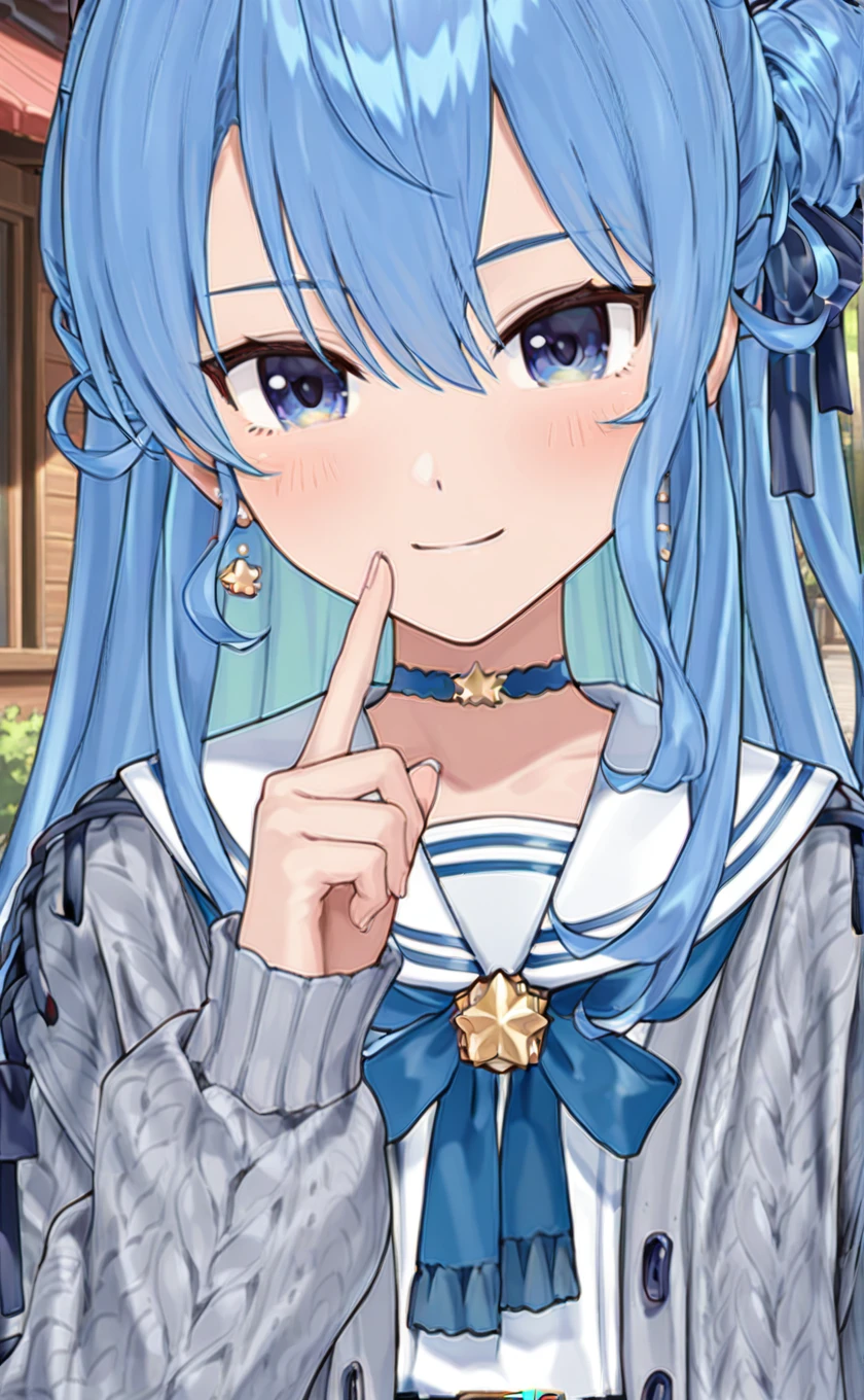 official alternate costume,blue choker,white sailor collar,grey cardigan,open cardigan,white dress,blue bowtie,long sleeves,belt,white skirt,pleated skirt,white socks,black footwear