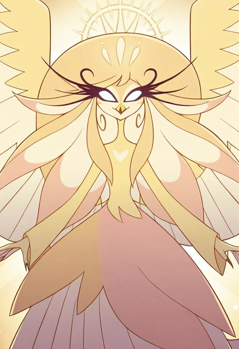 Speaker of god, golden skin, pale gold markings, small beak, angelic avian, tall, very tall, angelic avian female, white and gold plumage, very long eyelashes, six wing, speaker wings, white eyes, gold feathery dress, long hair, golden hair, voluptuous hair, glowing halo, golden halo, long sleeve dress