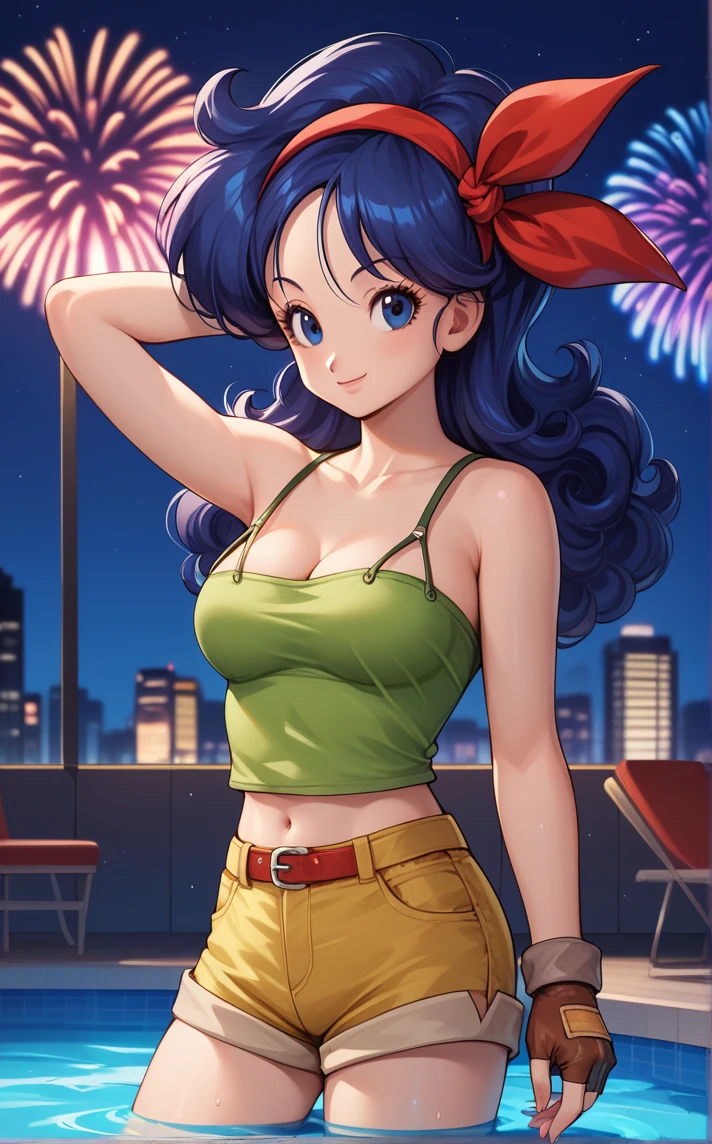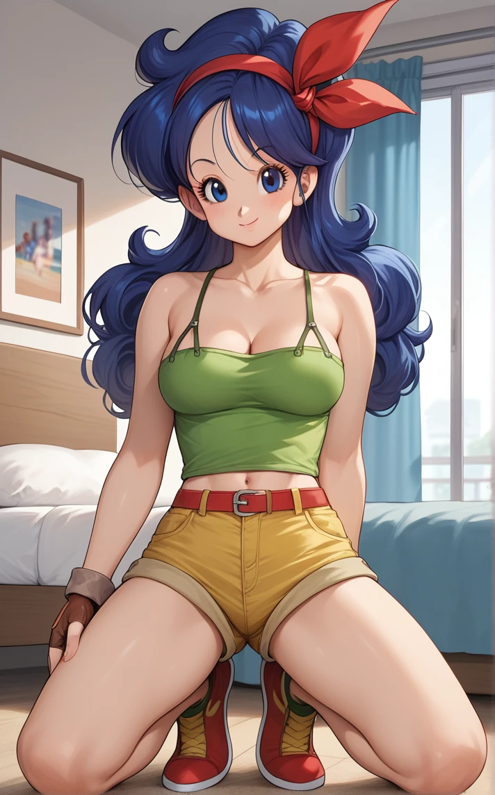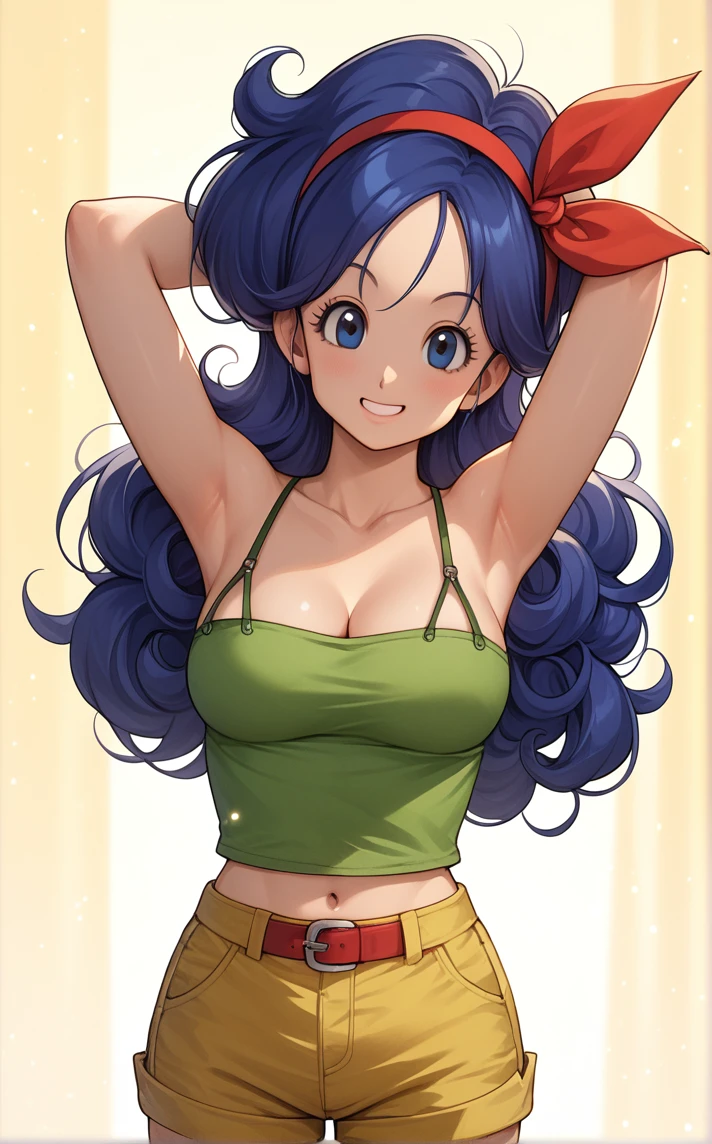 GoodLaunch_BlueHair_ownwaifu, 1girl, blue hair, breasts, eyelashes, long hair, green tank top, curly hair, blue eyes, cleavage, hairband, hair ribbon, fingerless gloves, midriff, medium breasts, bare shoulders, yellow shorts, red hairband, navel, collarbone, belt, short shorts, red ribbon, brown gloves, bare legs, camisole, spaghetti strap, big hair,