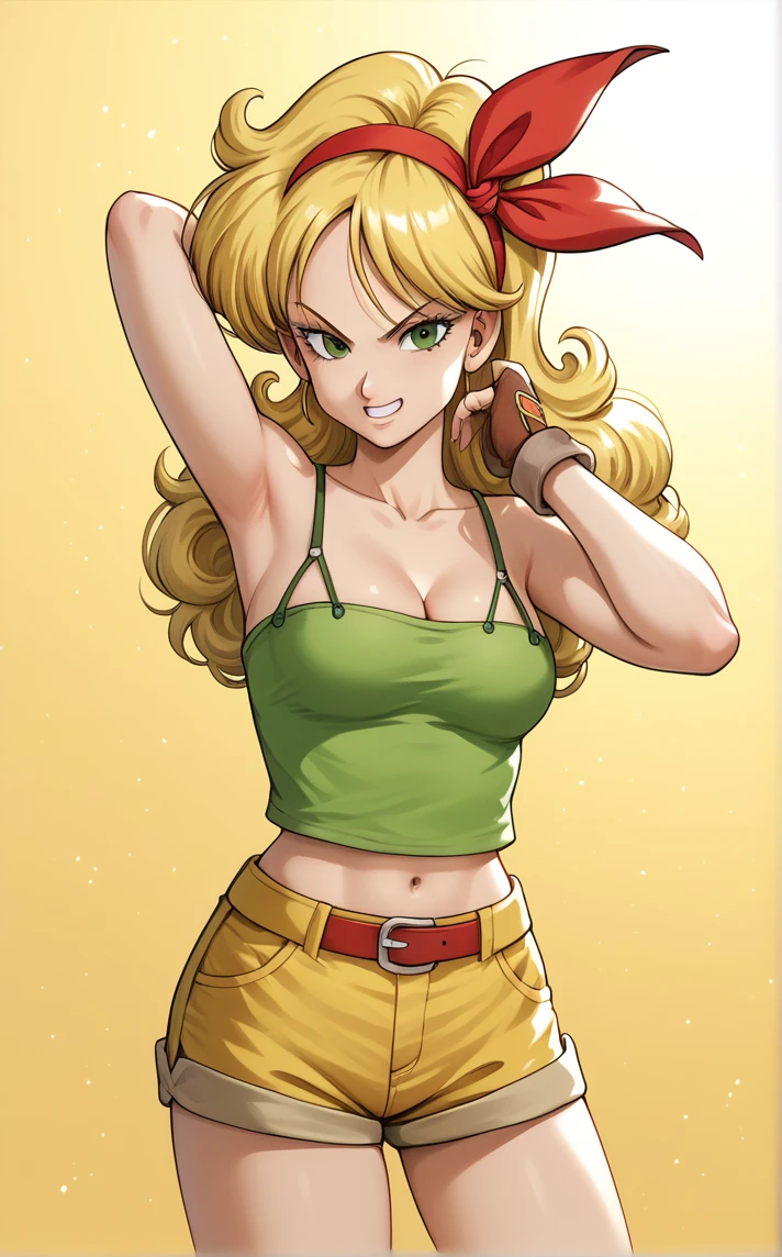 BadLaunch_BlondeHair_ownwaifu, 1girl, blonde hair, breasts, eyelashes, long hair, green tank top, curly hair, green eyes, cleavage, hairband, hair ribbon, fingerless gloves, midriff, medium breasts, bare shoulders, yellow shorts, red hairband, navel, collarbone, belt, short shorts, red ribbon, brown gloves, bare legs, camisole, spaghetti strap, big hair,