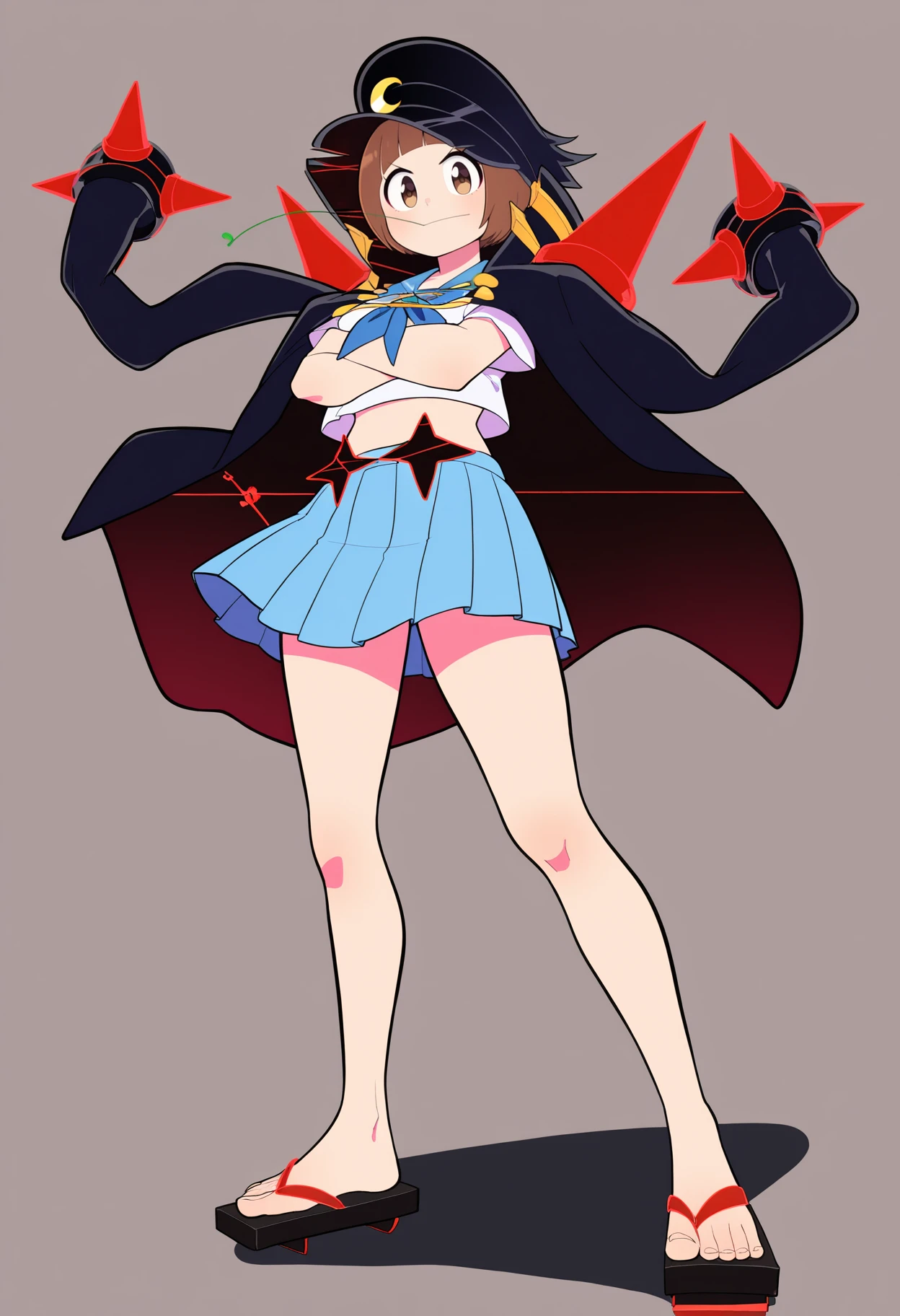 Outfit prompts : jacket on shoulders, jacket, spikes, school uniform, serafuku, crescent hat ornament, hat, geta, blue skirt, midriff, navel, mouth hold