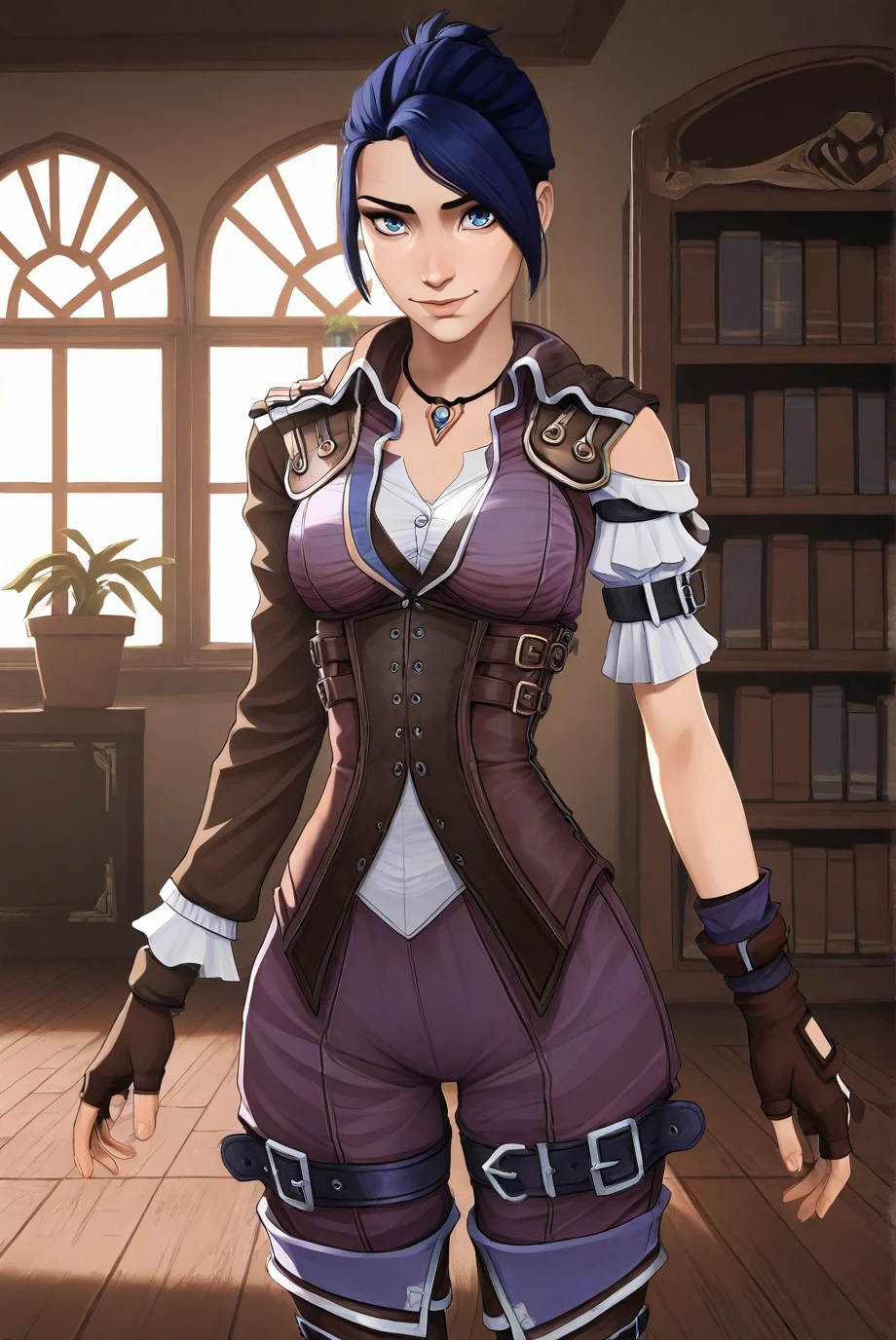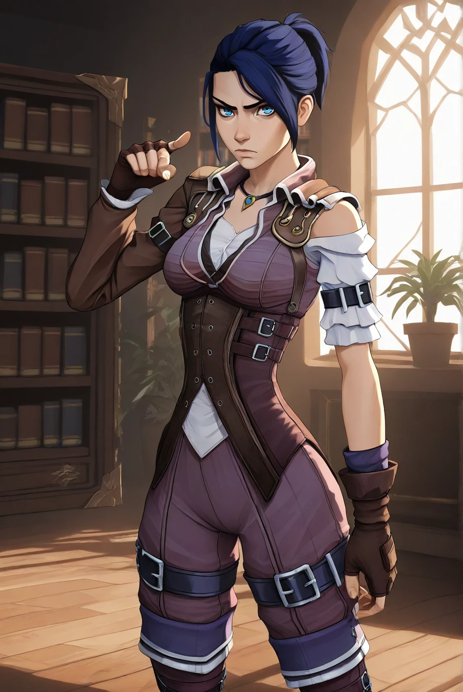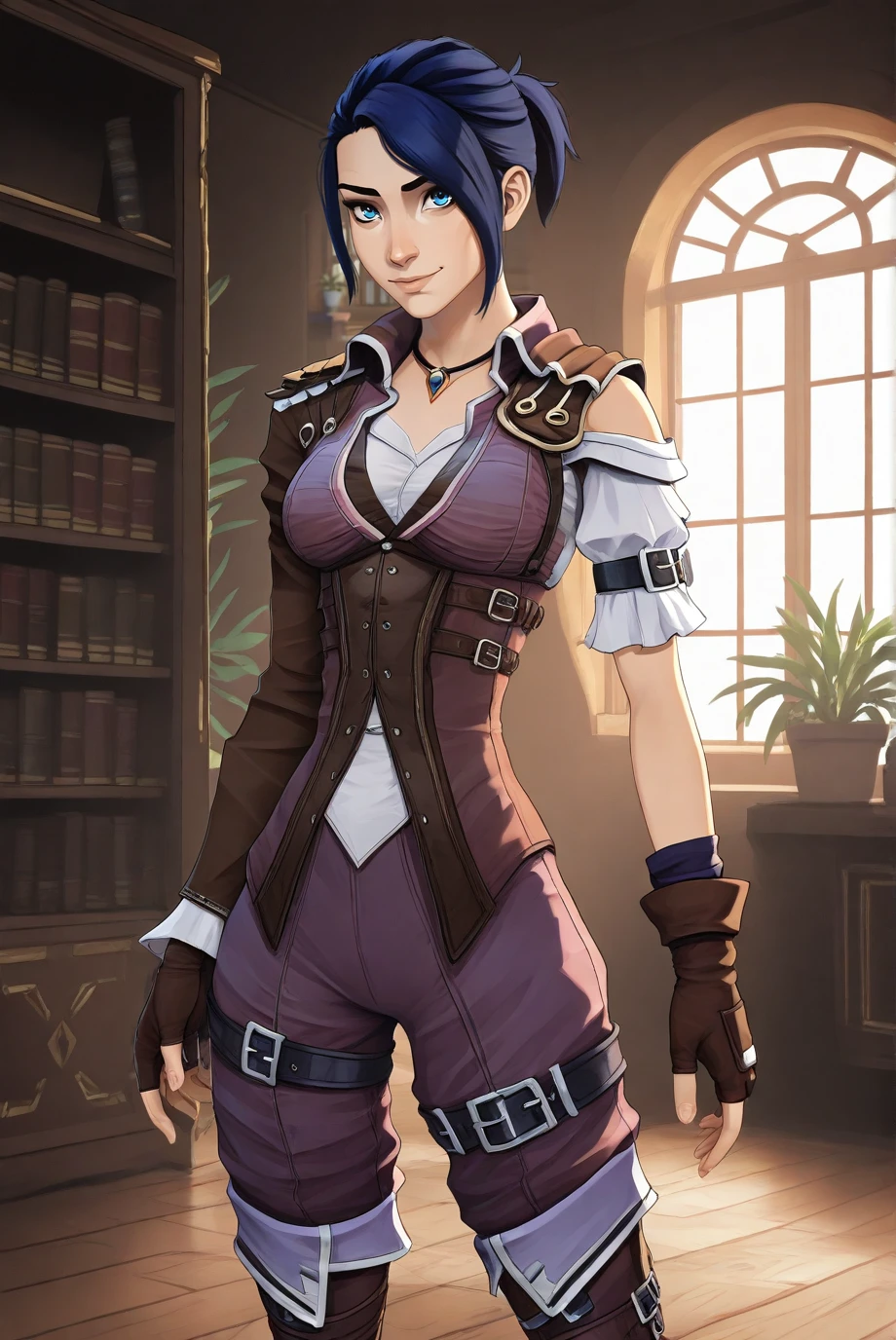 short hair, ponytail, sidelocks, outfit_2, pendant, brown jacket, purple jumpsuit, white shirt, underbust corset, brown corset, single sleeve, long sleeve, single sleeve, long sleeve, arm belt, brown gloves, fingerless gloves, pants tucked in, thigh belt, thigh boots, black footwear,
