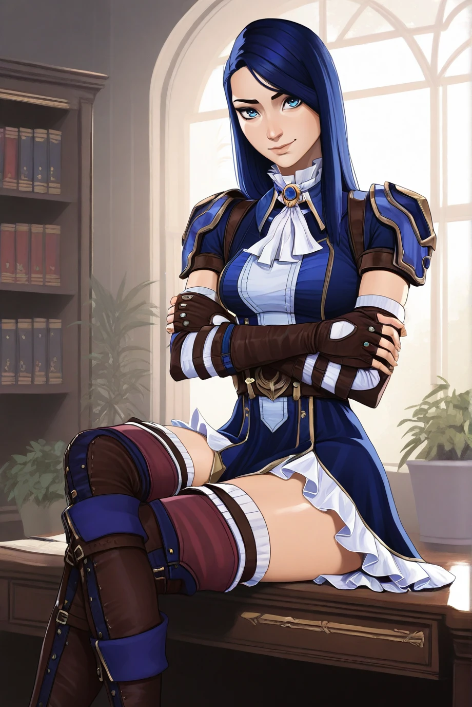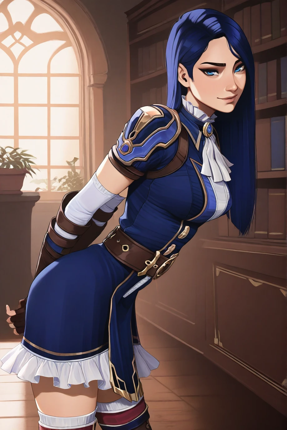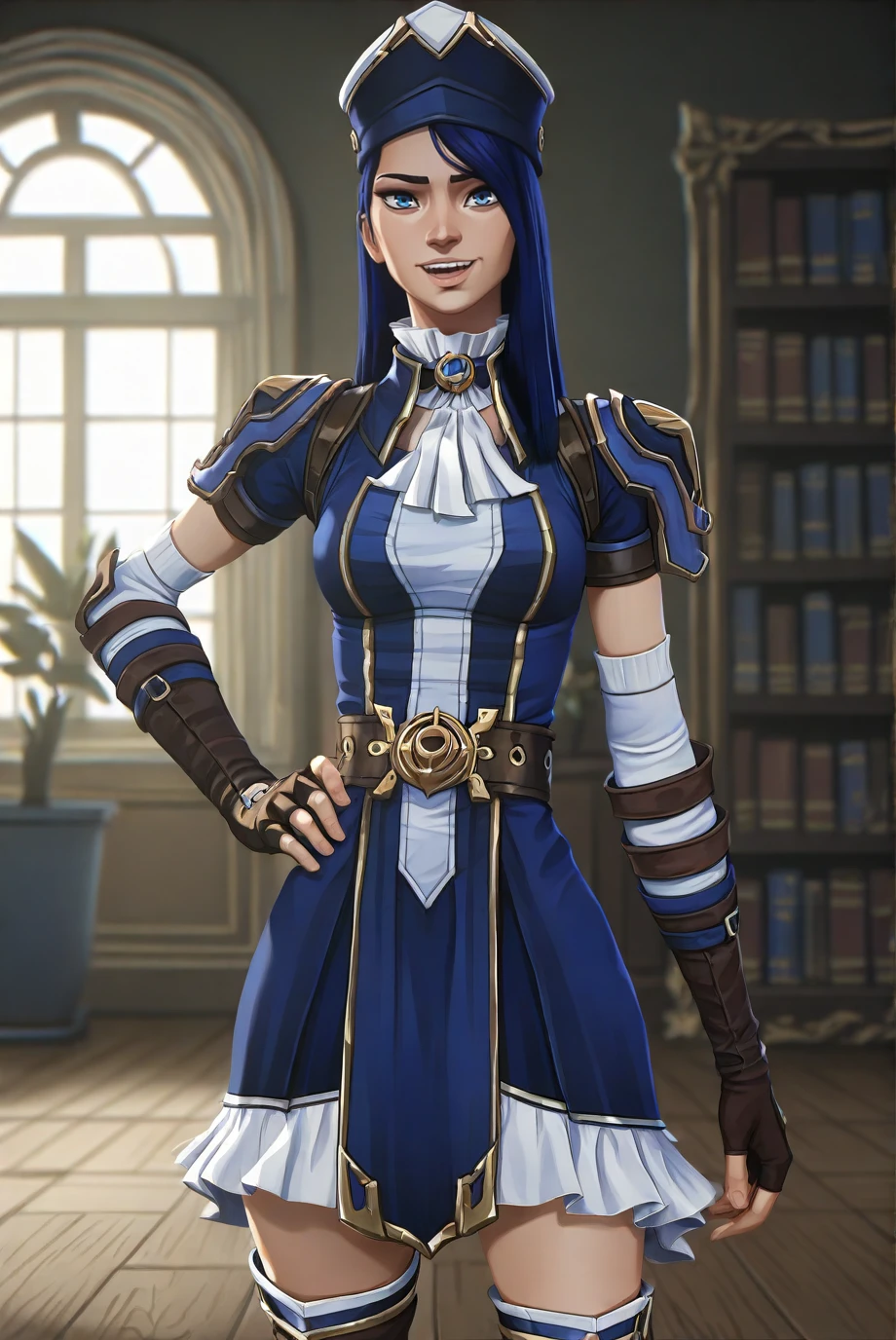 <lora:ArcaneCaitlyn-IL-v1-07:0.8>, ChopioCaitlyn, blue hair, shiny hair, blue eyes, looking at viewer, medium breasts,