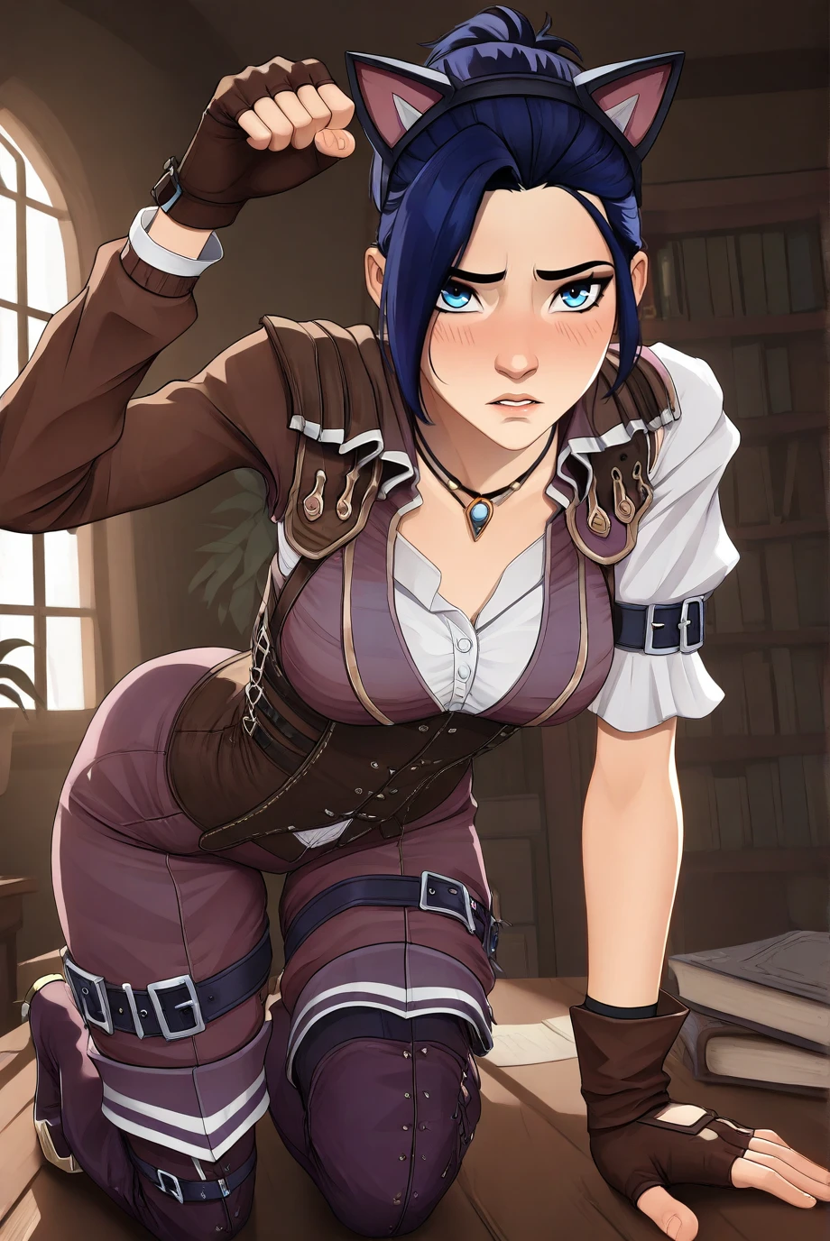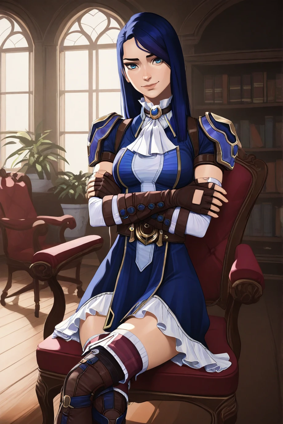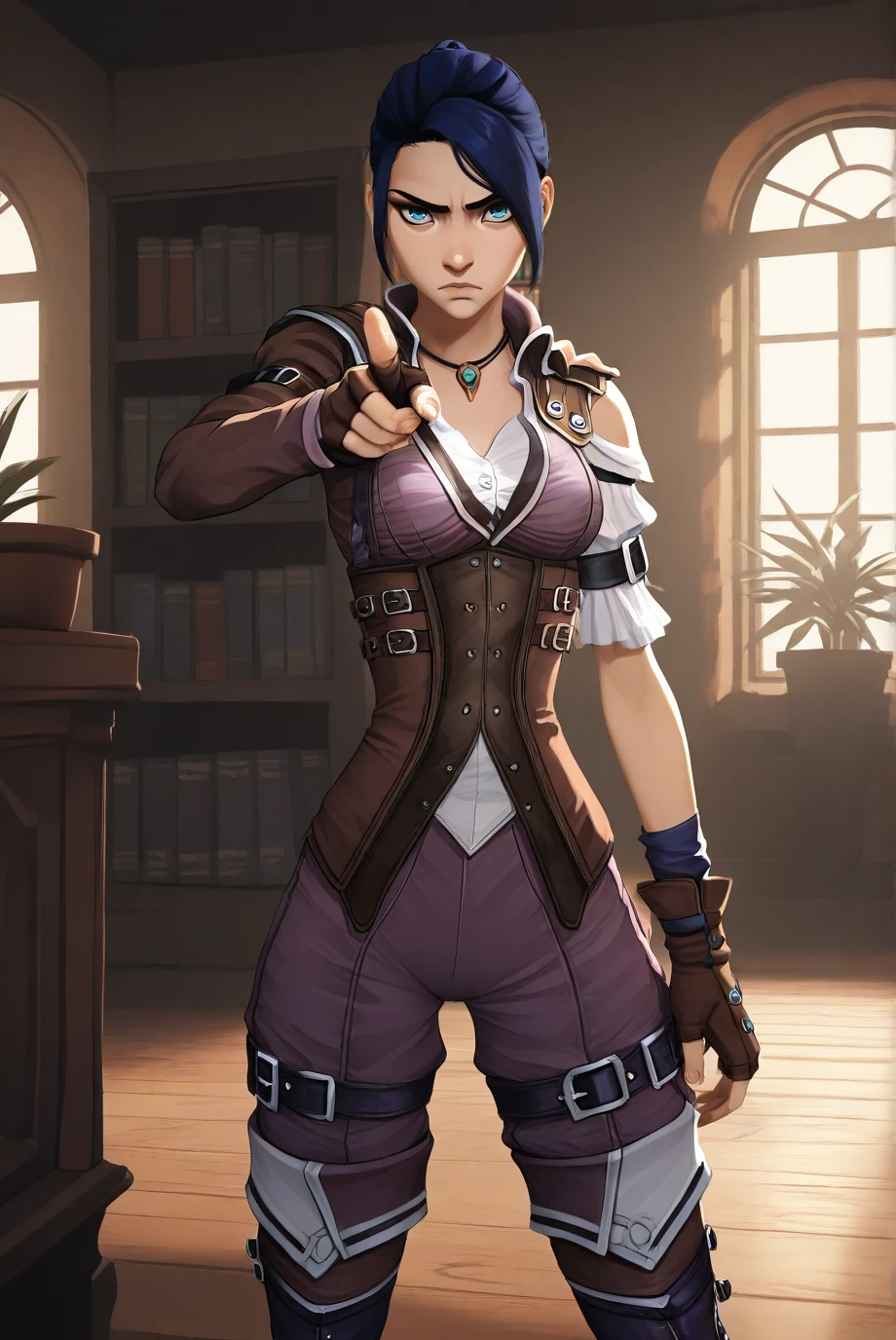 <lora:ArcaneCaitlyn-IL-v1-07:0.8>, ChopioCaitlyn, blue hair, shiny hair, blue eyes, looking at viewer, medium breasts,
