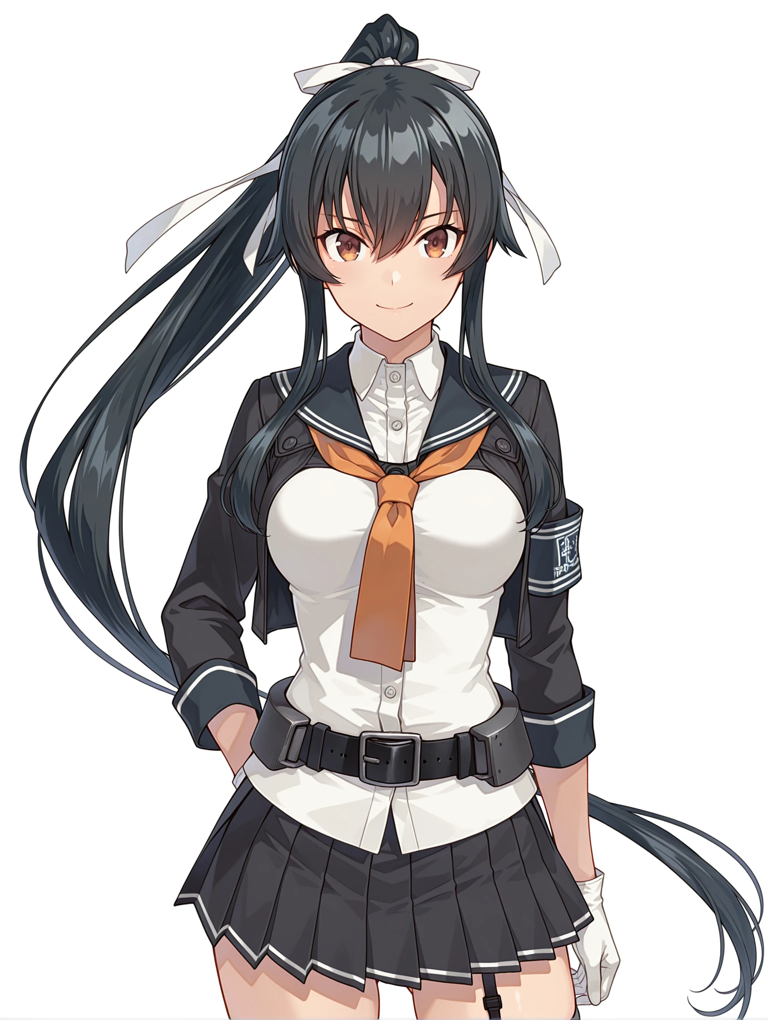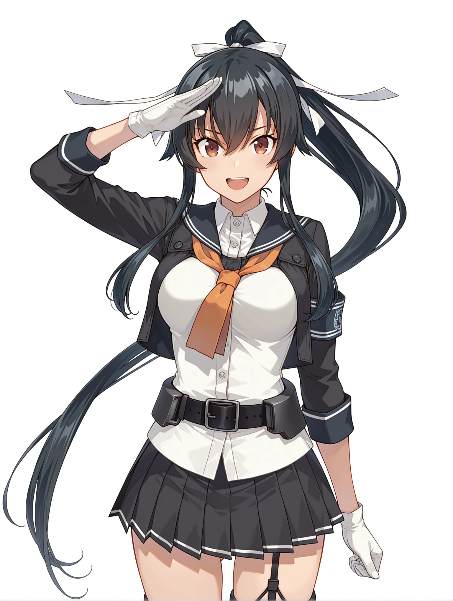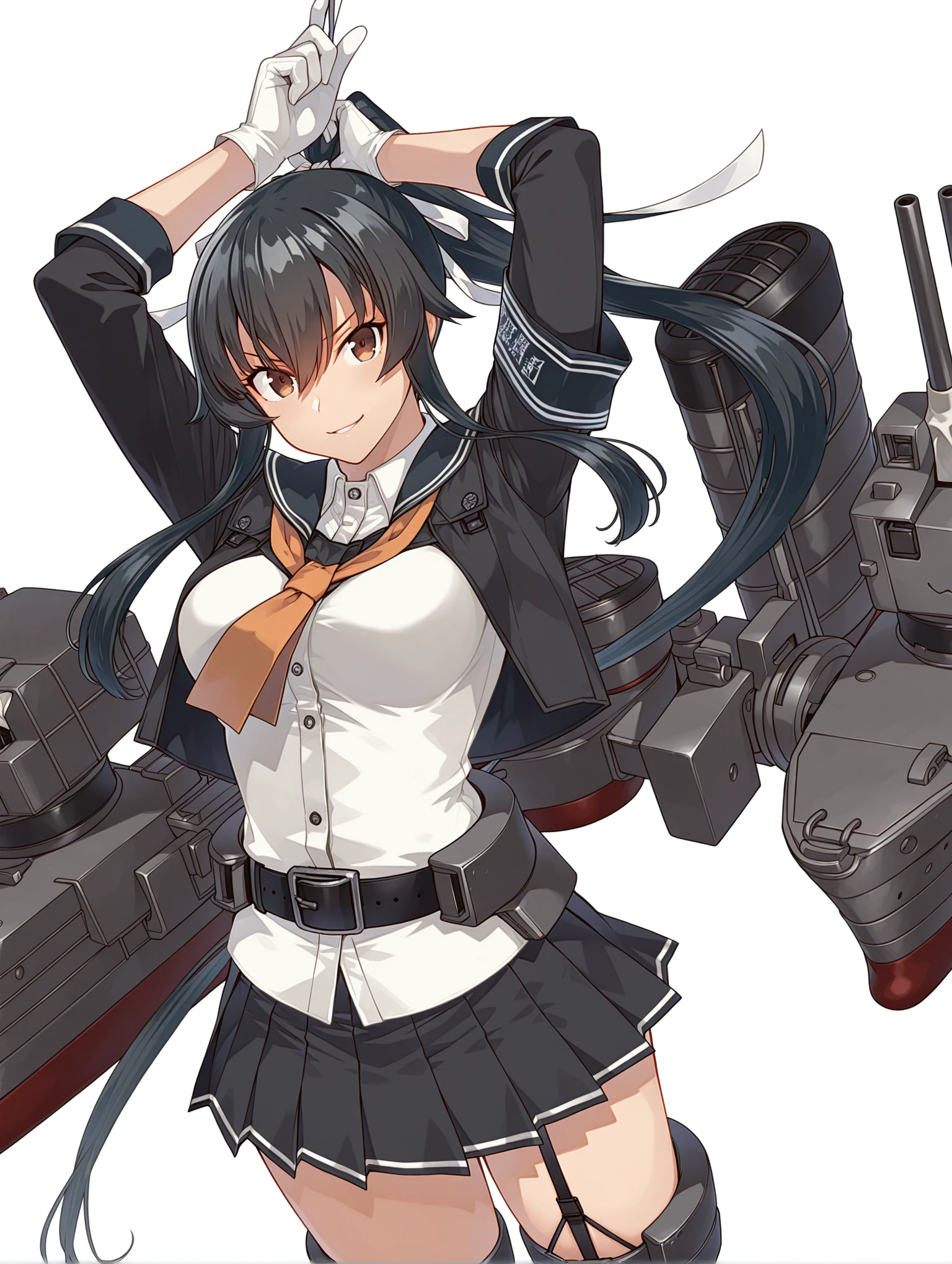 y_clothes,black sailor collar,orange neckerchief,black jacket,white shirt,3/4 sleeve,white gloves,black belt,black skirt,garter straps,single thighhigh,rudder footwear,