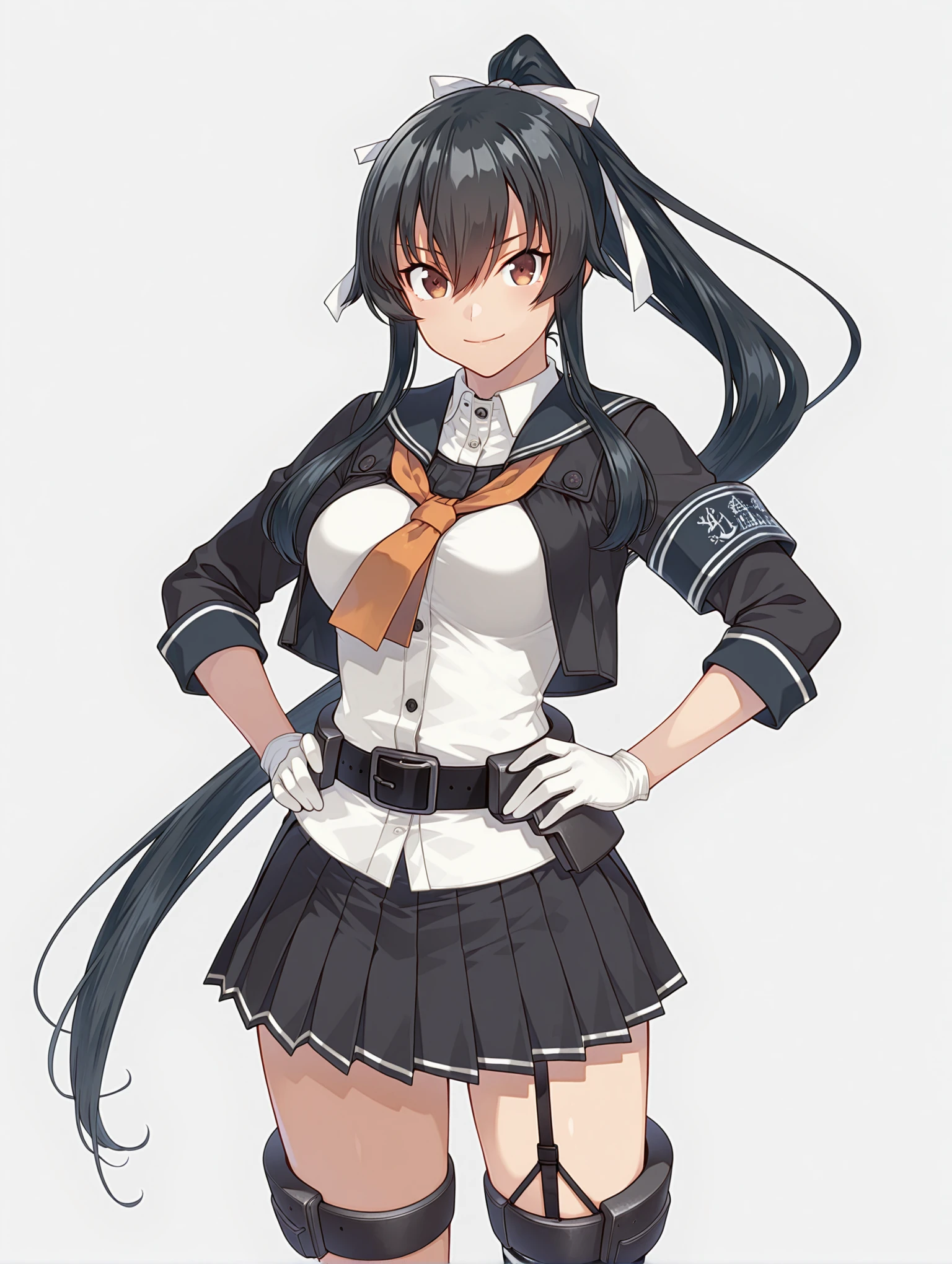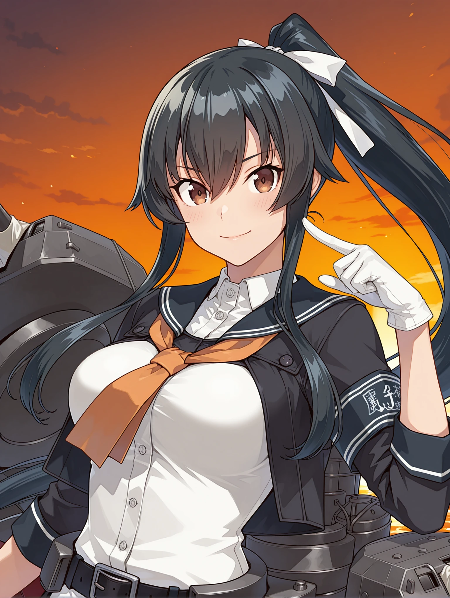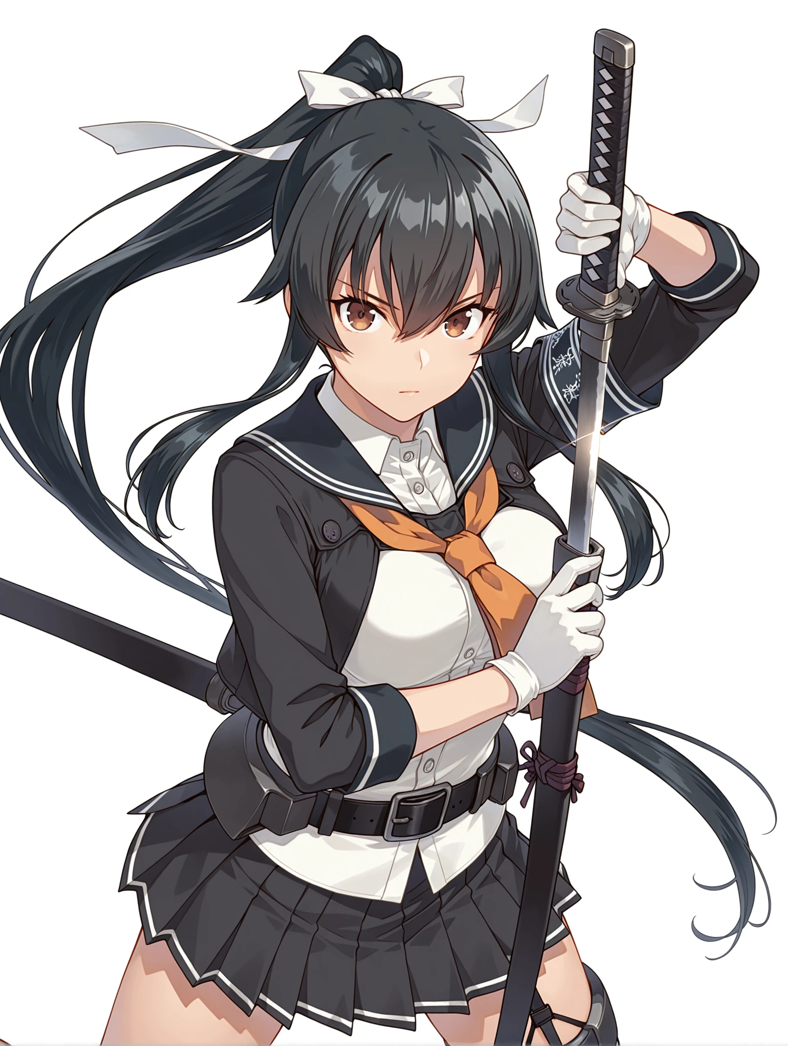 y_clothes,black sailor collar,orange neckerchief,black jacket,white shirt,3/4 sleeve,white gloves,black belt,black skirt,garter straps,single thighhigh,rudder footwear,