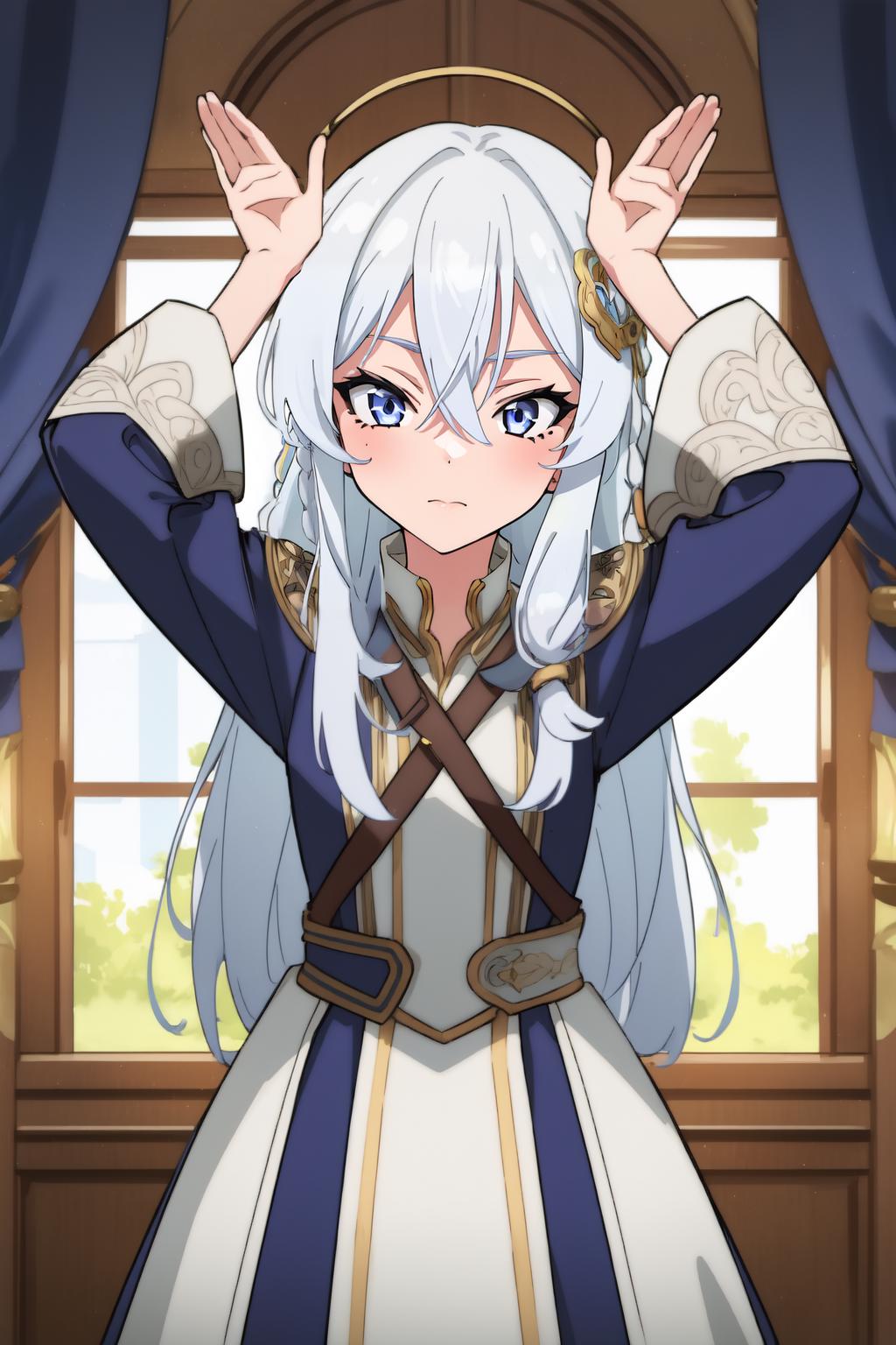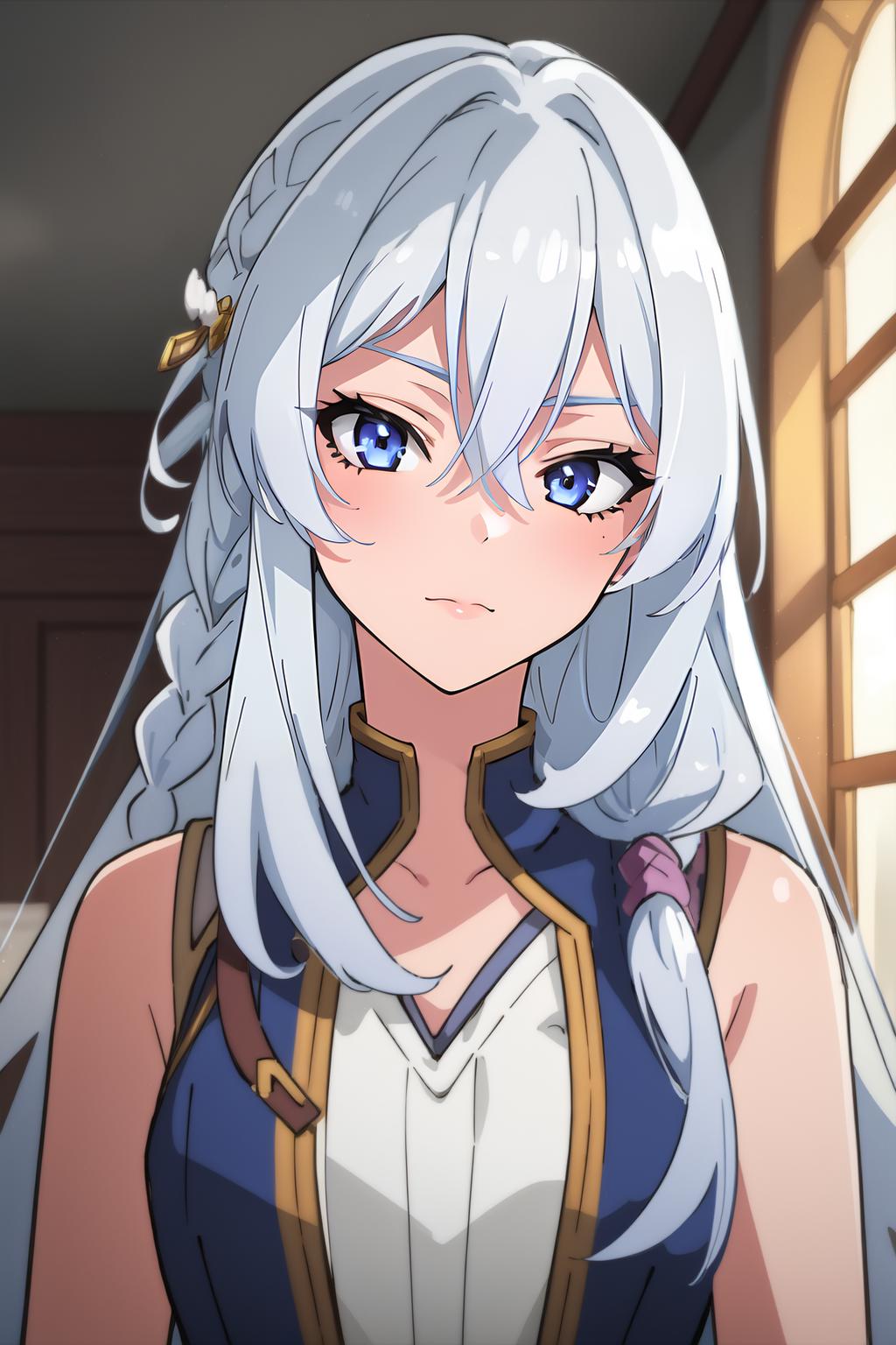 <lora:Elaina-v1-01:0.8>, ChopioElaina, silver hair, long hair, hair between eyes, blue eyes, hair ornament, braid, single braid, looking at viewer,version 1 (normal):