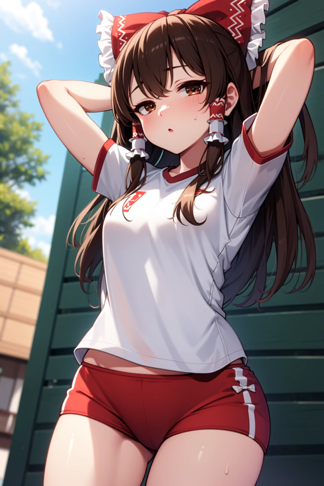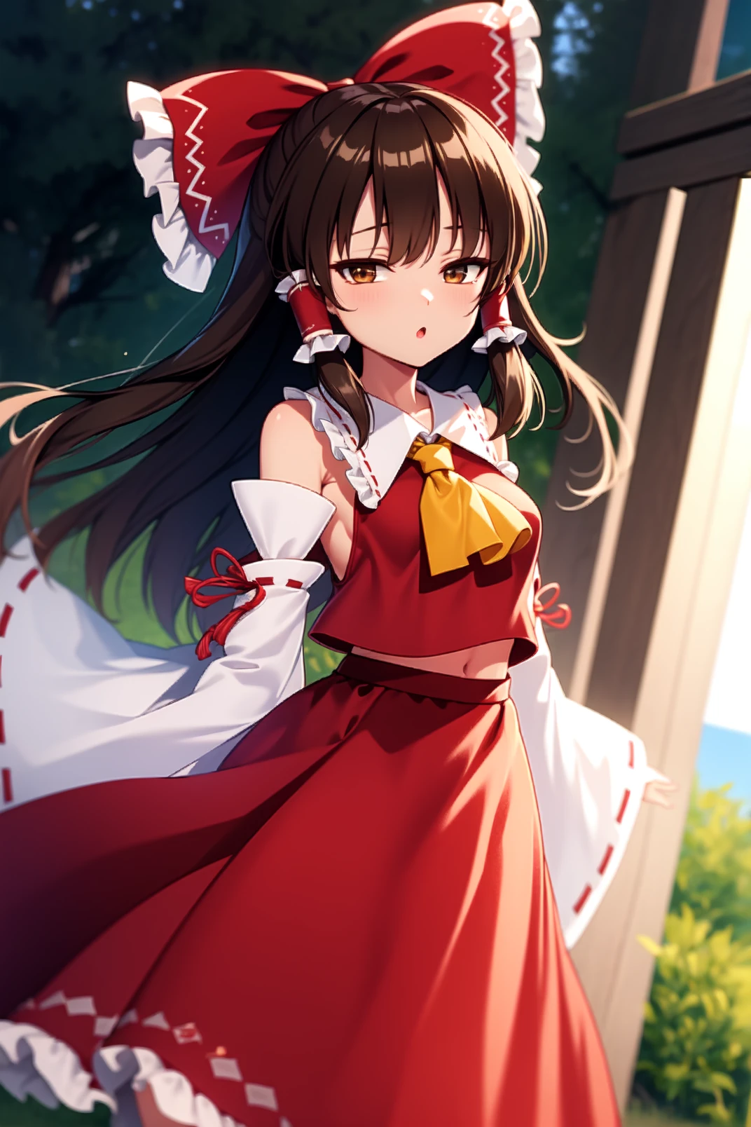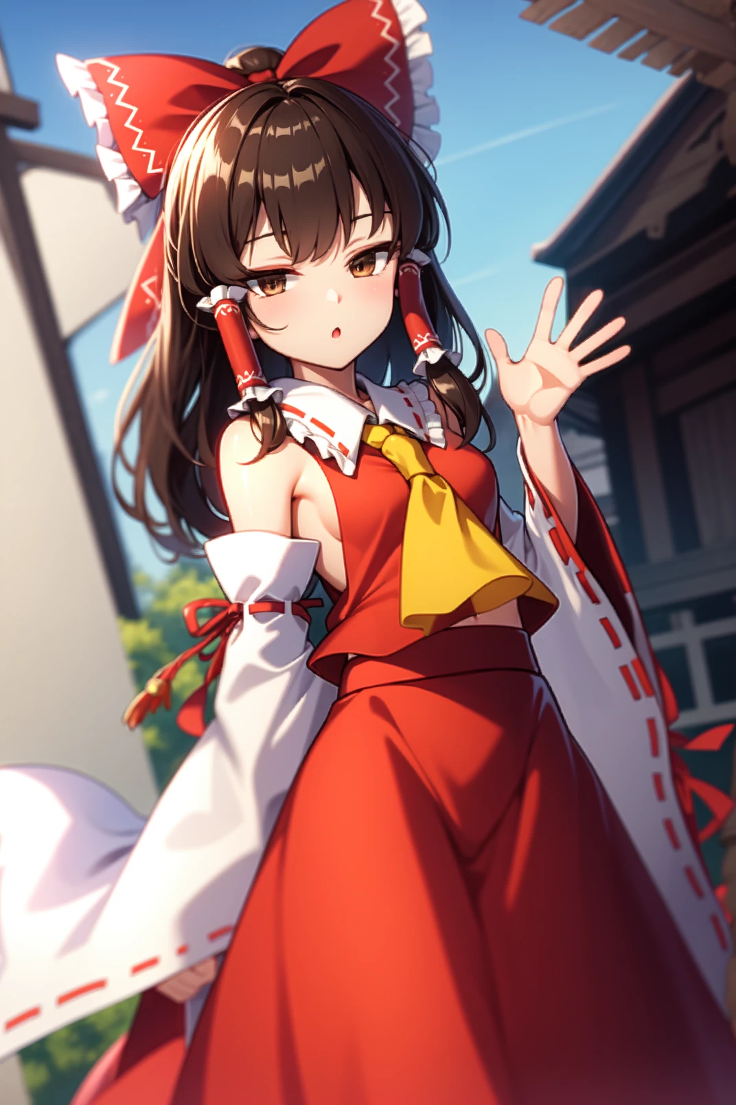 outfit: red hair bow, miko, red shirt, sideboob, detached sleeves, wide sleeves, ribbon-trimmed sleeves, yellow ascot, red skirt, long skirt, frilled skirt, frills, white socks, black shoes