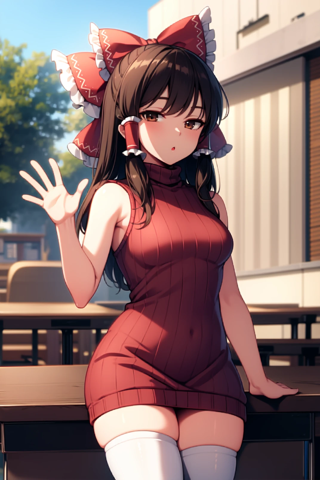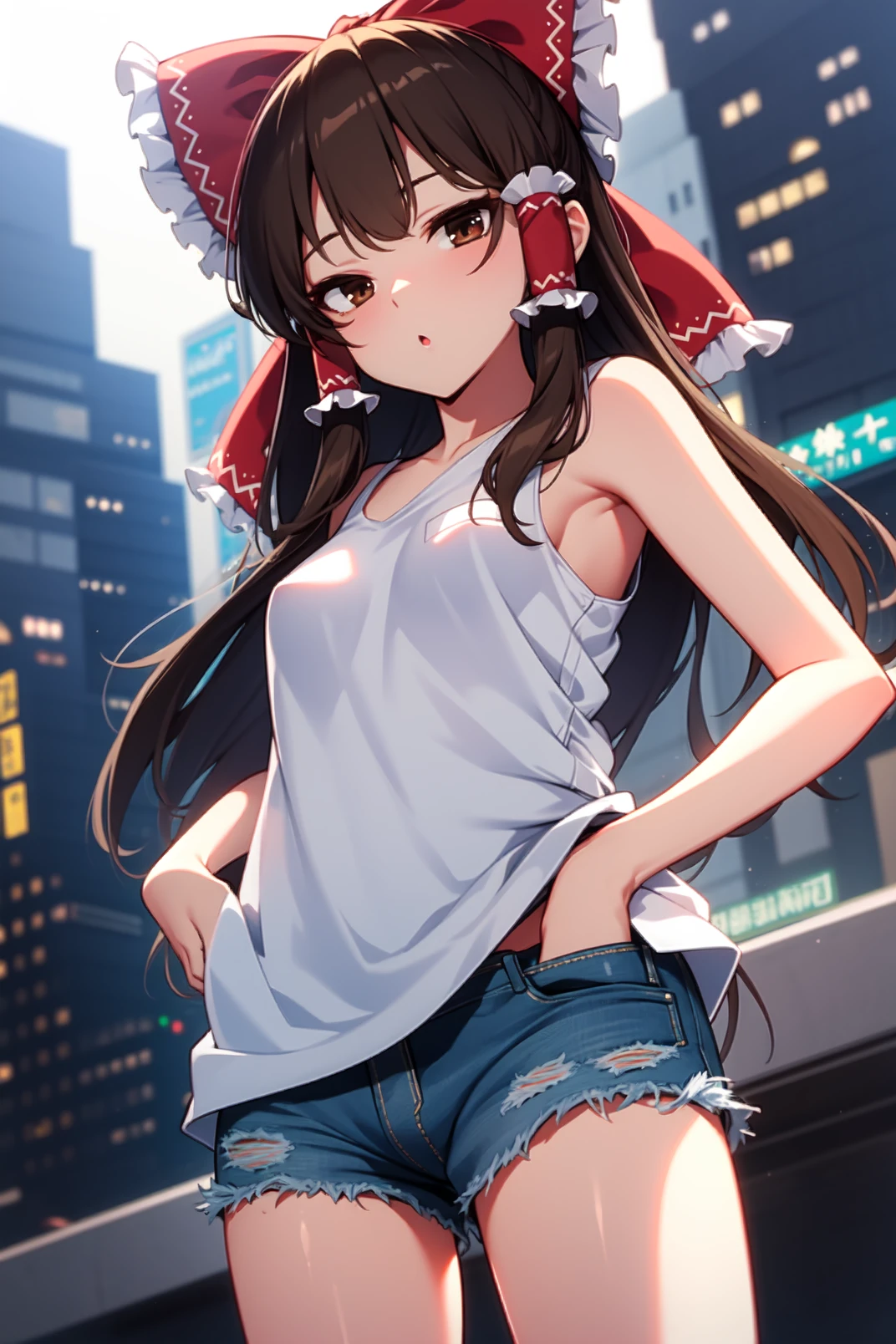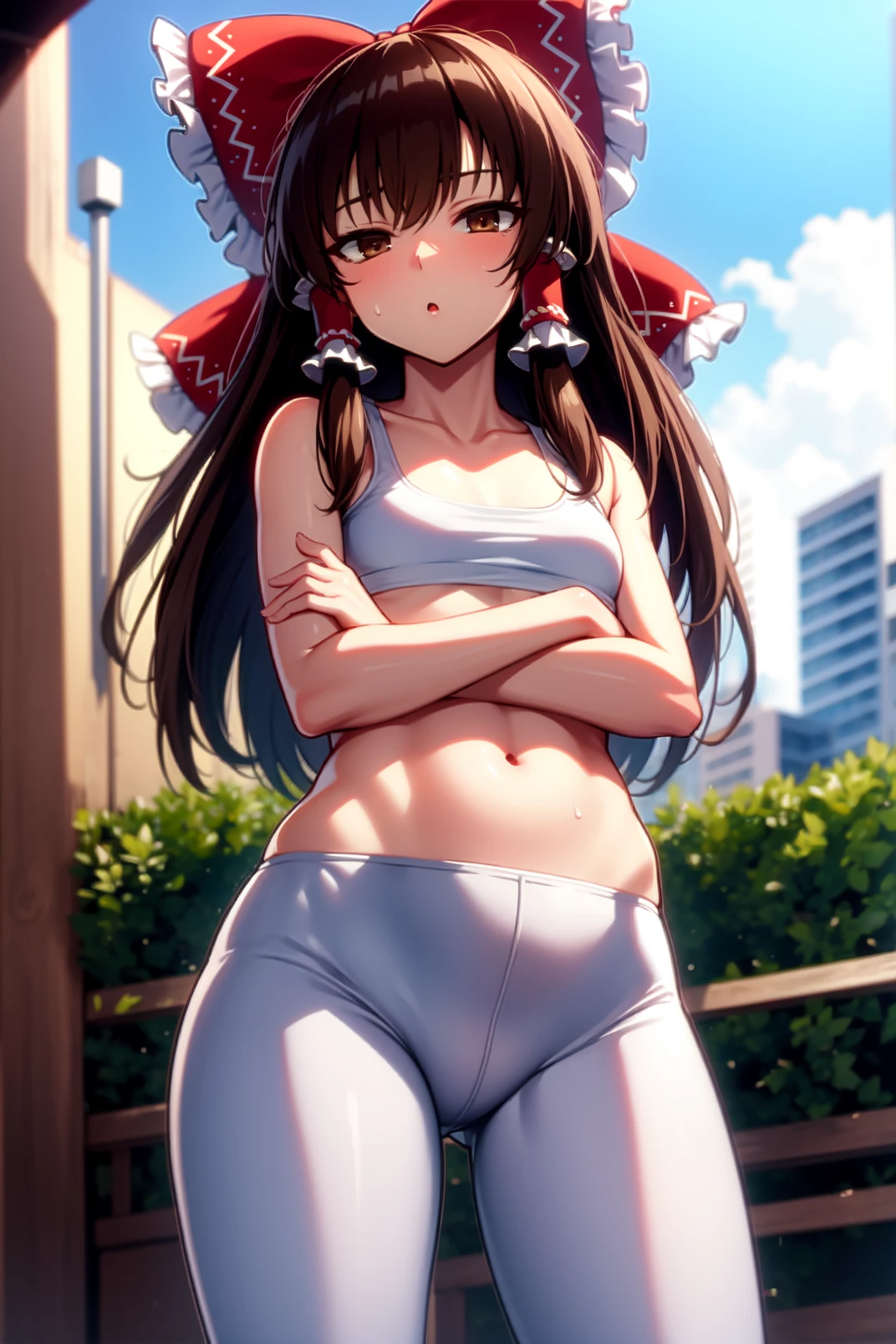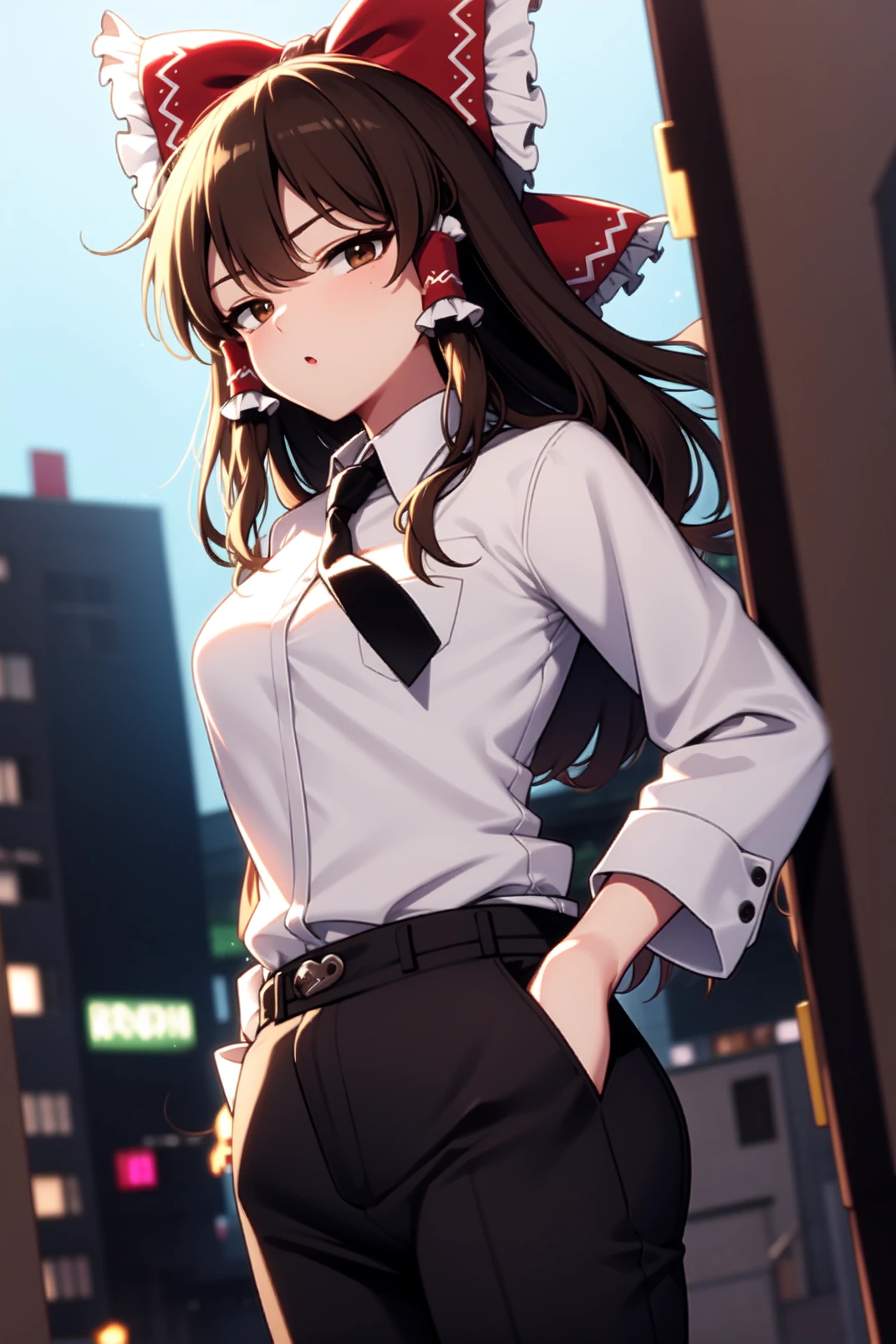 outfit: red hair bow, miko, red shirt, sideboob, detached sleeves, wide sleeves, ribbon-trimmed sleeves, yellow ascot, red skirt, long skirt, frilled skirt, frills, white socks, black shoes