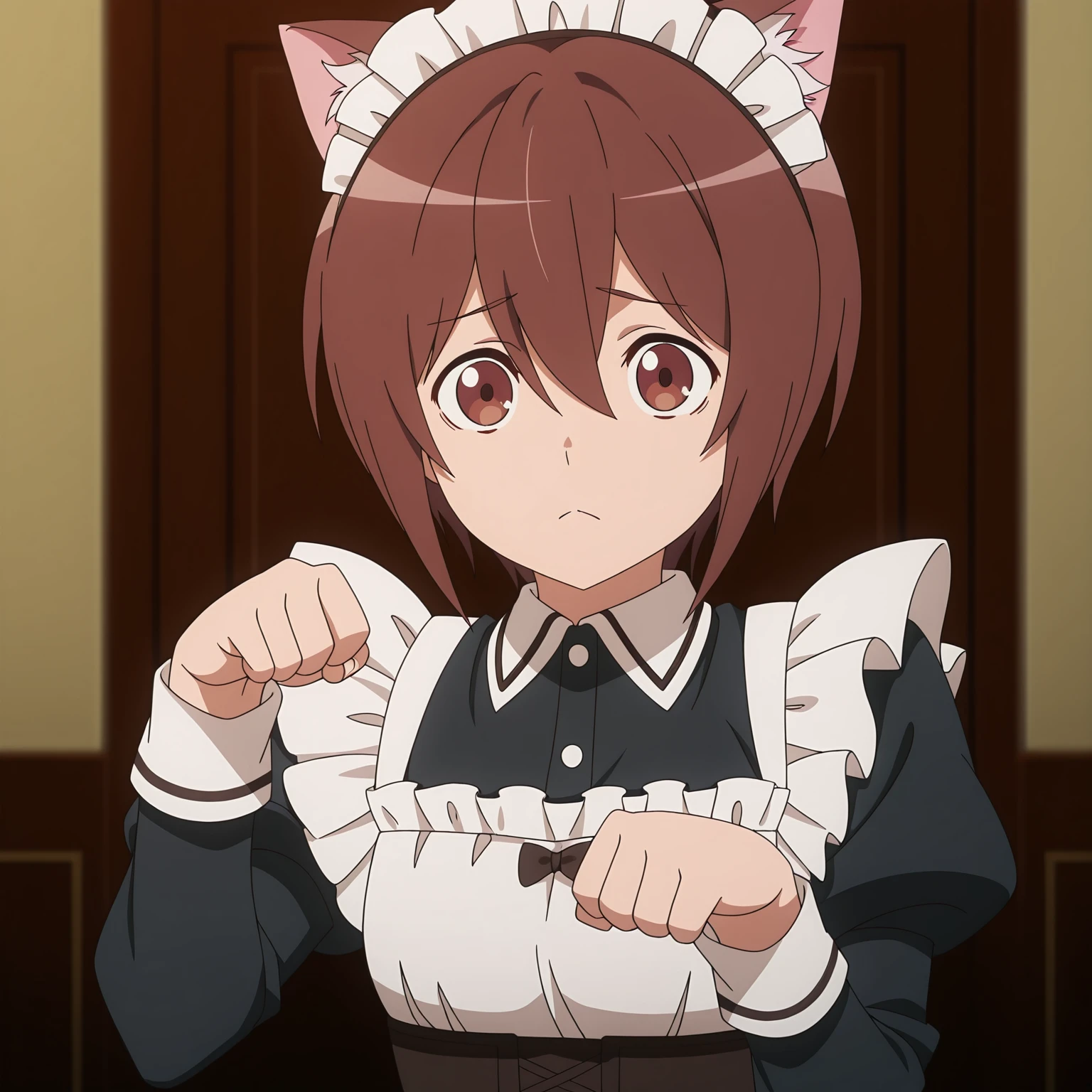 Miyaig, short hair, hair between eyes, brown hair, brown eyes, bangs,, Main Costume: (this is her combat dress used most the time)