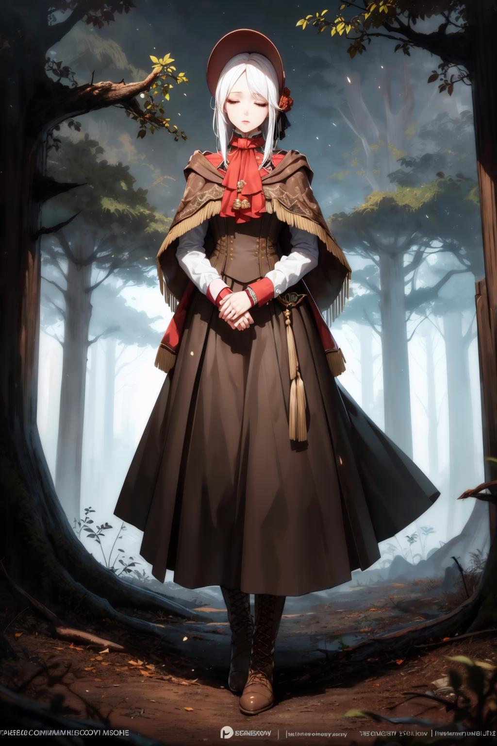 Add "bonnet, brown cloak, long dress, red ascot" for her typical look.