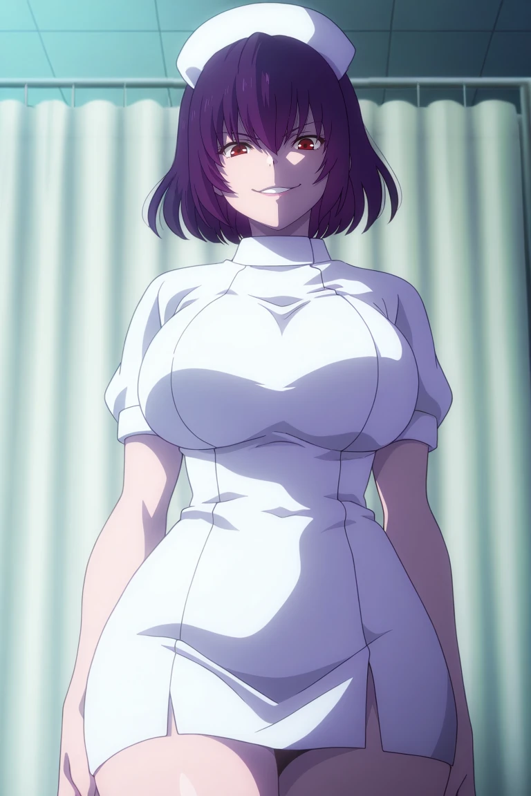 1girl, solo, Kurokawa, purple hair, short hair, red eyes, glossy lips, big breasts, curvy, wide hips, thick thighs, official_style, anime_coloring