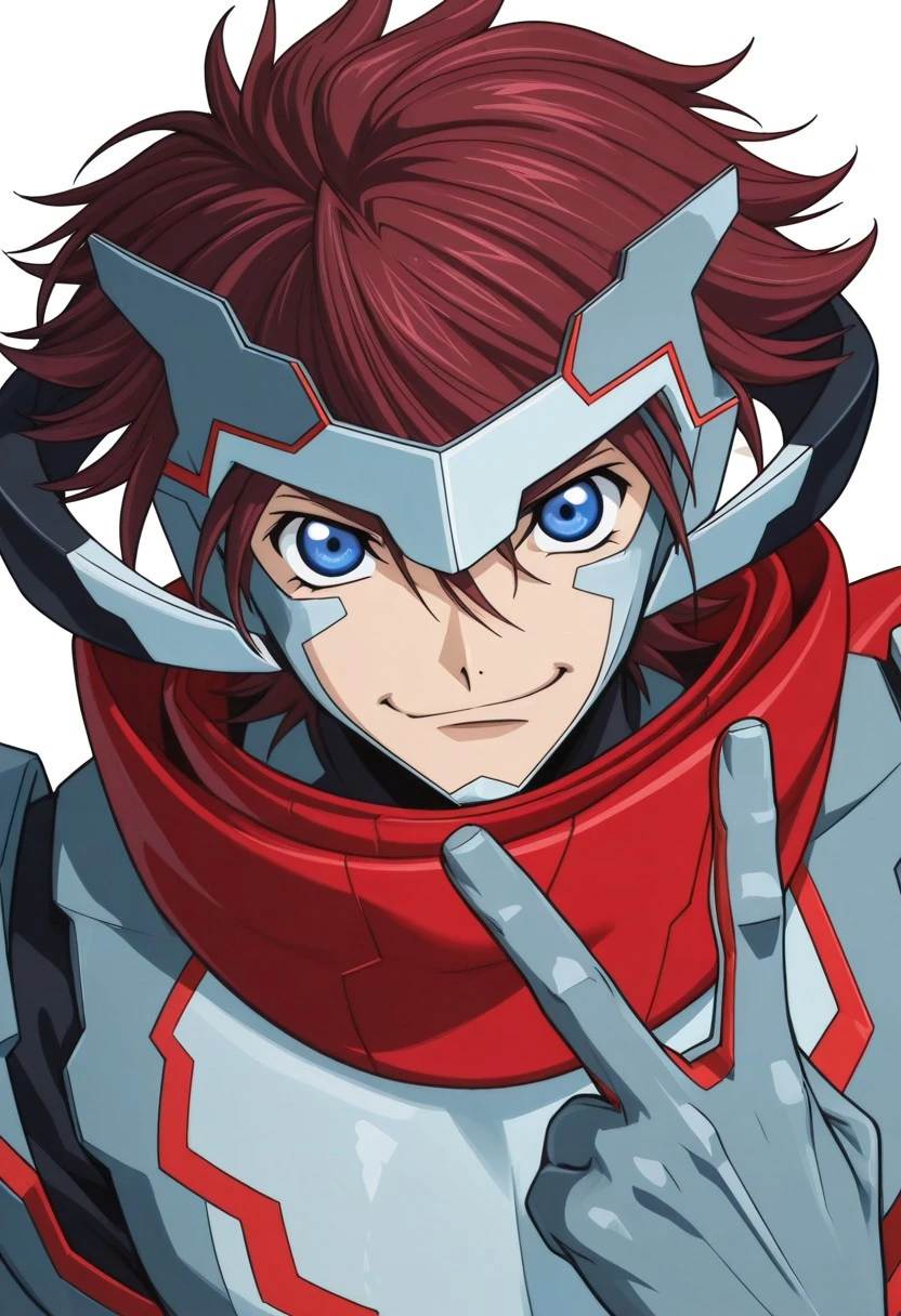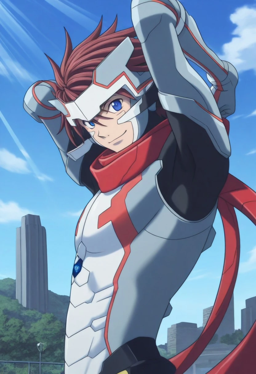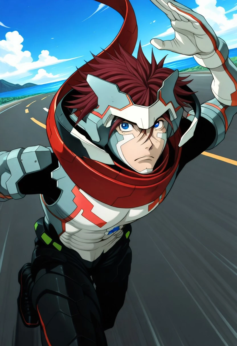 Alma Tandouji, maroon-red hair, blue-indigo eyes, Henshin hero outfit, black , gray and white mecha armor, red accents, headgear, long red scarf, blue chest gem, black mecha legs, black and red shoes