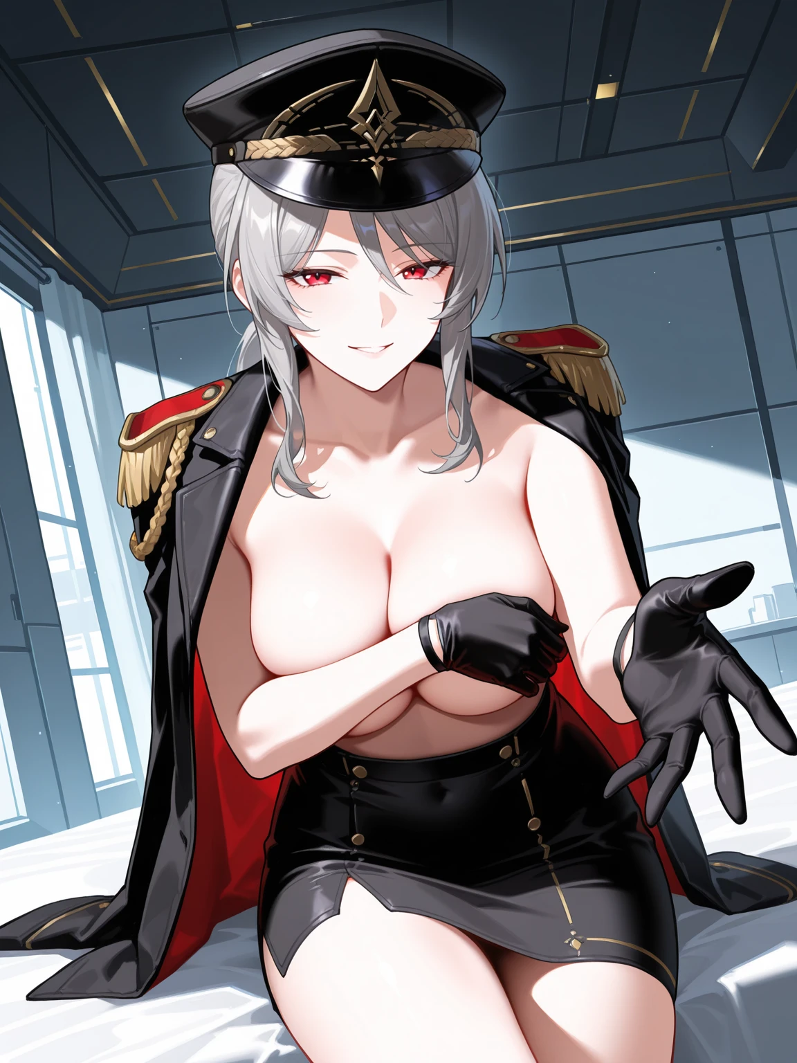 Dawn's Command: dwnnerida, grey hair, long hair, ponytail, red eyes, medium breasts, mature female, white shirt, open shirt, sleeveless shirt, cleavage, sideboob, high waist skirt, black skirt, miniskirt, pencil skirt, side slit, black jacket, jacket on shoulders, black hat, peaked cap, black gloves