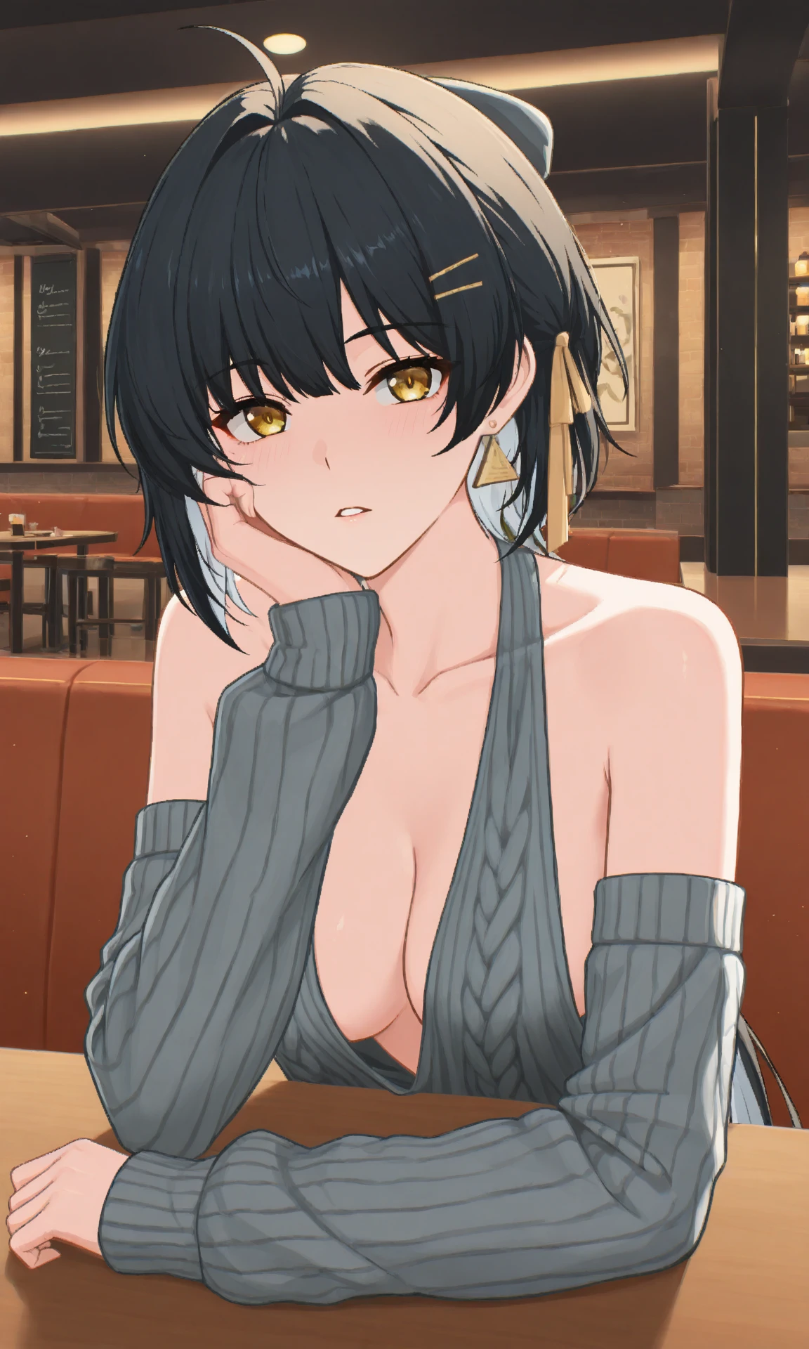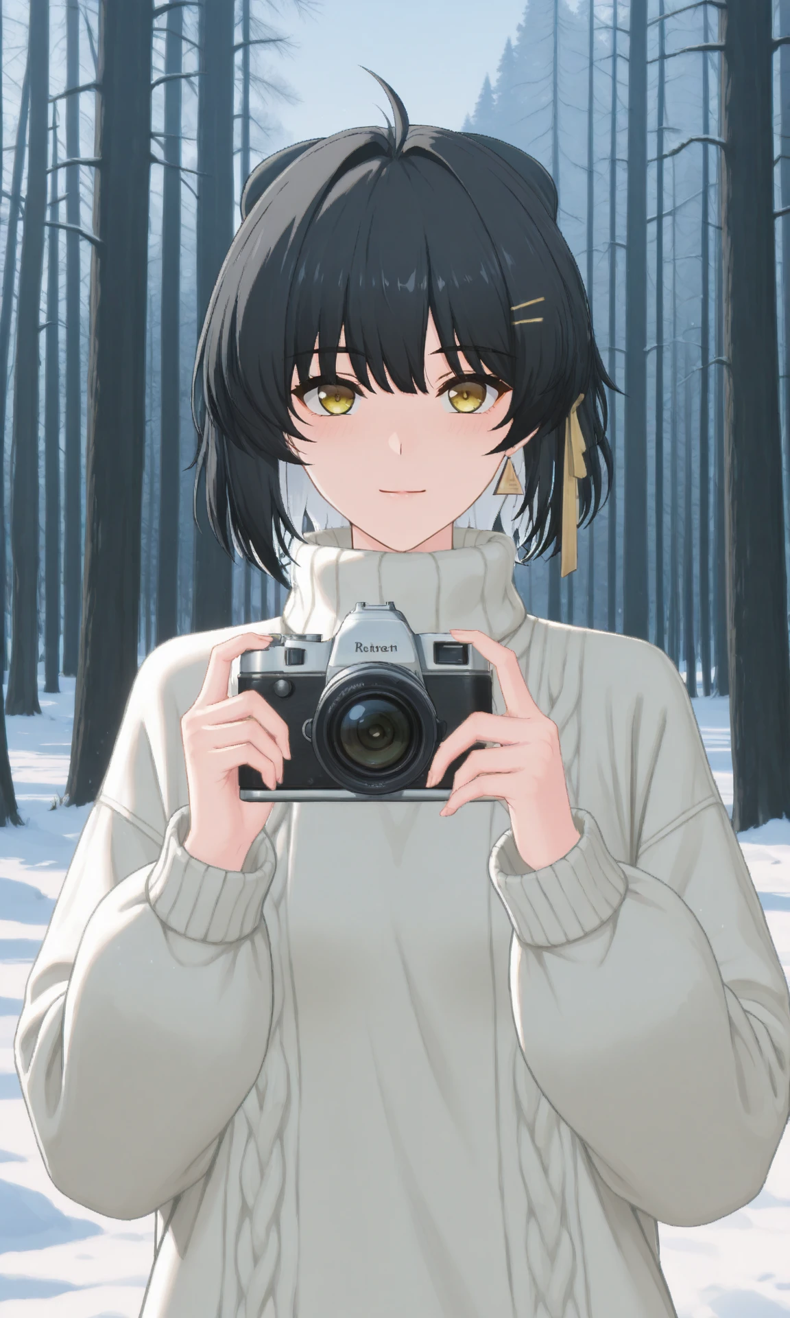 roverfmv, 1girl, solo, black hair, multicolored hair, ponytail, yellow eyes, hairclip, yellow hair ribbon, triangle earrings, hair bow,