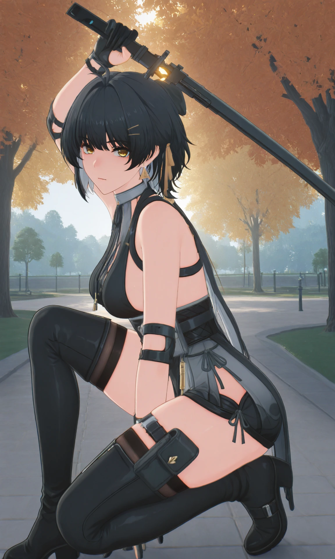 black dress, bare shoulders, shoulder strap, elbow pads, black gloves, partially fingerless gloves, short shorts, thigh strap, thigh pouch, black thighhighs,thigh boots,
