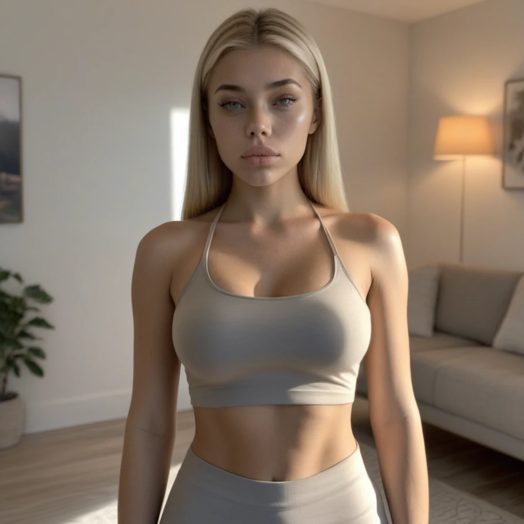 Skin Texture: Hyper-realistic, non-plastic skin with visible pores and a natural glow.