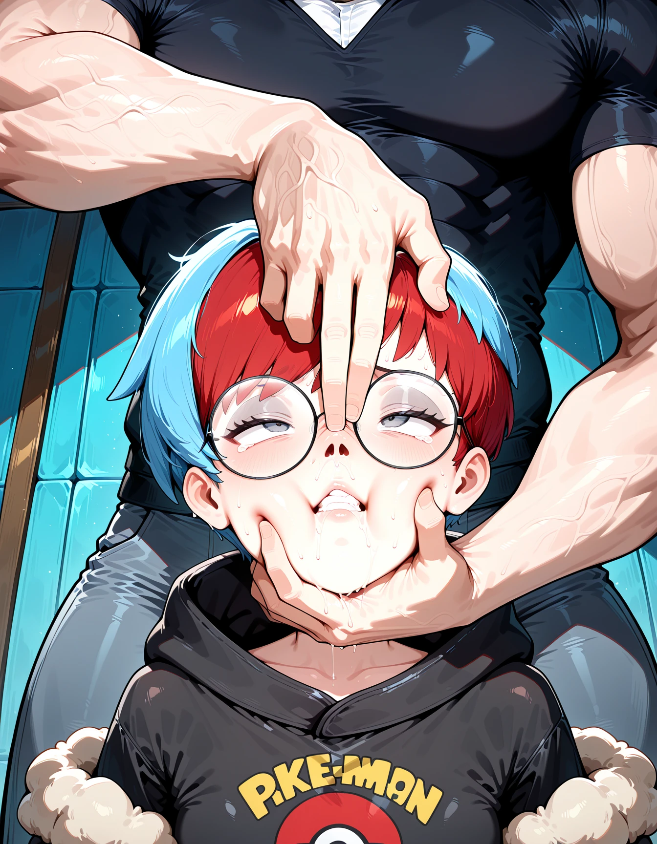 forced p1g nose back, pushing nose up, finger on another's nose, covering forehead, nostrils, male head out of frame, grabbing another's chin, cheek press,