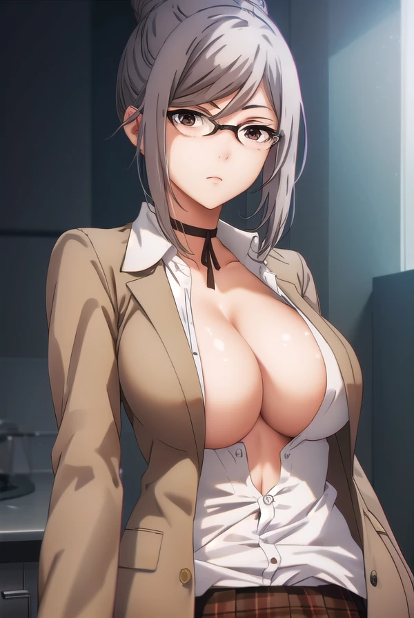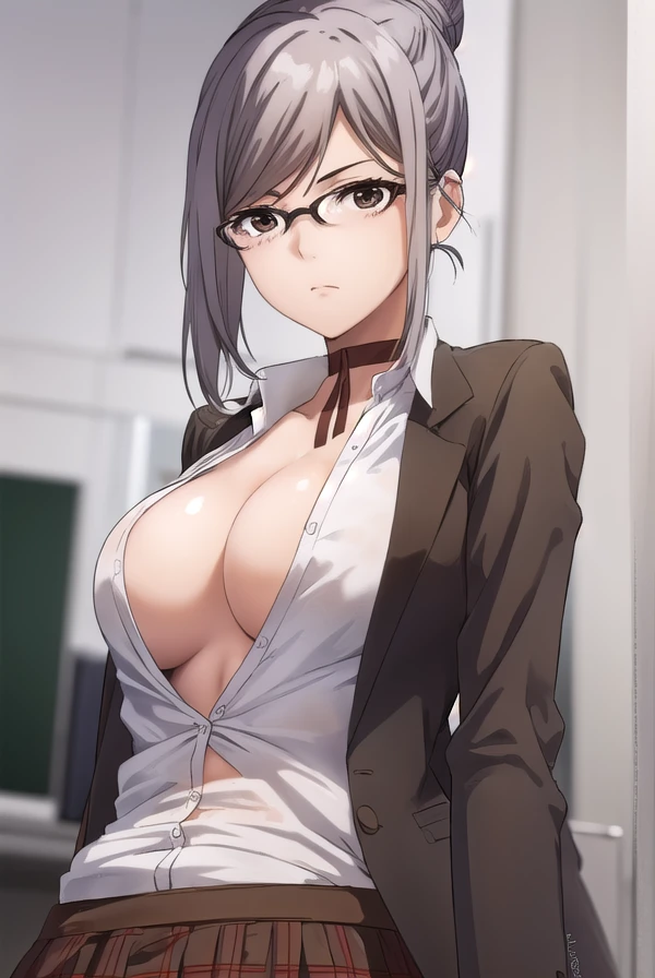 meiko shiraki, grey hair, glasses, hair bun, single hair bun, (brown eyes:1.5),