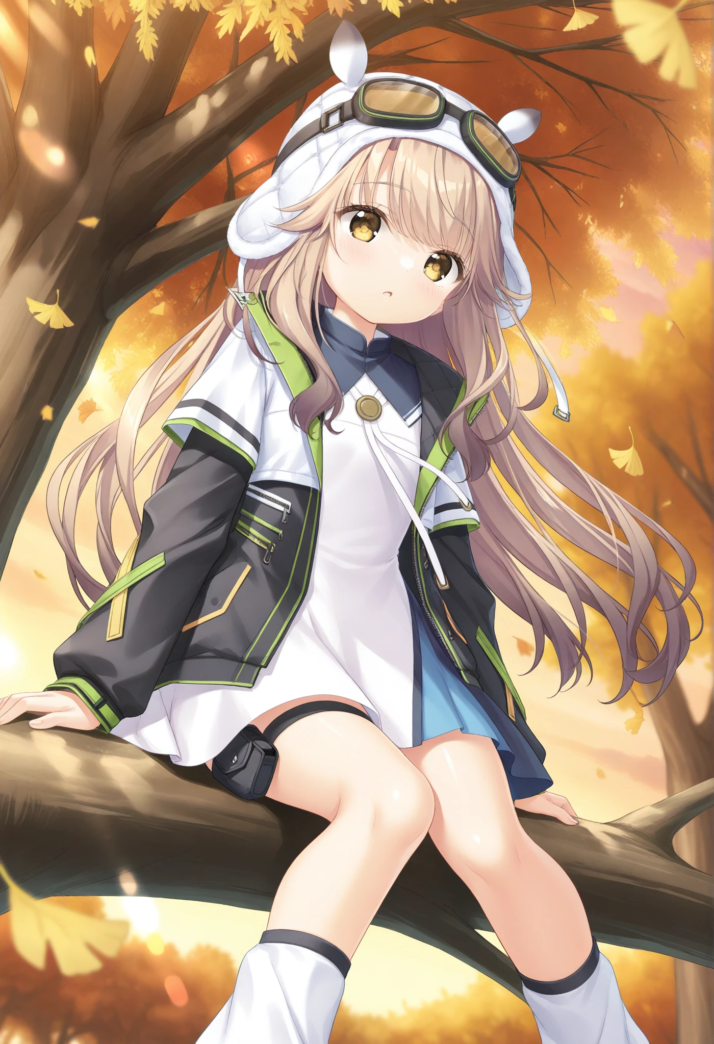 cone hair bun,animal hat,white headwear,goggles on headwear,白色裙子 (white dress)