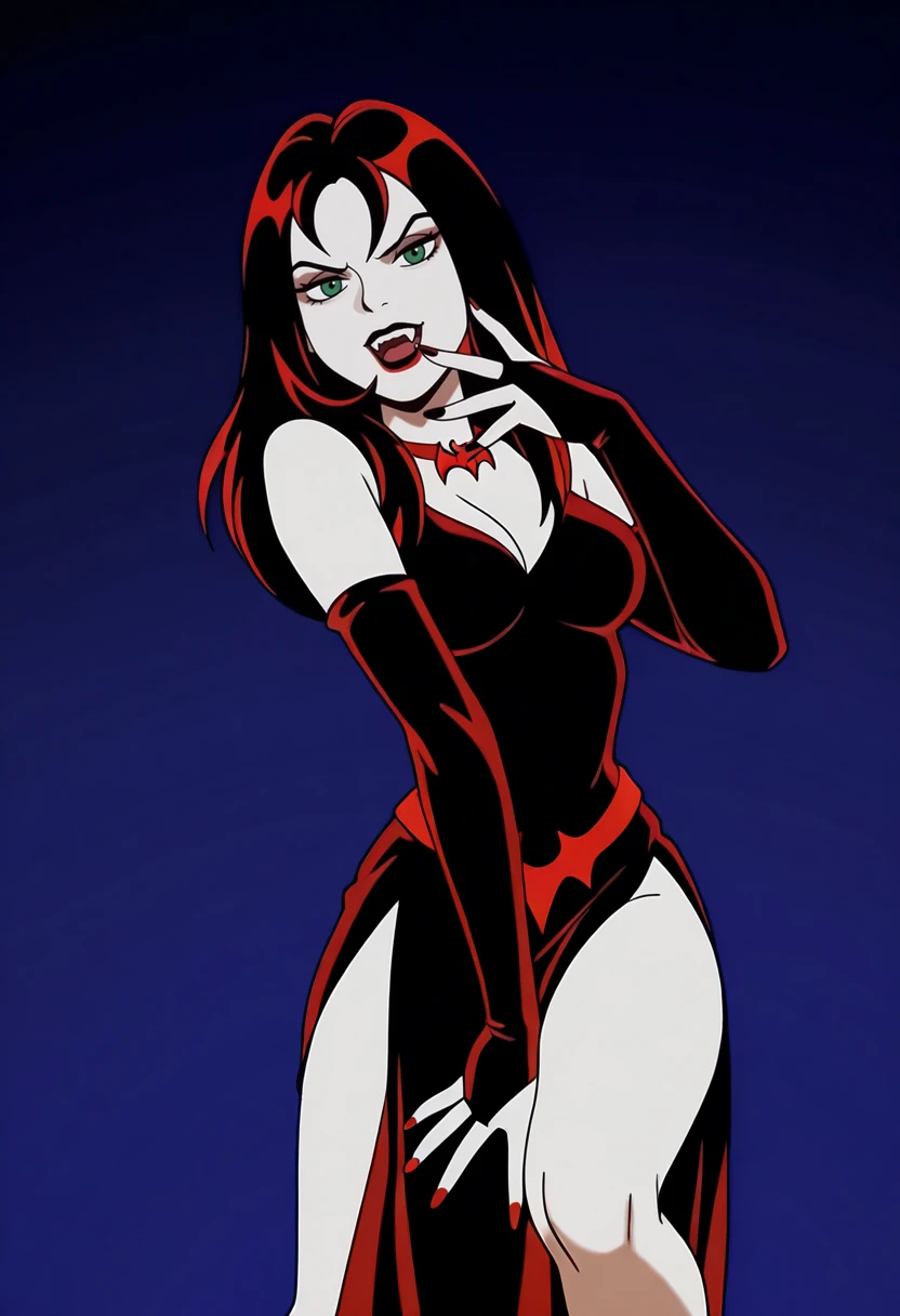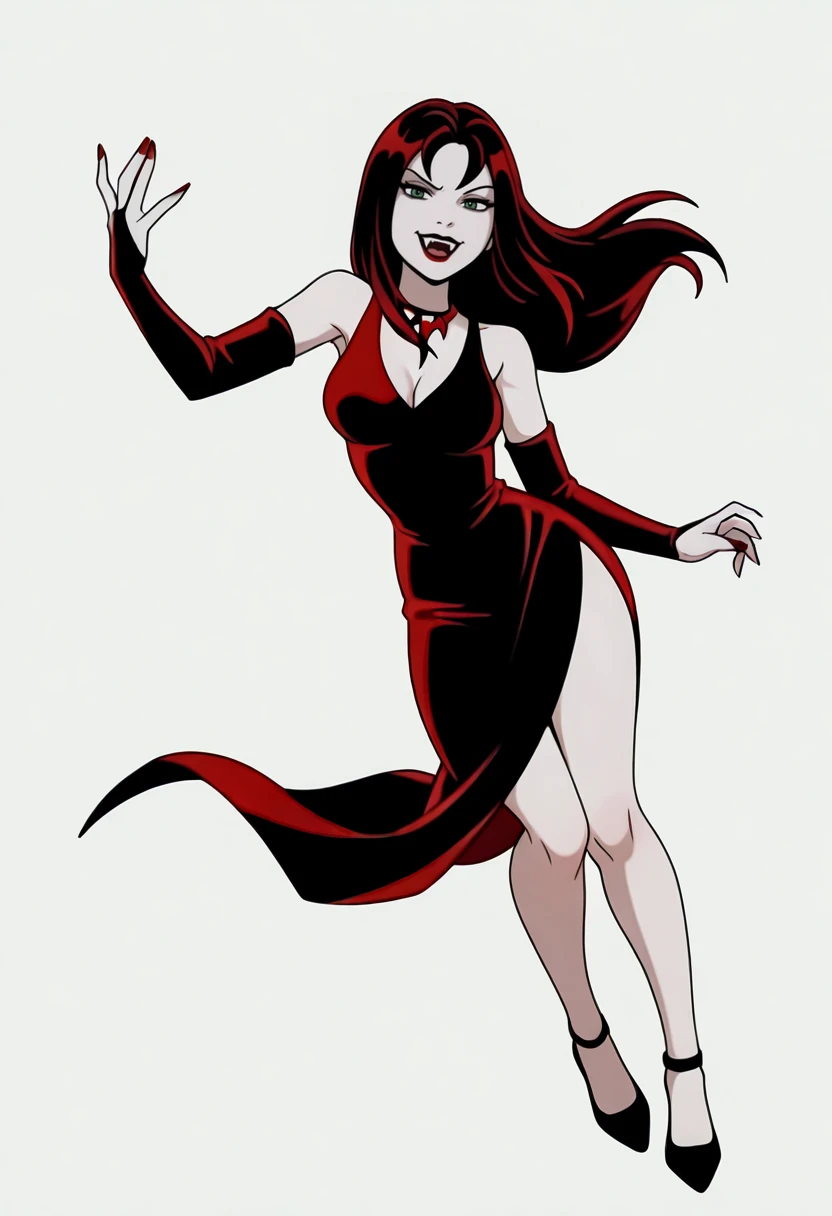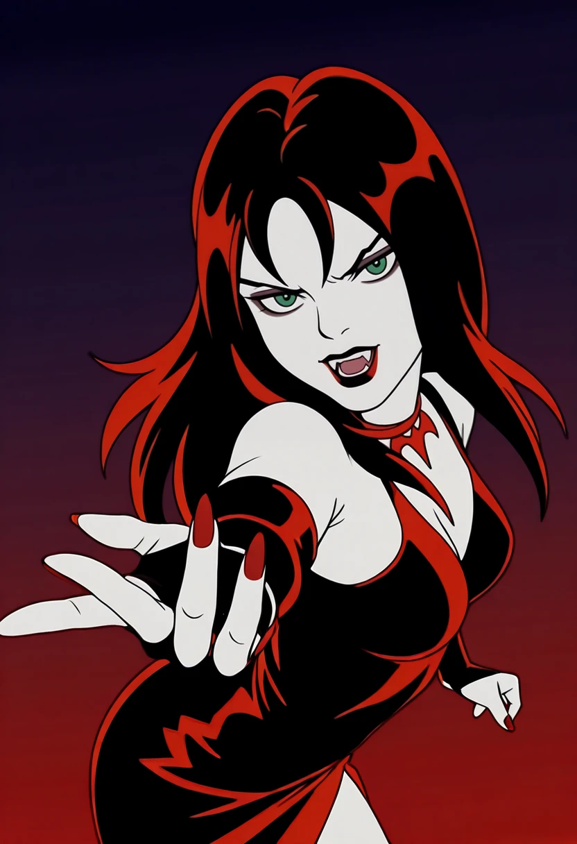 Base Appearance: yds@lly, 1girl, solo, pale skin, dark red lipstick, green eyes, bangs, long hair, dark red hair, vampire teeth, red nail polish