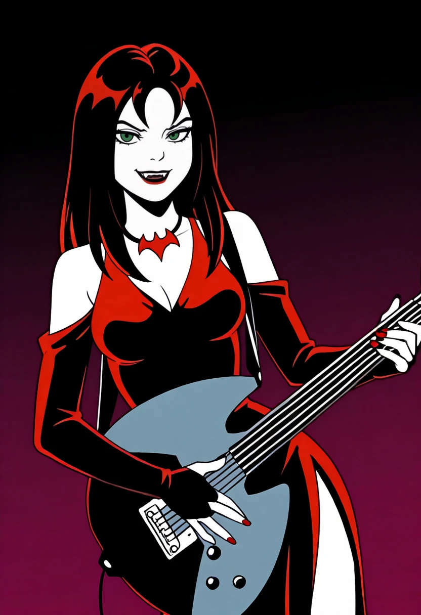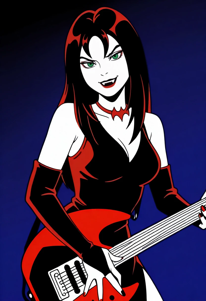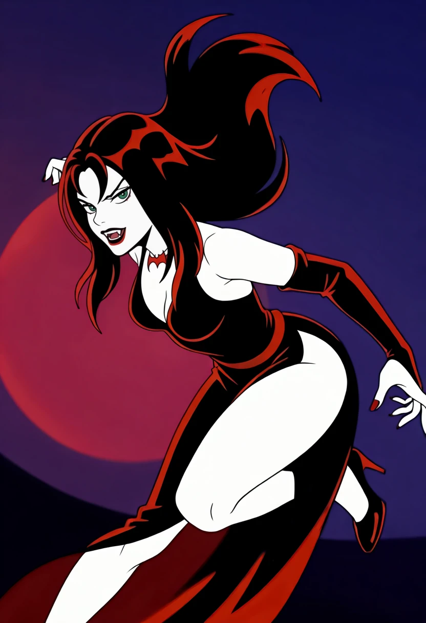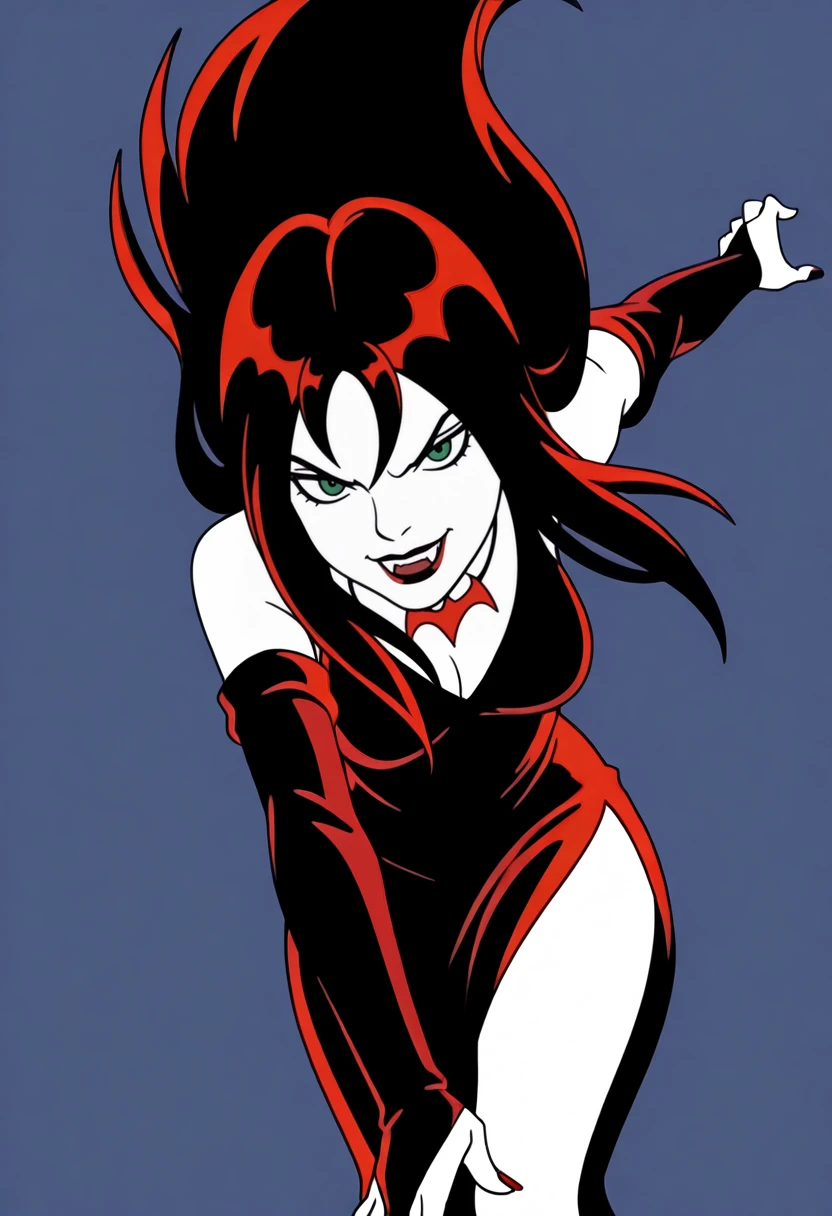 Base Appearance: yds@lly, 1girl, solo, pale skin, dark red lipstick, green eyes, bangs, long hair, dark red hair, vampire teeth, red nail polish