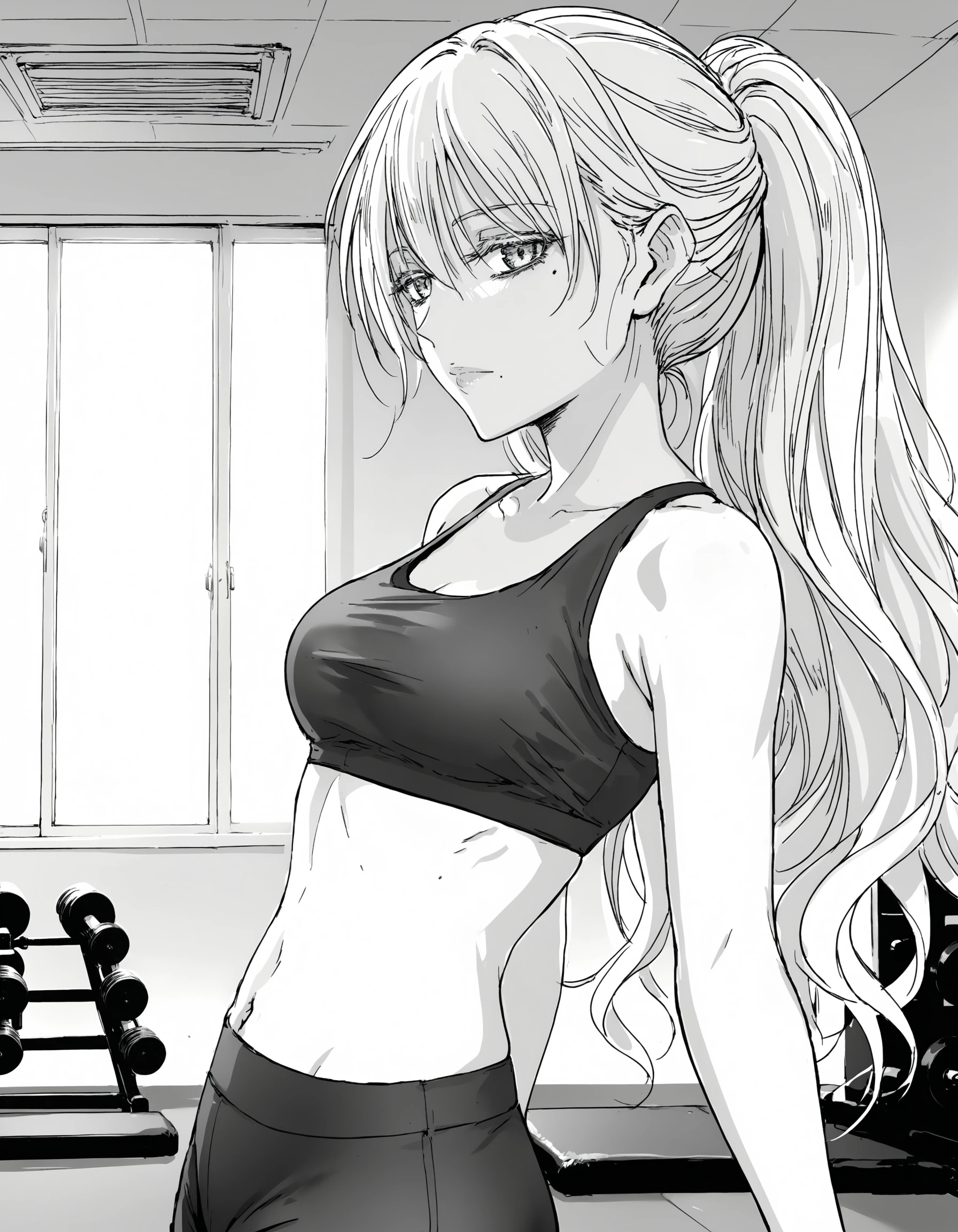 Sportswear - ponytail, sports bra, navel, yoga pants