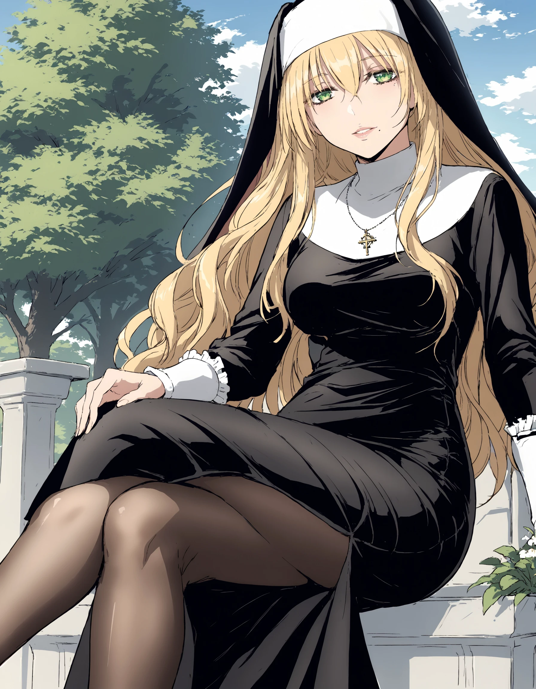 Nun (Color) - cross necklace, nun, habit, black veil, white coif, black dress, long sleeves, frilled sleeves, side slit, black pantyhose