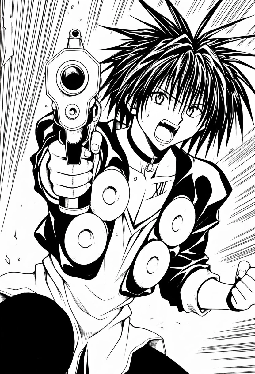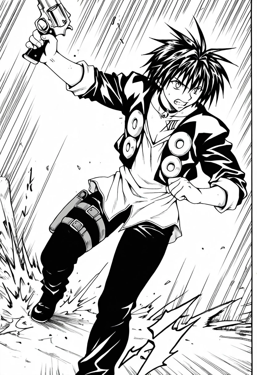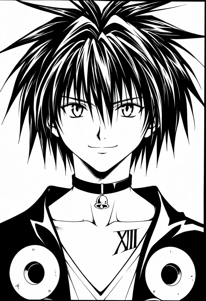 colorless manga style, black and white manga ink art style, greyscale, monochrome, Train Heartnet, black hair, white-black eyes, black bell collar, XIII collarbone tattoo, cropped , white untucked undershirt, v-neck outfit, rolled sleeves, black pants, leg gun holster