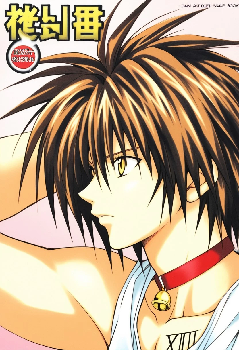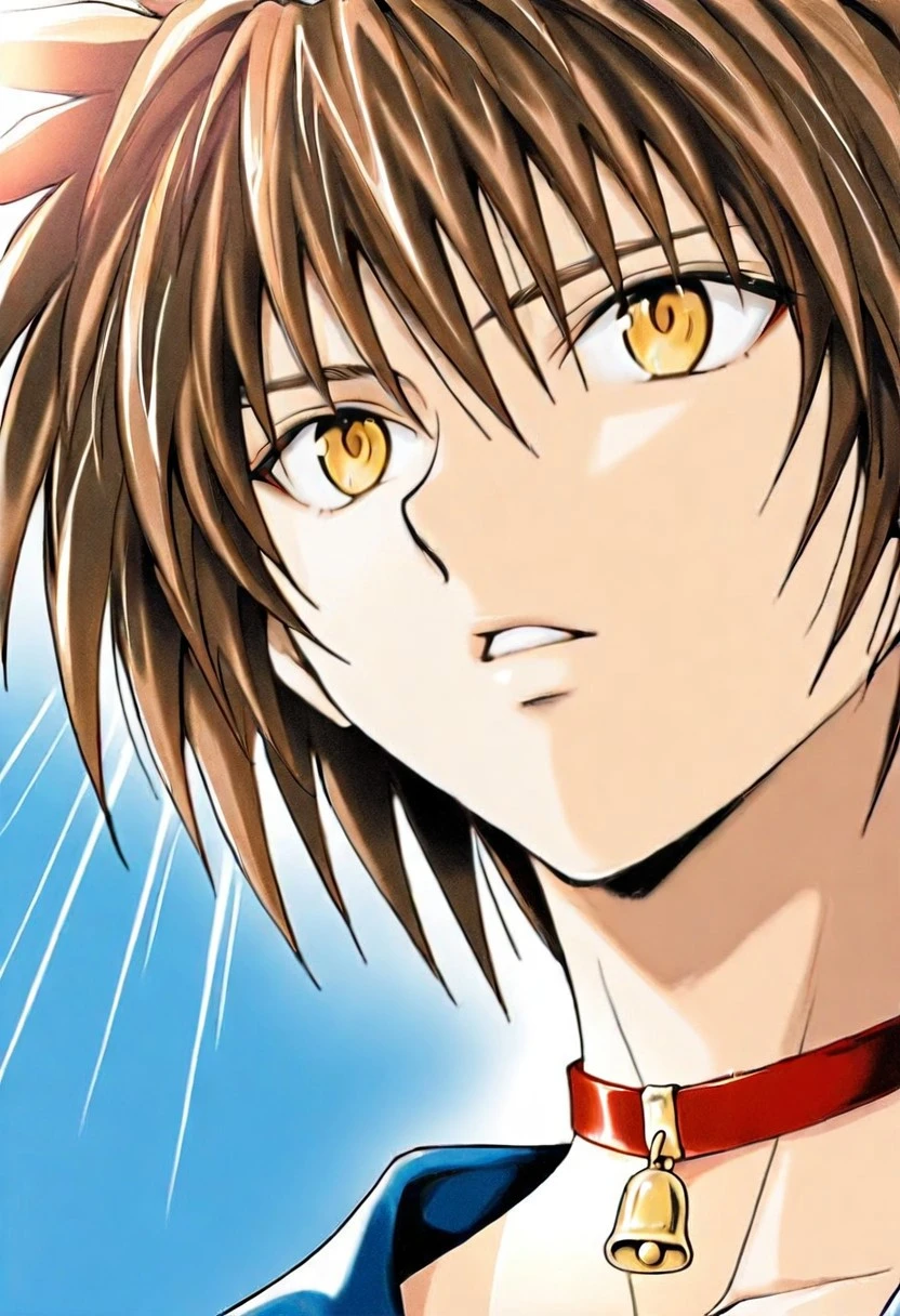 Train Heartnet, brown hair, gold eyes, red bell collar, XIII collarbone tattoo, blue cropped , white untucked undershirt, v-neck outfit, rolled sleeves, blue pants, leg gun holster