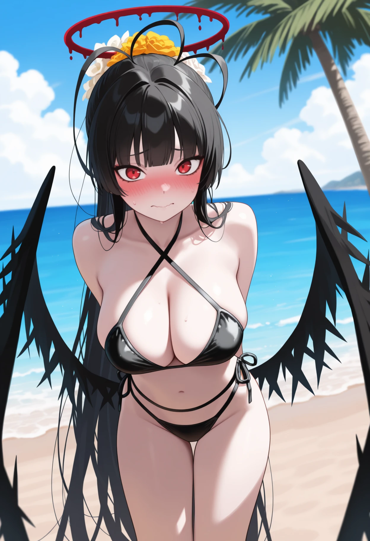 Swimsuit: tsrgswim, black wings, low wings, long hair, black hair, antenna hair, ponytail, hair flower, red halo, red eyes, black bikini, criss-cross halter, side-tie bikini bottom, cleavage